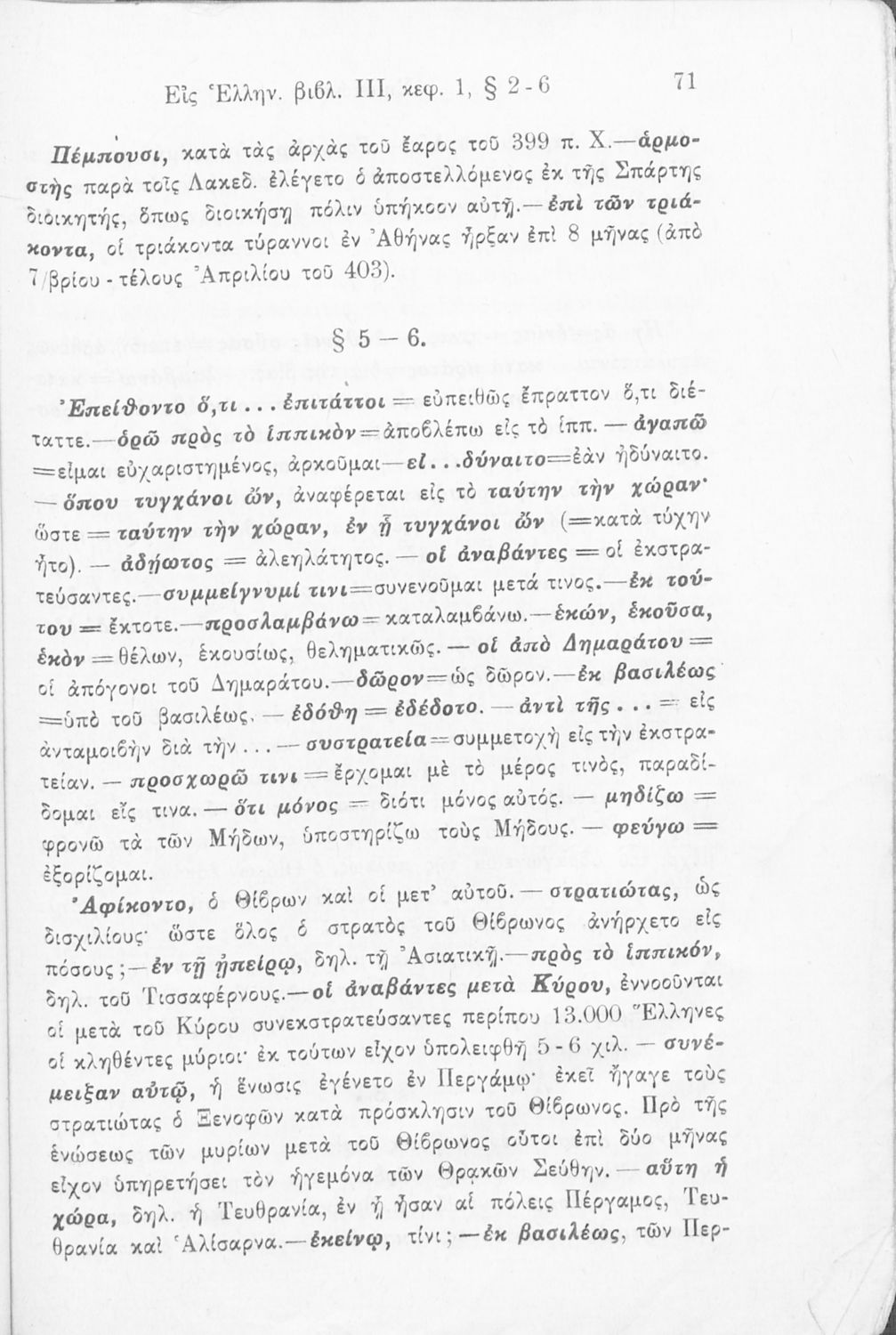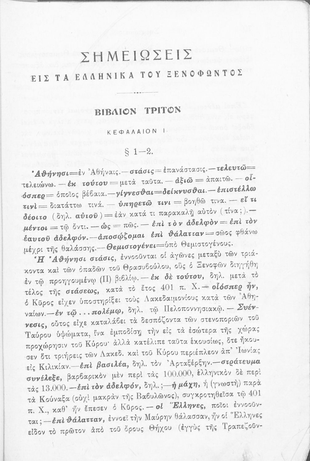 Σχολικό εγχειρίδιο Αρχαίων Ελληνικών για τις Γ΄ Ελληνικού Σχολείου και Α΄ Αστικού Σχολείου Θηλέων που περιλαμβάνει το έργο του Ξενοφώντα Κύρου Ανάβασις, ερμηνευτικά και πραγματολογικά σχόλια και λεξιλογικές ...