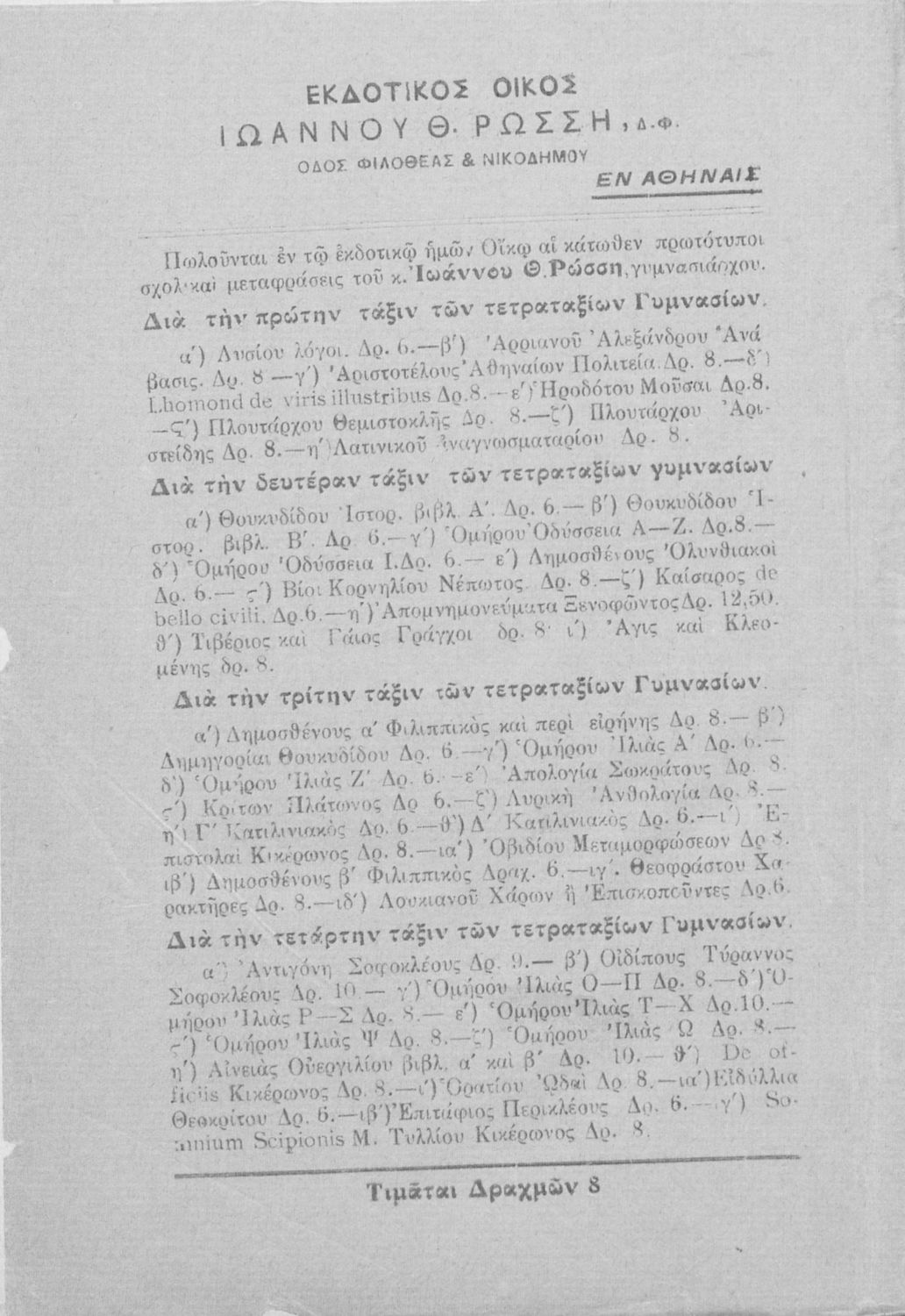 Εκδότης: Ιωάννης Θ. Ρώσσης Έτος έκδοσης: 1927 Τόπος έκδοσης: Αθήνα |