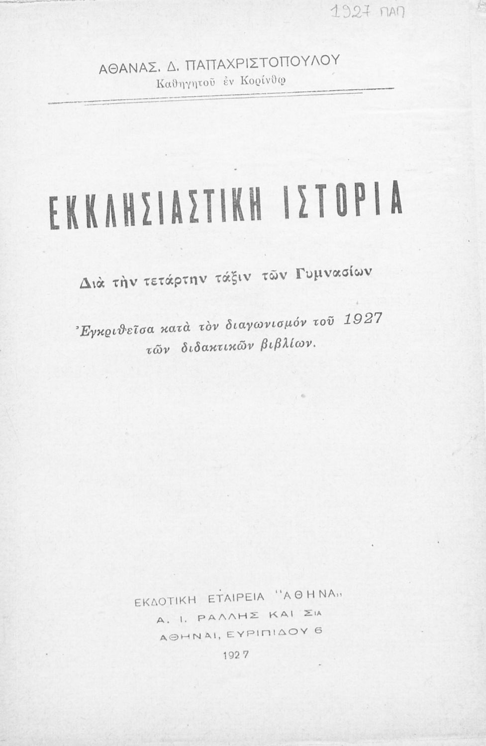 Εκδότης: Α.Ι. Ράλλης και ΣΙΑ Έτος έκδοσης: 1927 Τόπος έκδοσης: Αθήνα Υπουργική απόφαση / Σύμβαση: 20999/10-6-1927 Έτος έγκρισης: 1927 |