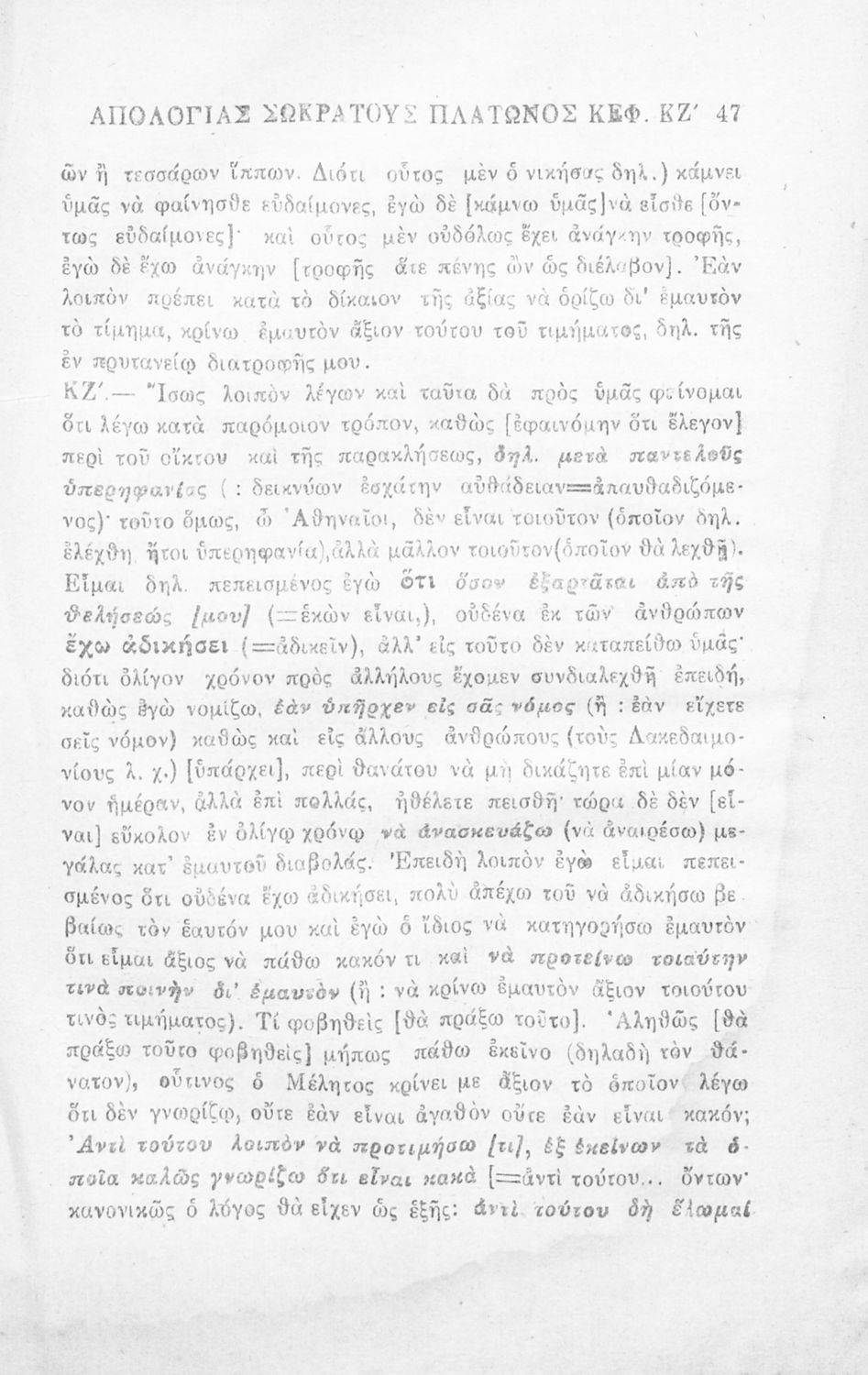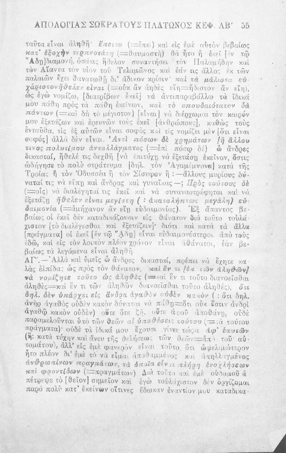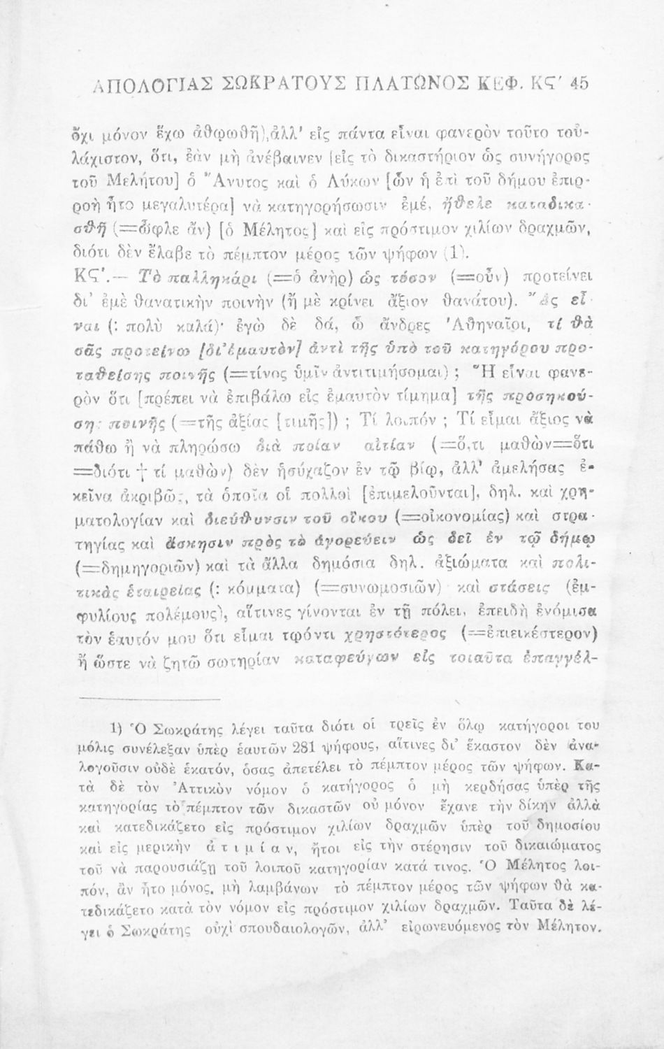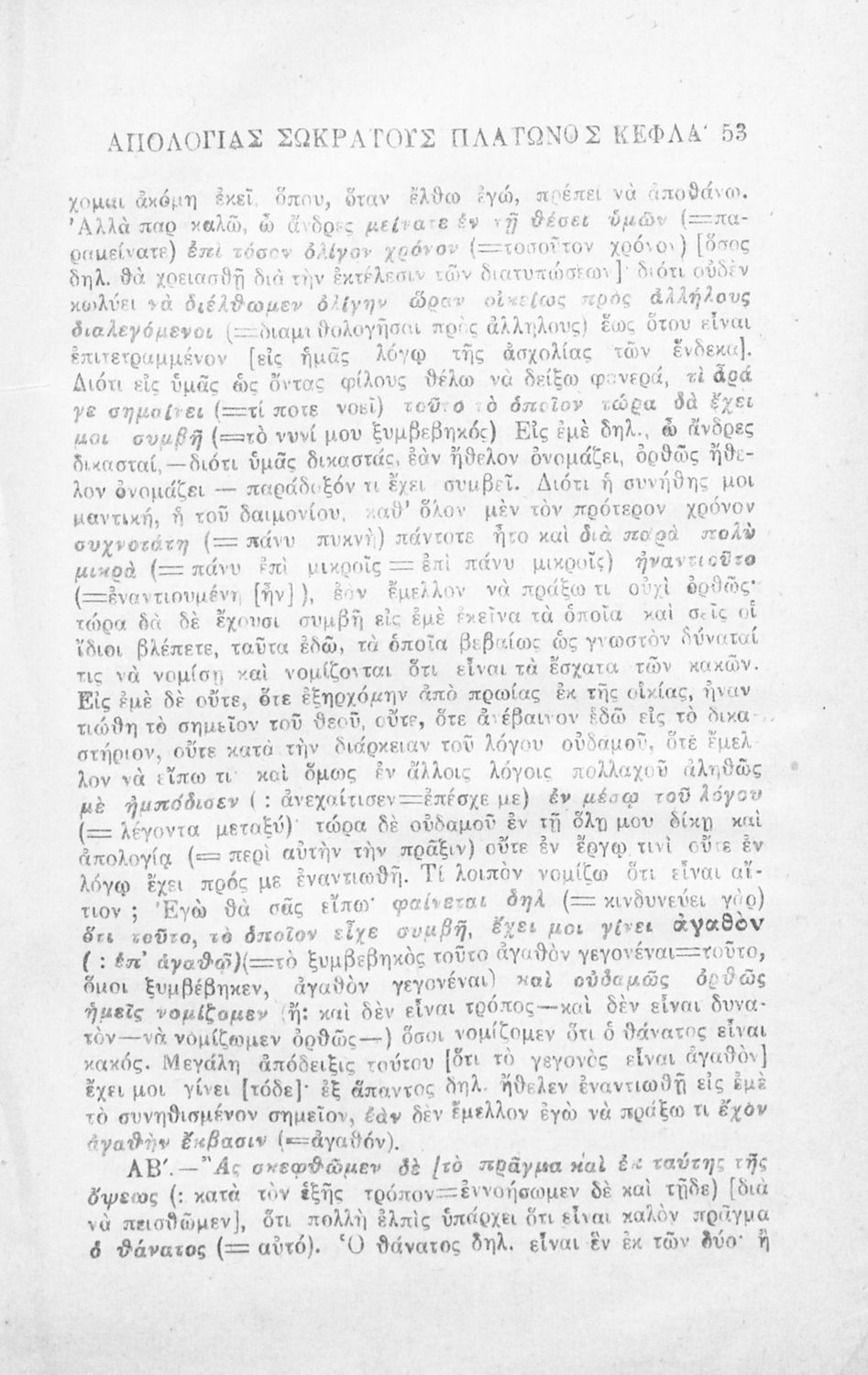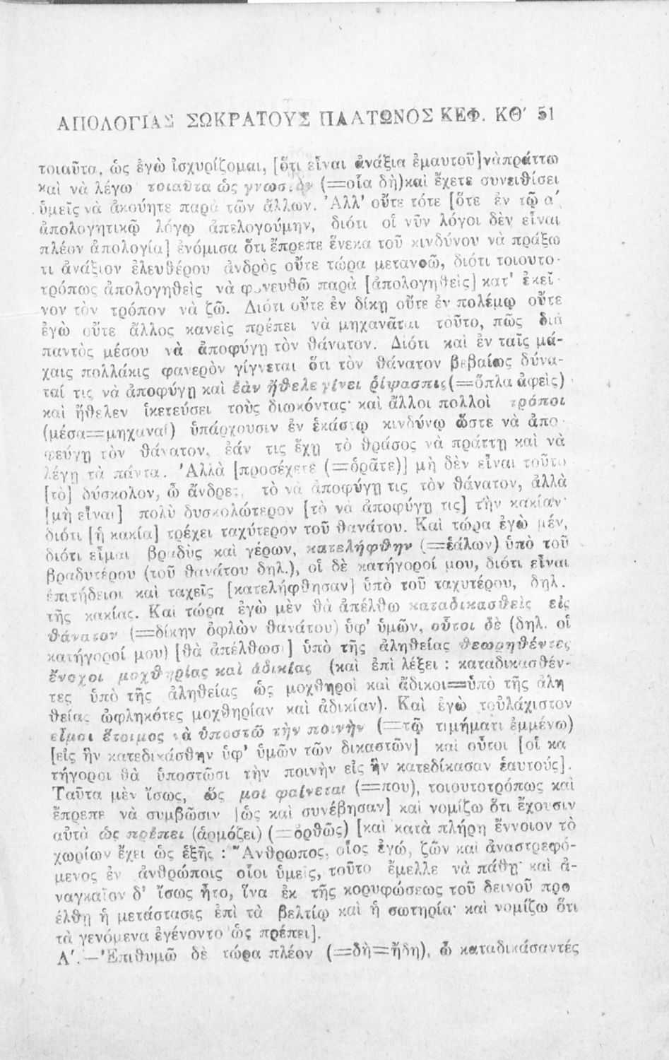 Μαθητικό βοήθημα Αρχαίων Ελληνικών της Γ΄ τάξης των τετρατάξιων Γυμνασίων. Το βιβλίο περιέχει σε μετάφραση το έργο του Πλάτωνα Απολογία του Σωκράτη.