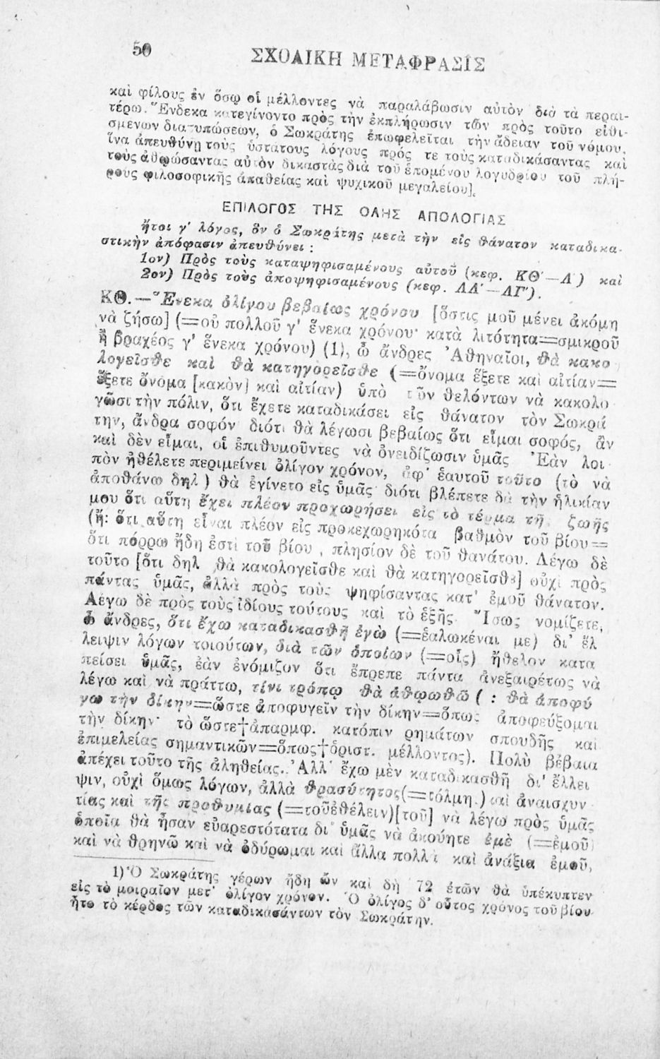 Τίτλος: Σχολική μετάφρασις απολογίας Σωκράτους Πλάτωνος, προς χρήσιν των μαθητών της τρίτης τάξεως των τετραταξίων Γυμνασίων και της αντιστοίχου τάξεως των λοιπών σχολείων και της Μέσης Εκπαιδεύσεως