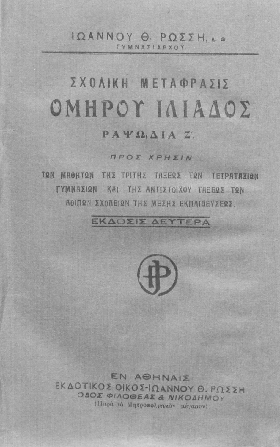 Κωδικός αναγνώρισης: 02-01717 Τίτλος: Σχολική μετάφρασις Ομήρου Ιλιάδος, ραψωδία Α΄, προς χρήσιν της τρίτης τάξεως των τετραταξίων Γυμνασίων και της αντιστοίχου τάξεως των λοιπών σχολείων της Μ. Εκπαιδεύσεως Συγγραφέας: Ιωάννης Θ. Ρώσσης (μετάφραση) Μέγεθος και υπόστρωμα: Μαθητικό βοήθημα, μαλακό εξώφυλλο, 34 σελίδες. |