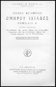Κωδικός αναγνώρισης: 02-01717 Τίτλος: Σχολική μετάφρασις Ομήρου Ιλιάδος, ραψωδία Α΄, προς χρήσιν της τρίτης τάξεως των τετραταξίων Γυμνασίων και της αντιστοίχου τάξεως των λοιπών σχολείων της Μ. Εκπαιδεύσεως Συγγραφέας: Ιωάννης Θ. Ρώσσης (μετάφραση) Μέγεθος και υπόστρωμα: Μαθητικό βοήθημα, μαλακό εξώφυλλο, 34 σελίδες. |