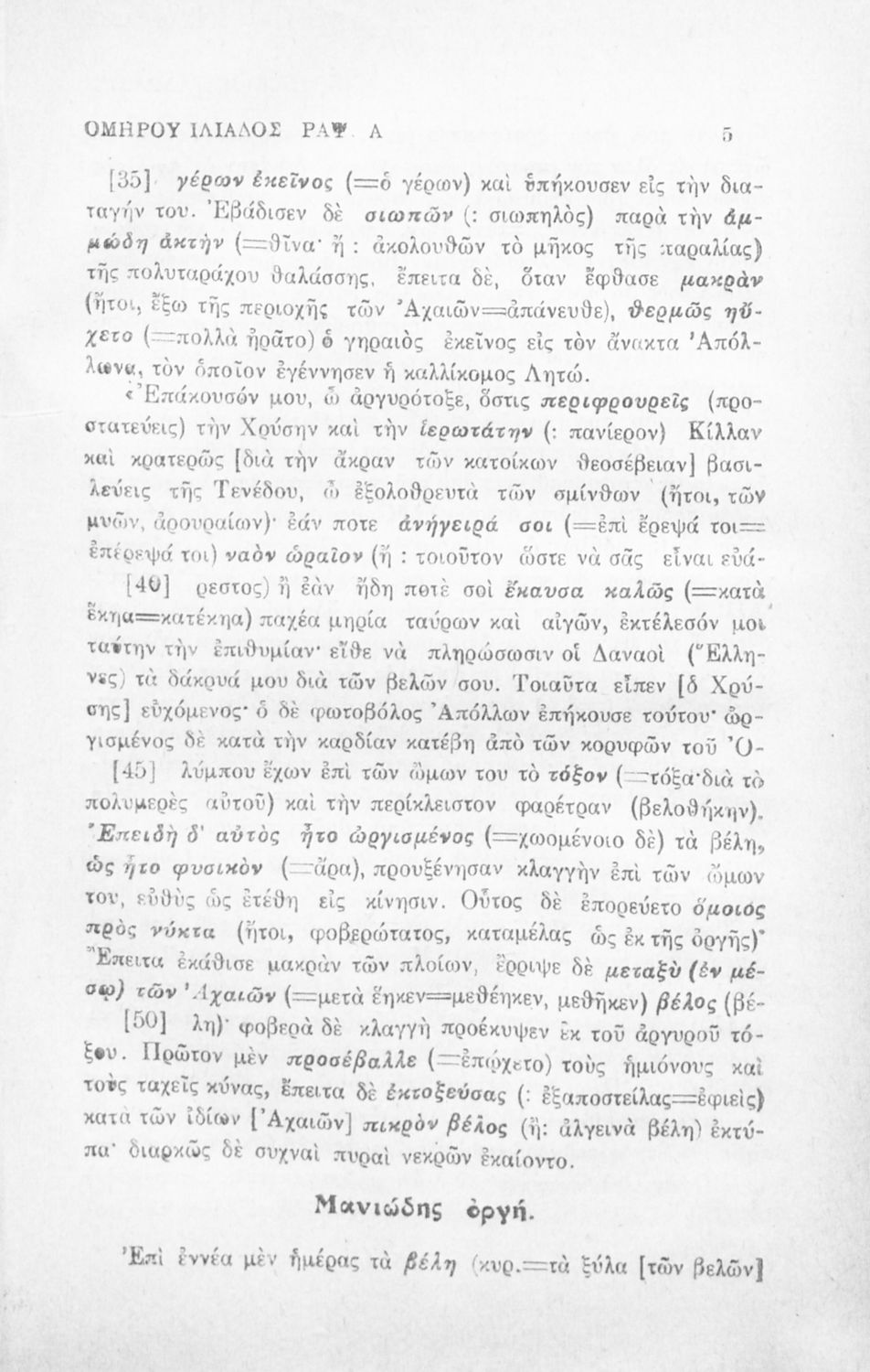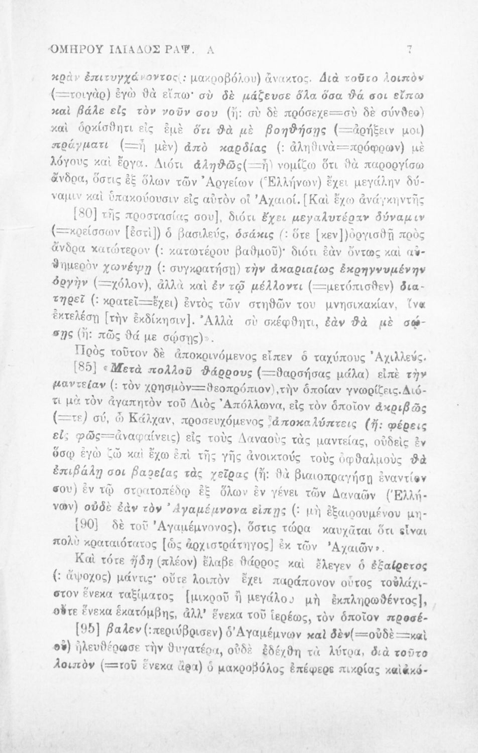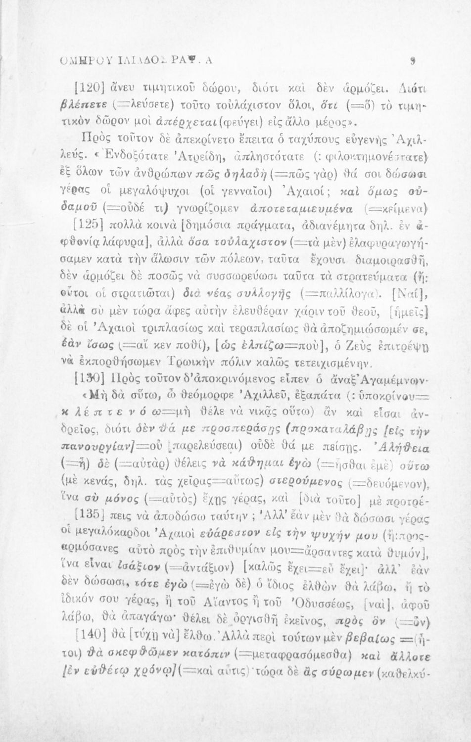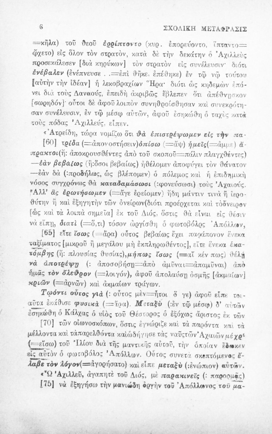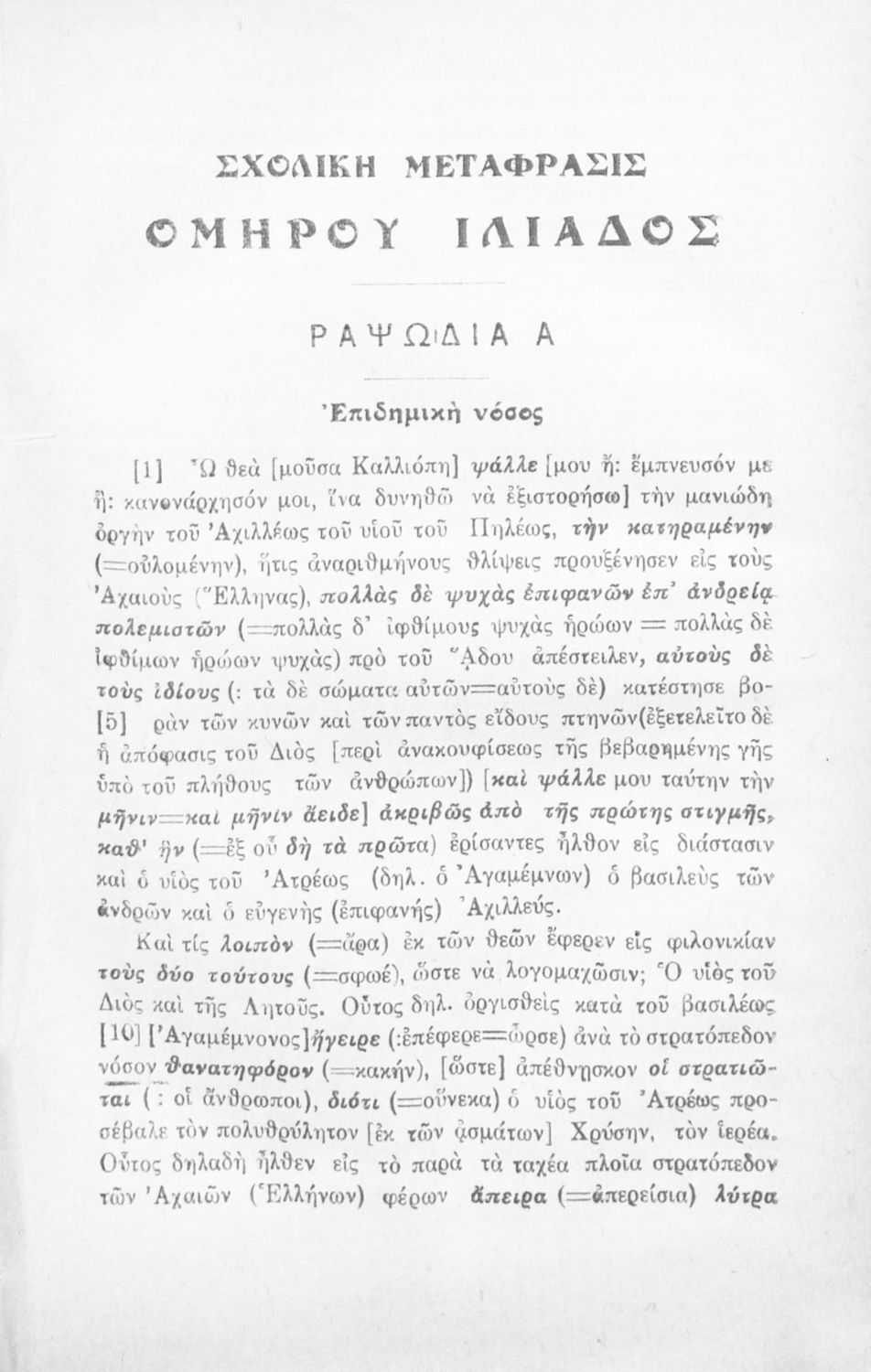 Μαθητικό βοήθημα Αρχαίων Ελληνικών της Γ΄ τάξης των τετρατάξιων Γυμνασίων το οποίο περιέχει σε μετάφραση τη ραψωδία Α΄ από την 'Ιλιάδα' του Ομήρου.