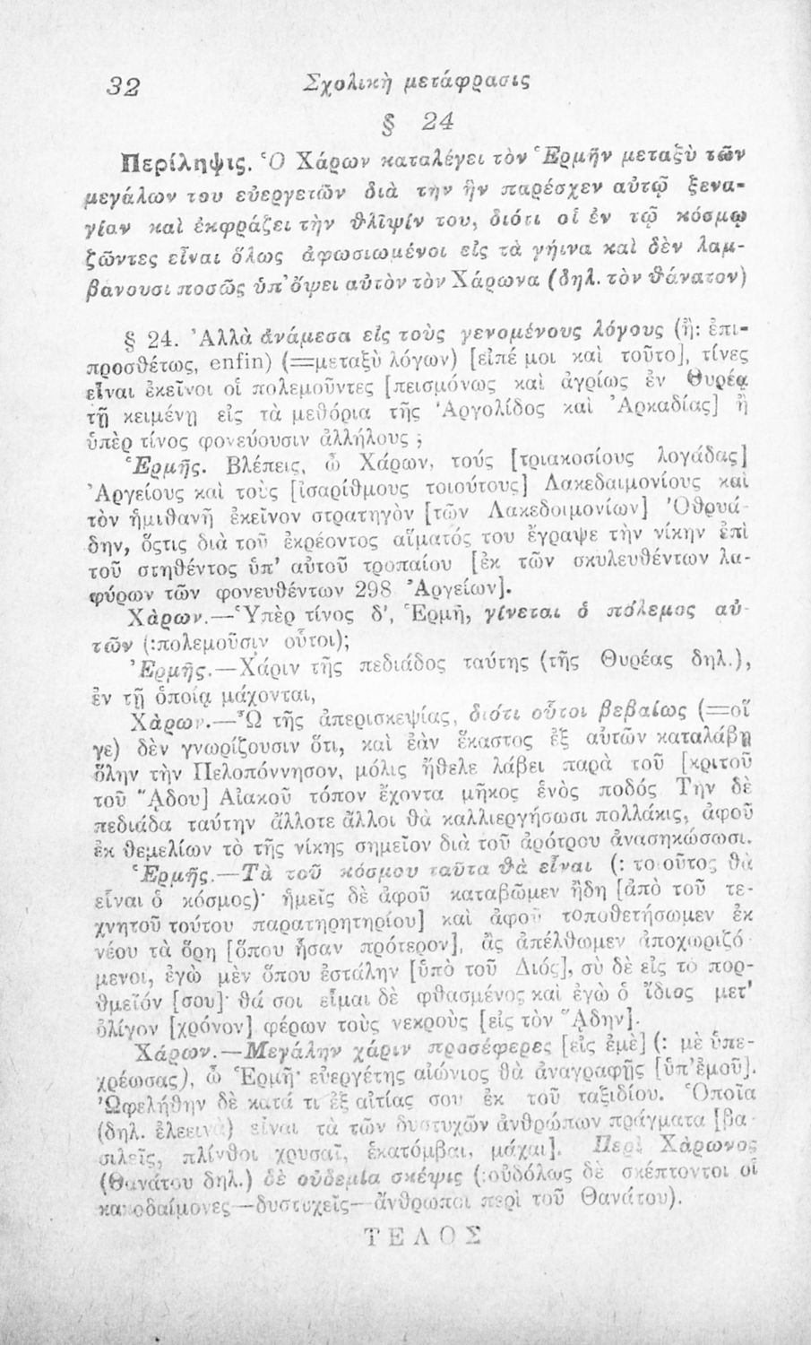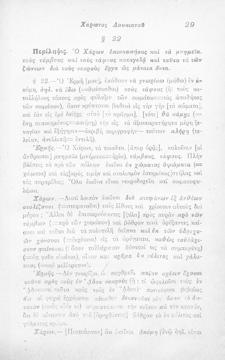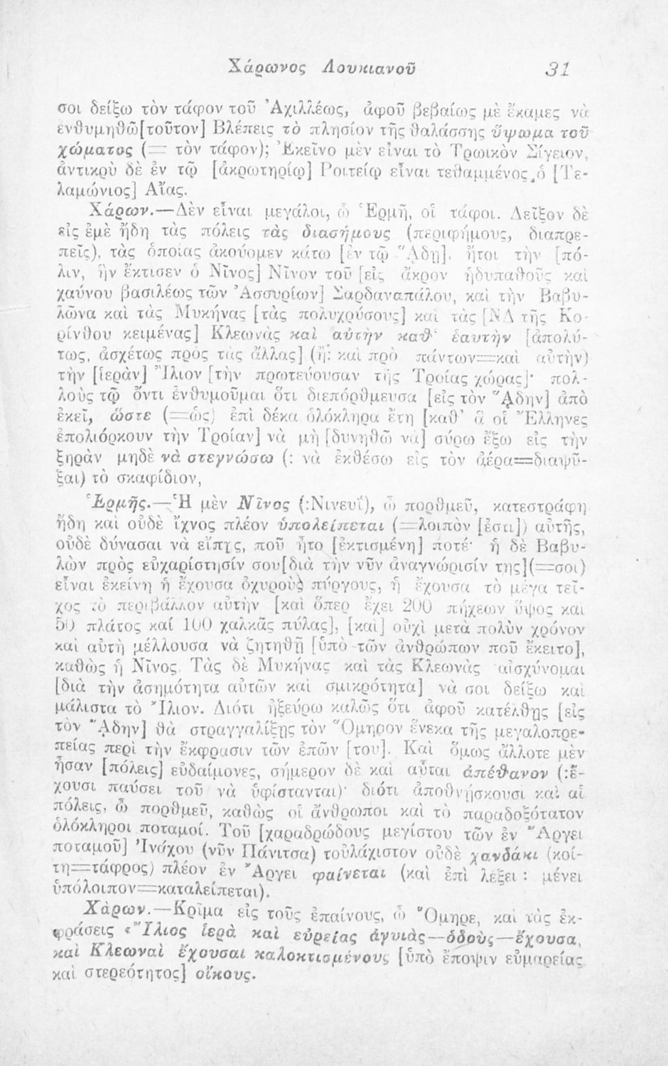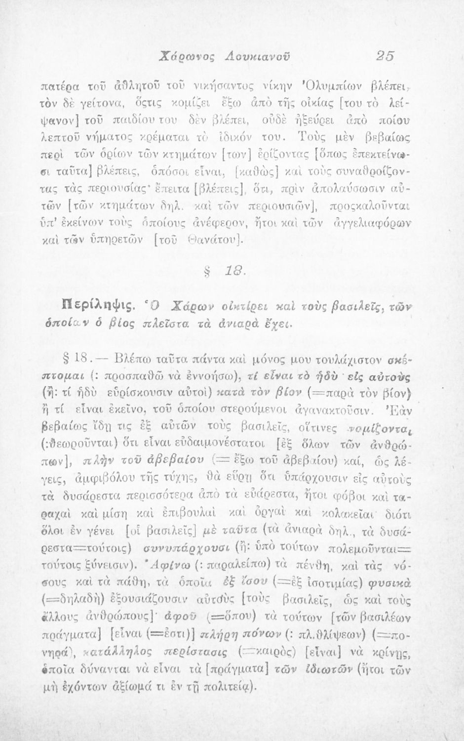 Μαθητικό βοήθημα Αρχαίων Ελληνικών της Γ΄ τάξης των τετρατάξιων Γυμνασίων το οποίο περιέχει το έργο του Λουκιανού 'Χάρωνος ή Επισκοπούντων' σε μετάφραση.