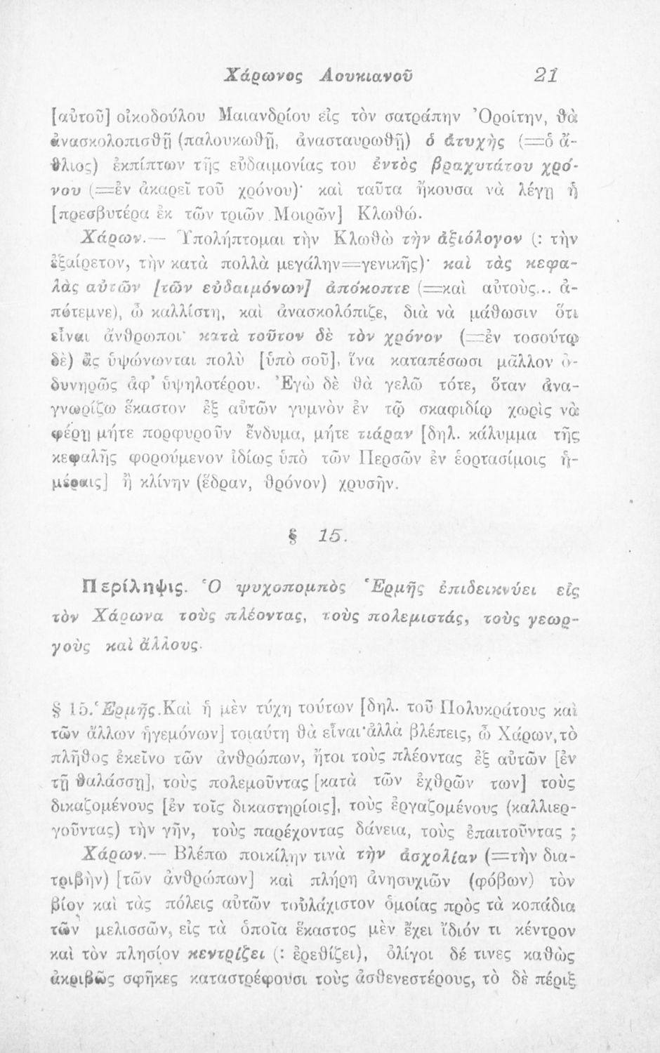 Μαθητικό βοήθημα Αρχαίων Ελληνικών της Γ΄ τάξης των τετρατάξιων Γυμνασίων το οποίο περιέχει το έργο του Λουκιανού 'Χάρωνος ή Επισκοπούντων' σε μετάφραση.