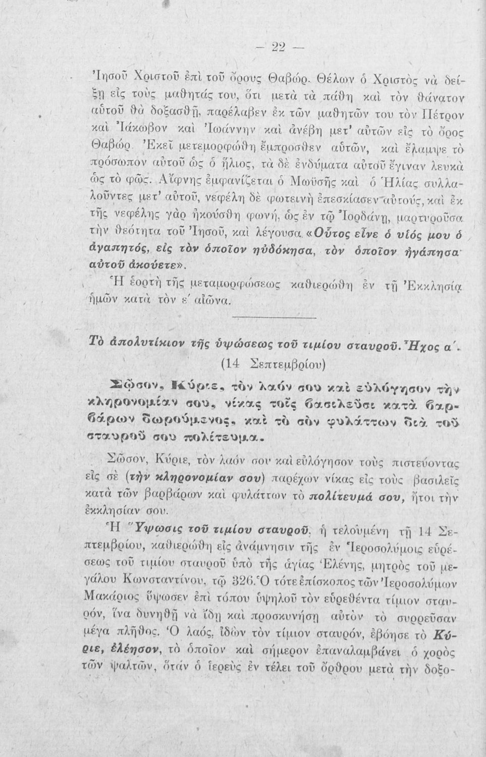 Σχολικό εγχειρίδιο Θρησκευτικών για τις Α΄, Β΄, Γ' Ελληνικού Σχολείου που περιλαμβάνει εισαγωγή στα απολυτίκια, απολυτίκια σε διάφορους ήχους και για διάφορες εορτές και ερμηνευτικές σημειώσεις
