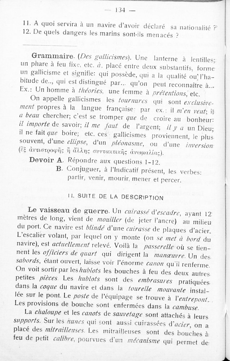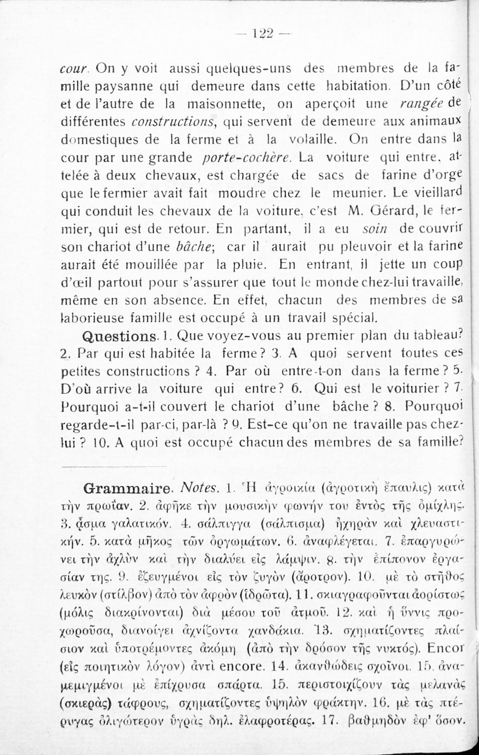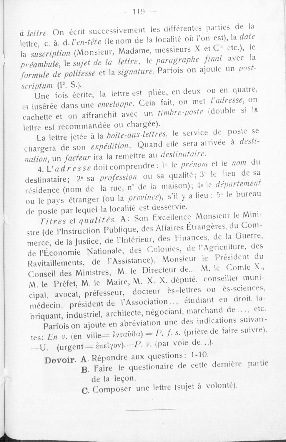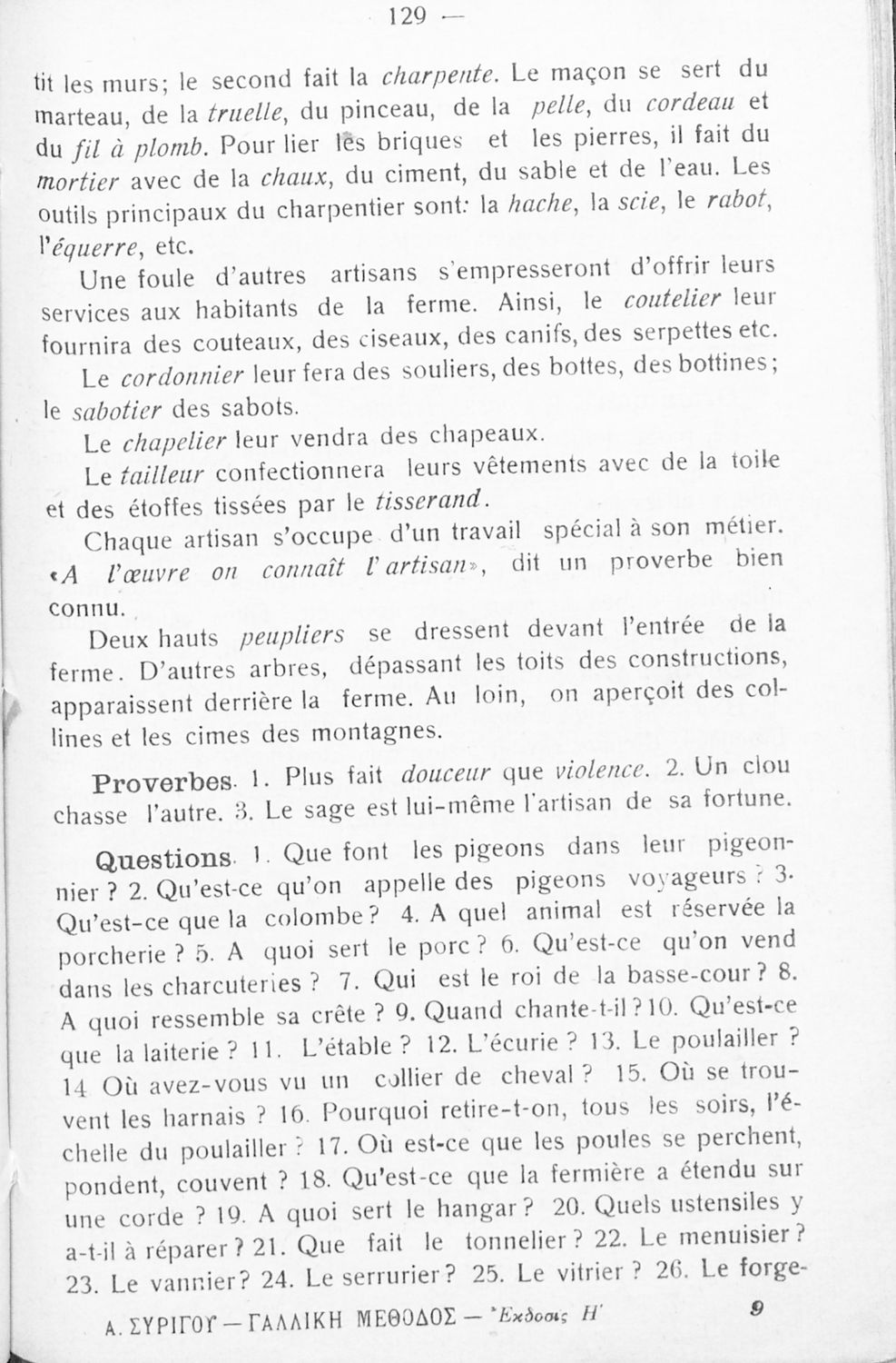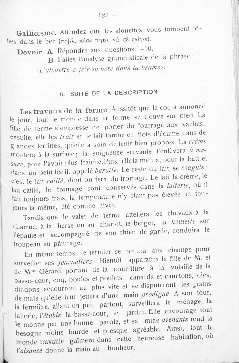 Σχολικό εγχειρίδιο Γαλλικών που περιλαμβάνει κείμενα, λεξιλόγιο και ασκήσεις. Ο συγγραφέας ήταν καθηγητής της Δημόσιας Εμπορικής Σχολής Αθηνών και του Αρσακείου.