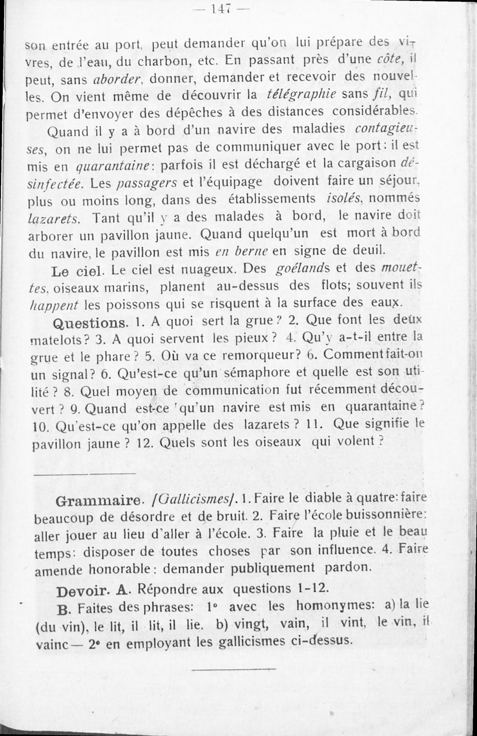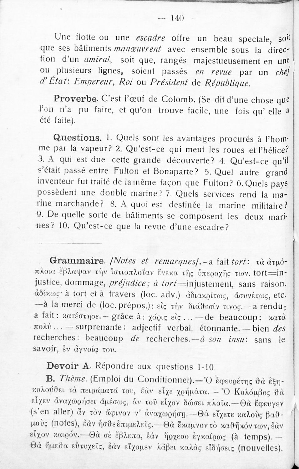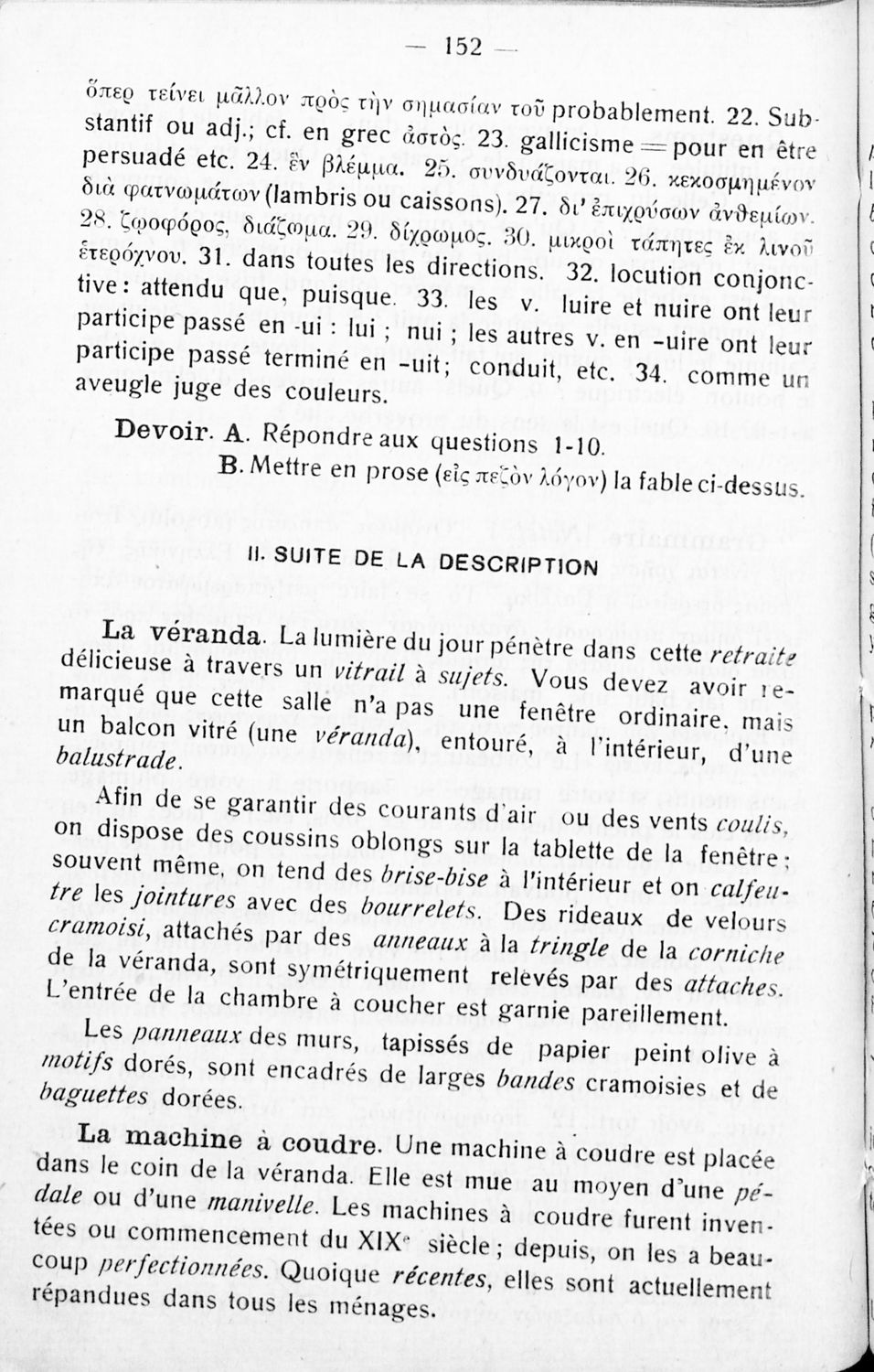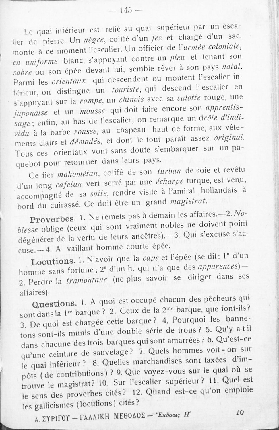 Σχολικό εγχειρίδιο Γαλλικών που περιλαμβάνει κείμενα, λεξιλόγιο και ασκήσεις. Ο συγγραφέας ήταν καθηγητής της Δημόσιας Εμπορικής Σχολής Αθηνών και του Αρσακείου.