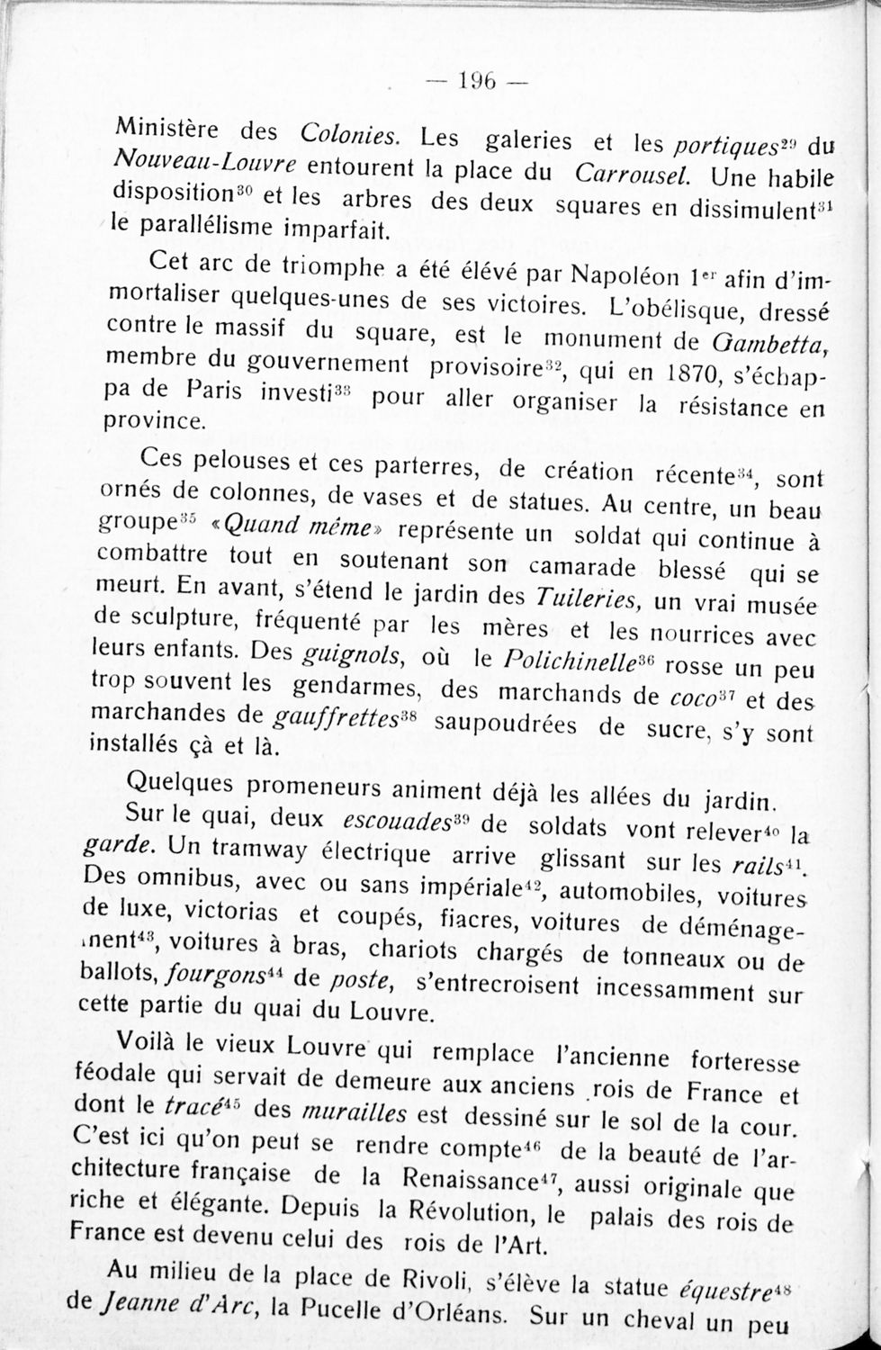 Σχολικό εγχειρίδιο Γαλλικών που περιλαμβάνει 54 κείμενα για τη διδασκαλία των γραμματικών και συντακτικών φαινομένων και της ορθογραφίας, λεξιλόγιο και παράρτημα με τους κανόνες συλλαβισμού.