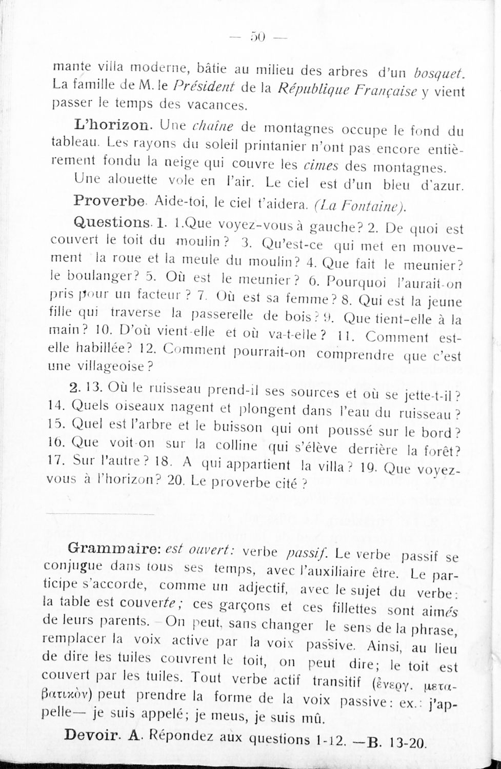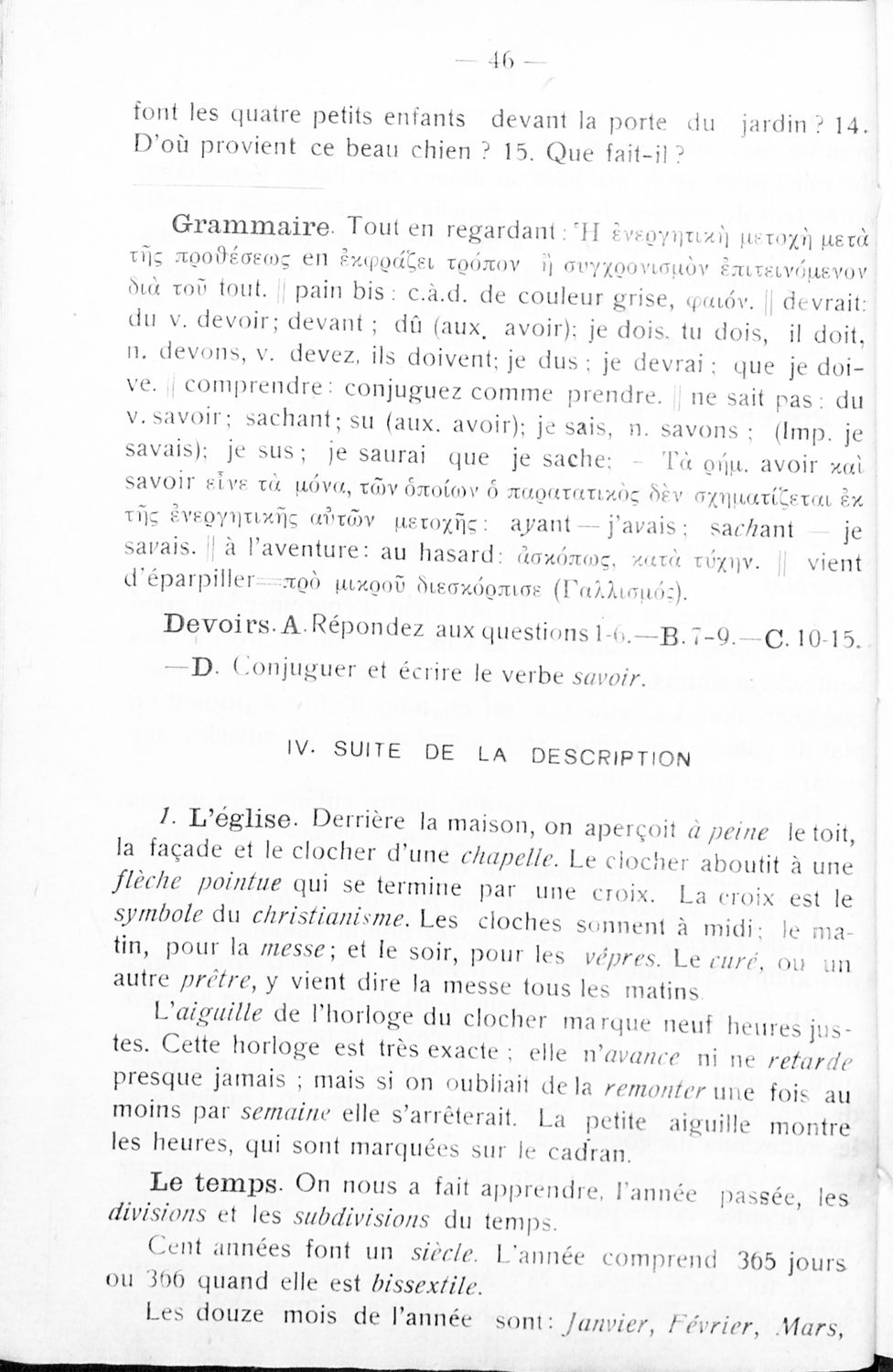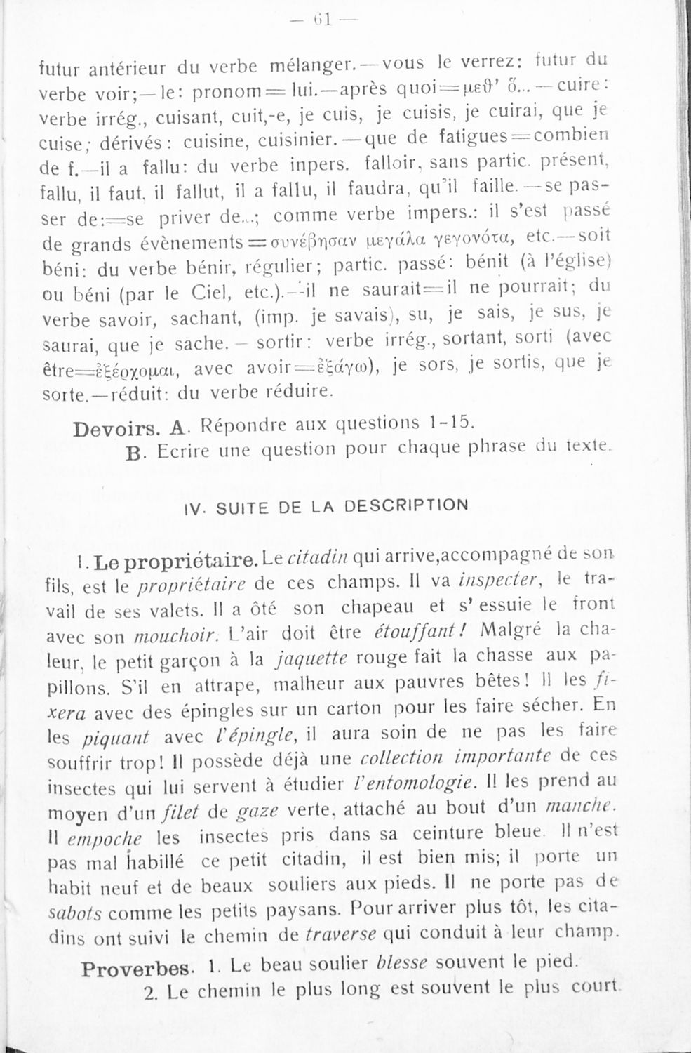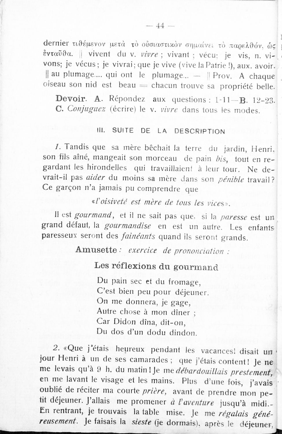 Σχολικό εγχειρίδιο Γαλλικών που περιλαμβάνει κείμενα, λεξιλόγιο και ασκήσεις. Ο συγγραφέας ήταν καθηγητής της Δημόσιας Εμπορικής Σχολής Αθηνών και του Αρσακείου.