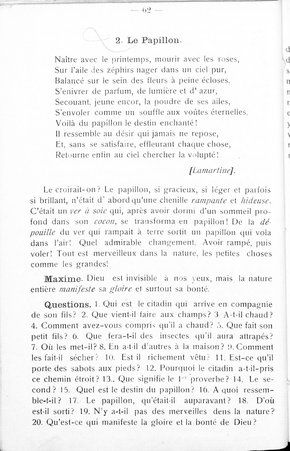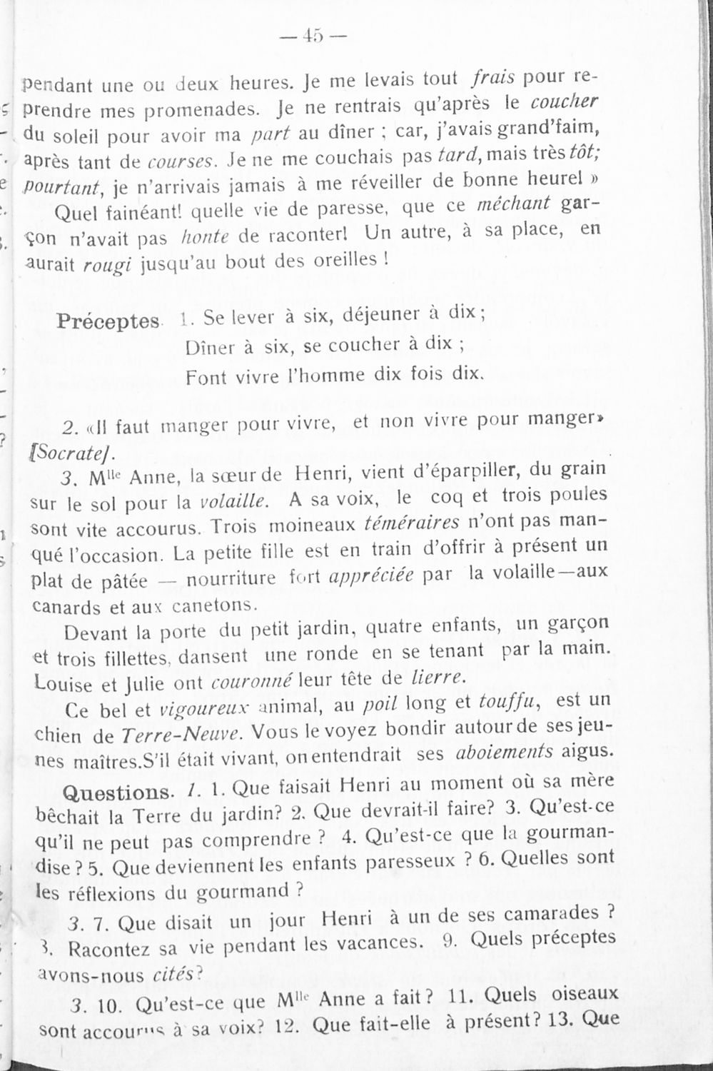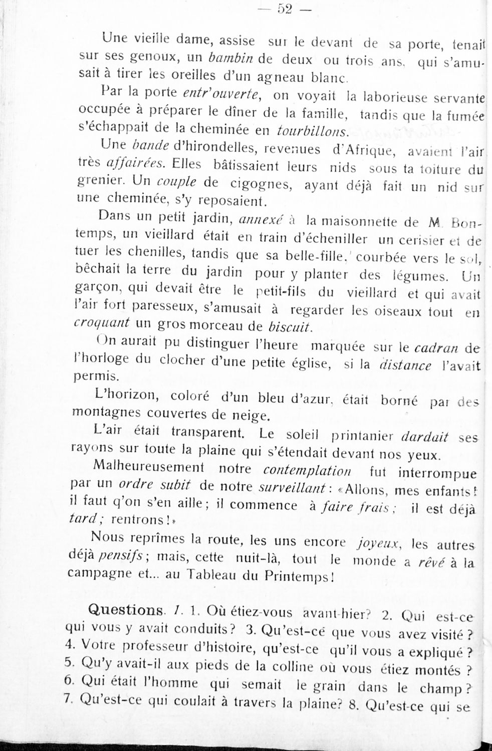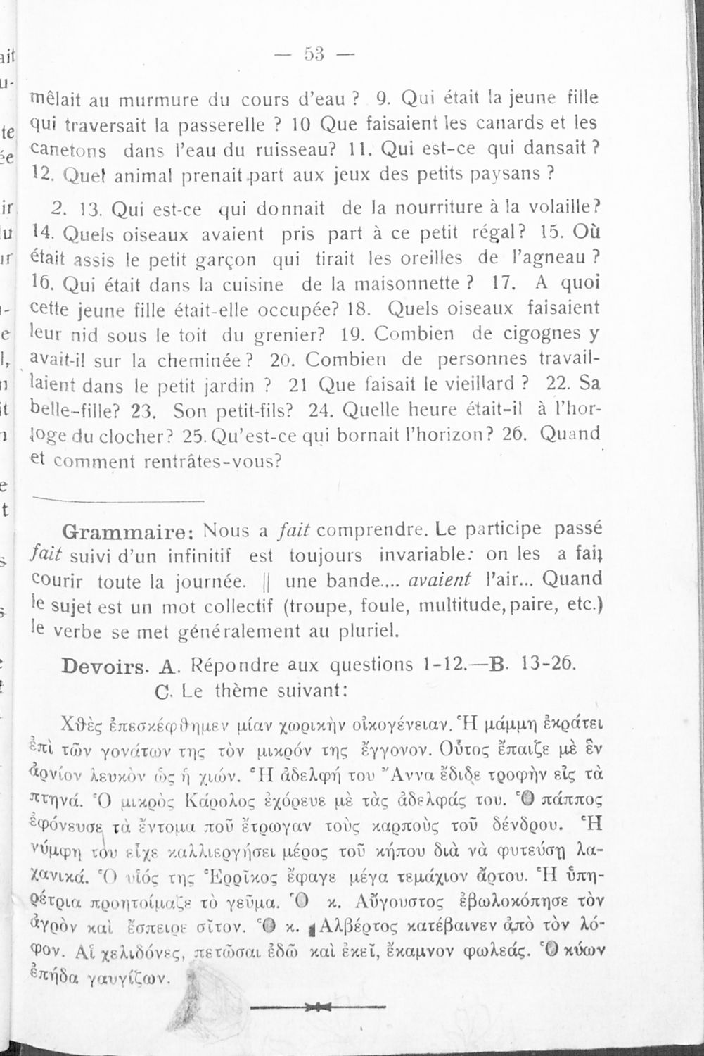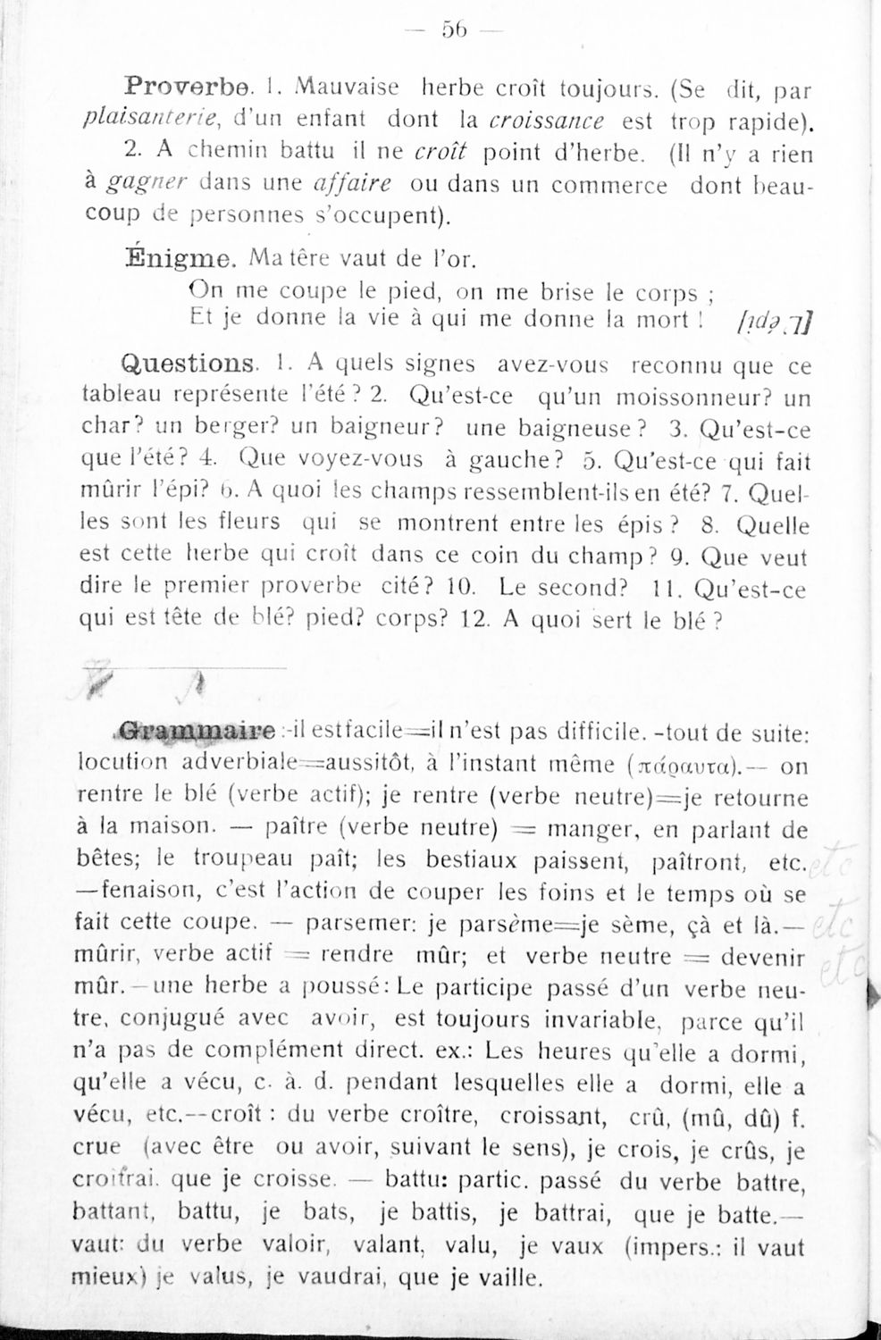 Σχολικό εγχειρίδιο Γαλλικών που περιλαμβάνει 54 κείμενα για τη διδασκαλία των γραμματικών και συντακτικών φαινομένων και της ορθογραφίας, λεξιλόγιο και παράρτημα με τους κανόνες συλλαβισμού.