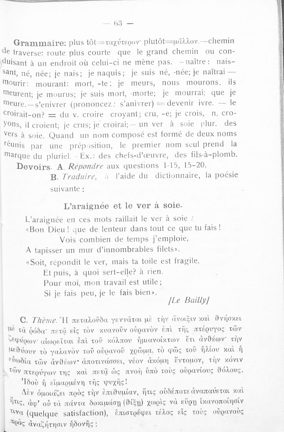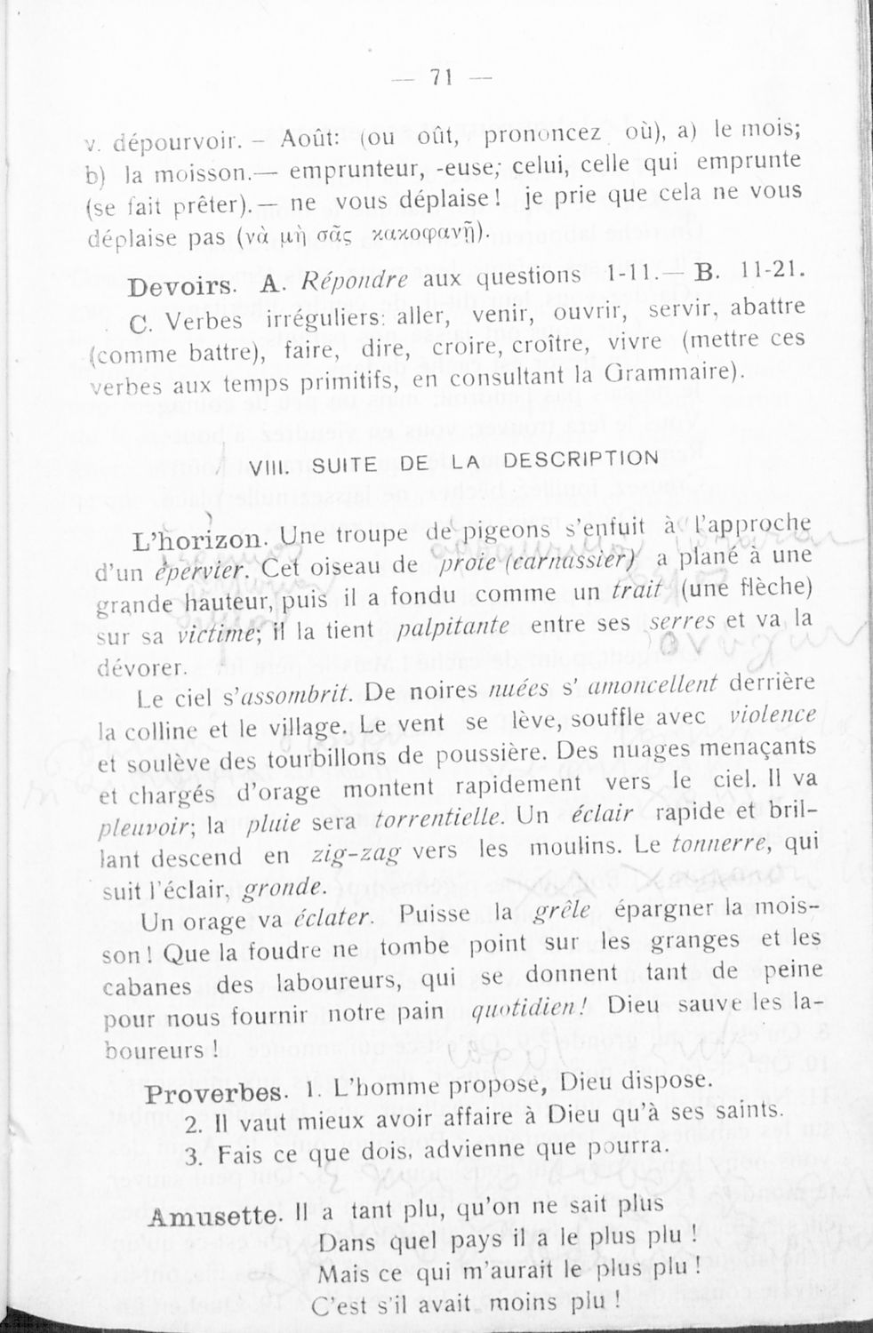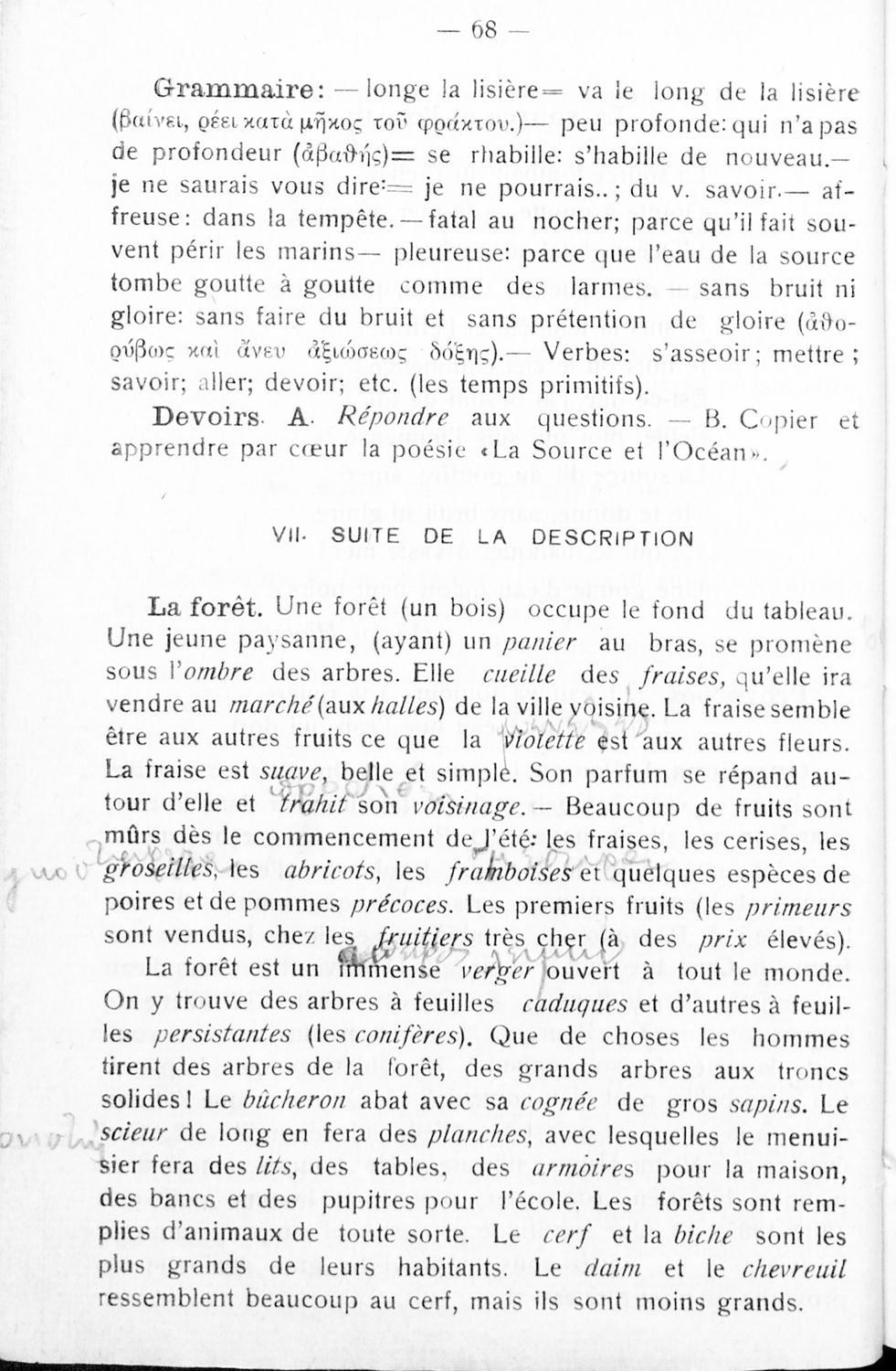 Σχολικό εγχειρίδιο Γαλλικών που περιλαμβάνει κείμενα, λεξιλόγιο και ασκήσεις. Ο συγγραφέας ήταν καθηγητής της Δημόσιας Εμπορικής Σχολής Αθηνών και του Αρσακείου.