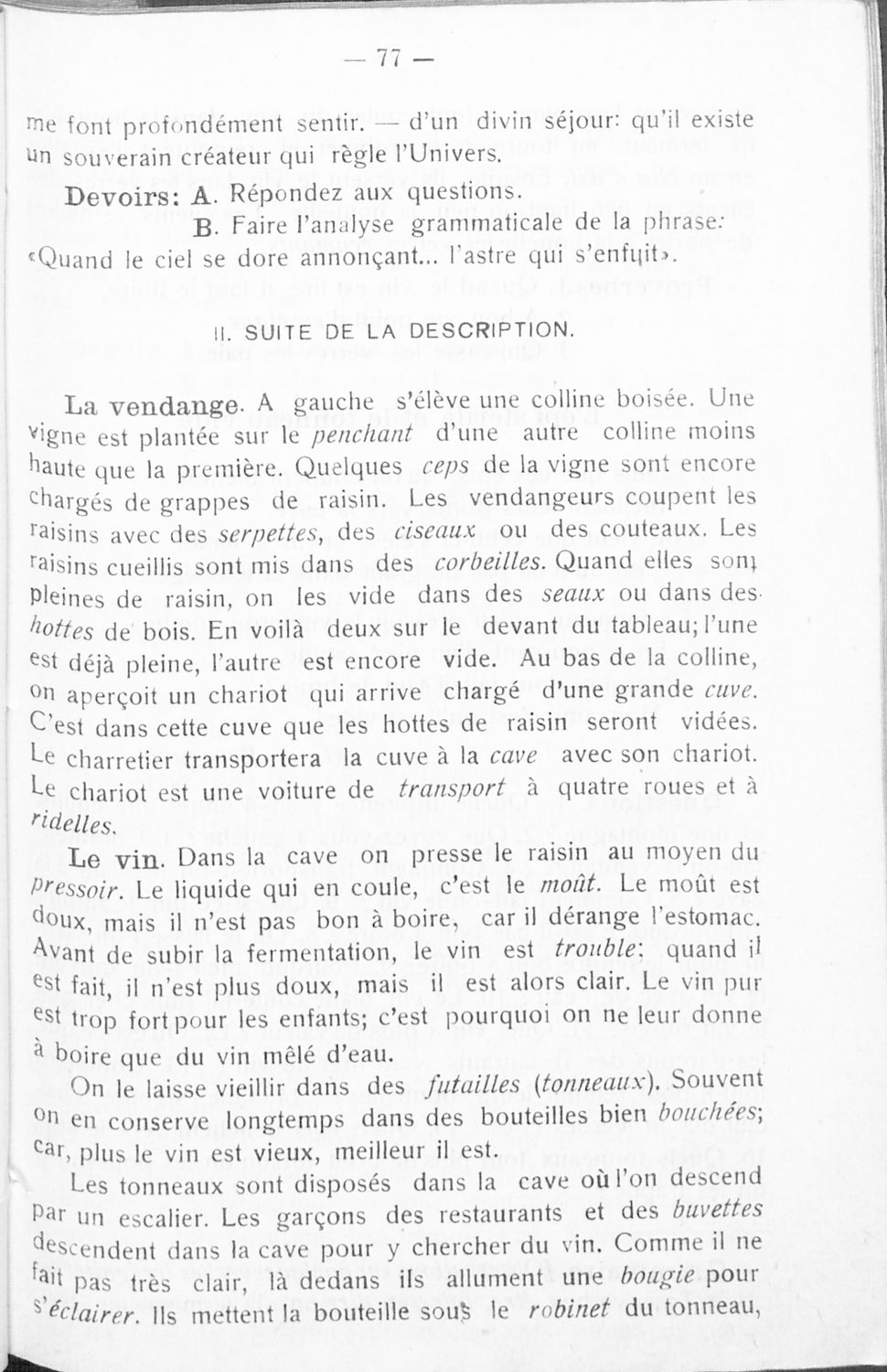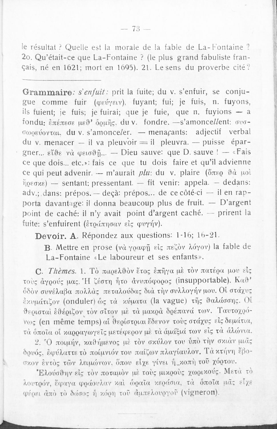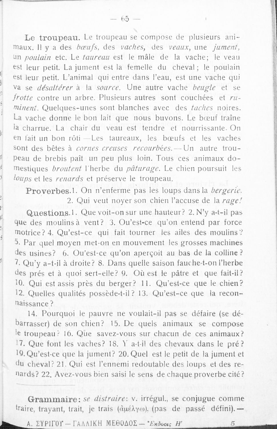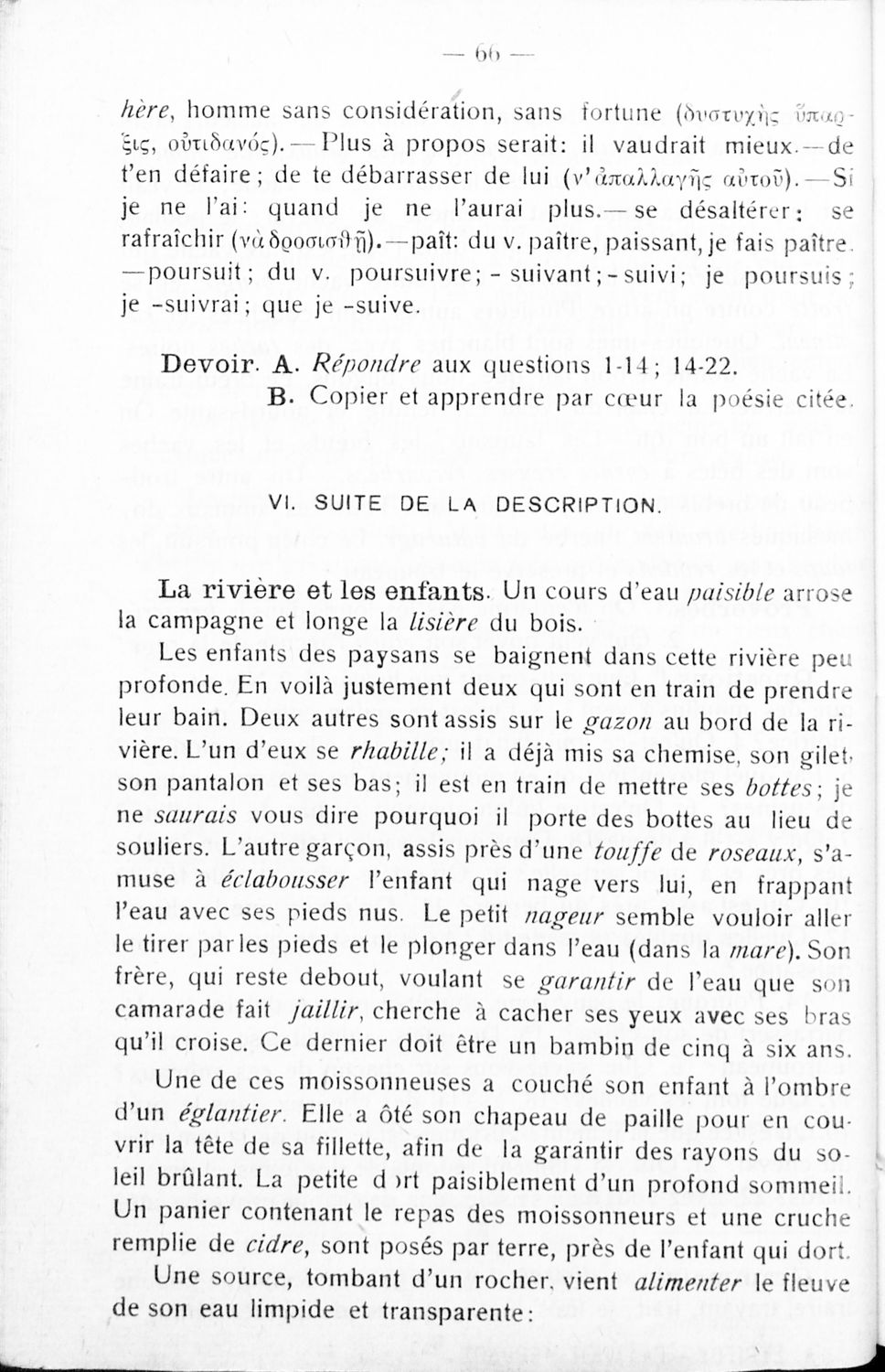 Σχολικό εγχειρίδιο Γαλλικών που περιλαμβάνει κείμενα, λεξιλόγιο και ασκήσεις. Ο συγγραφέας ήταν καθηγητής της Δημόσιας Εμπορικής Σχολής Αθηνών και του Αρσακείου.