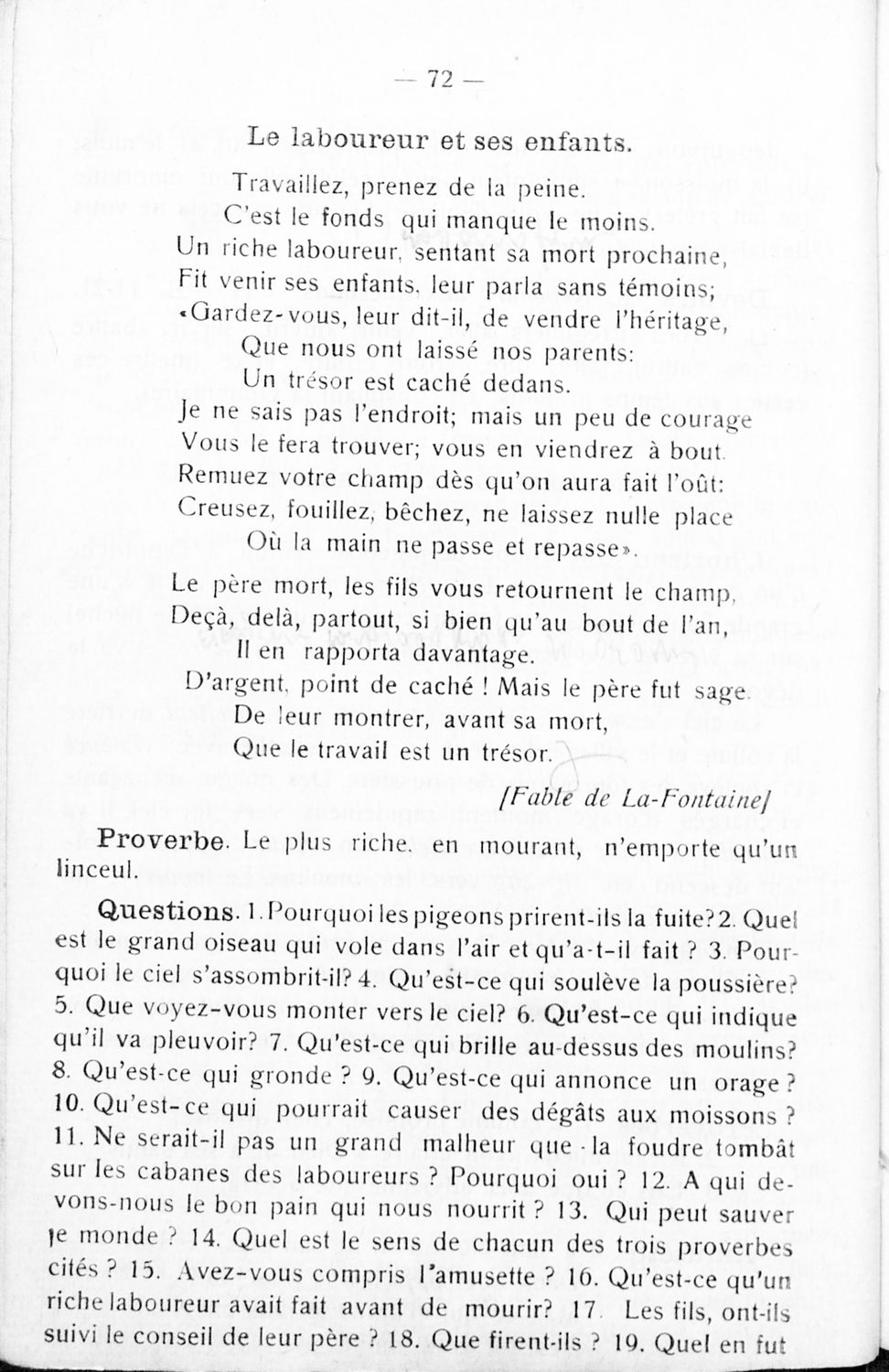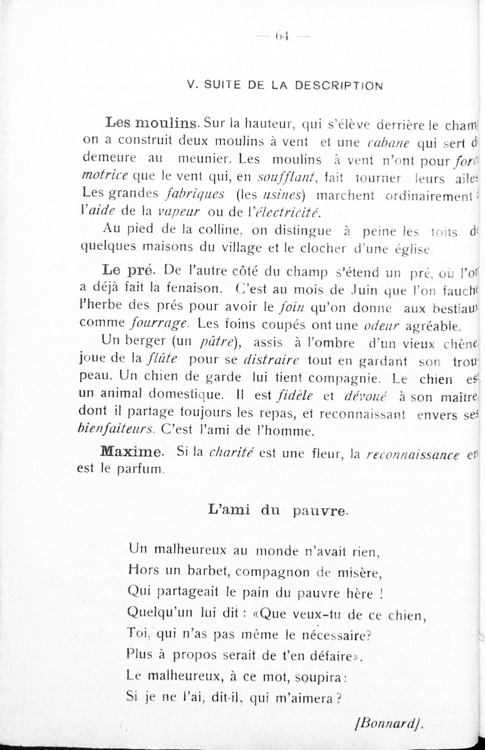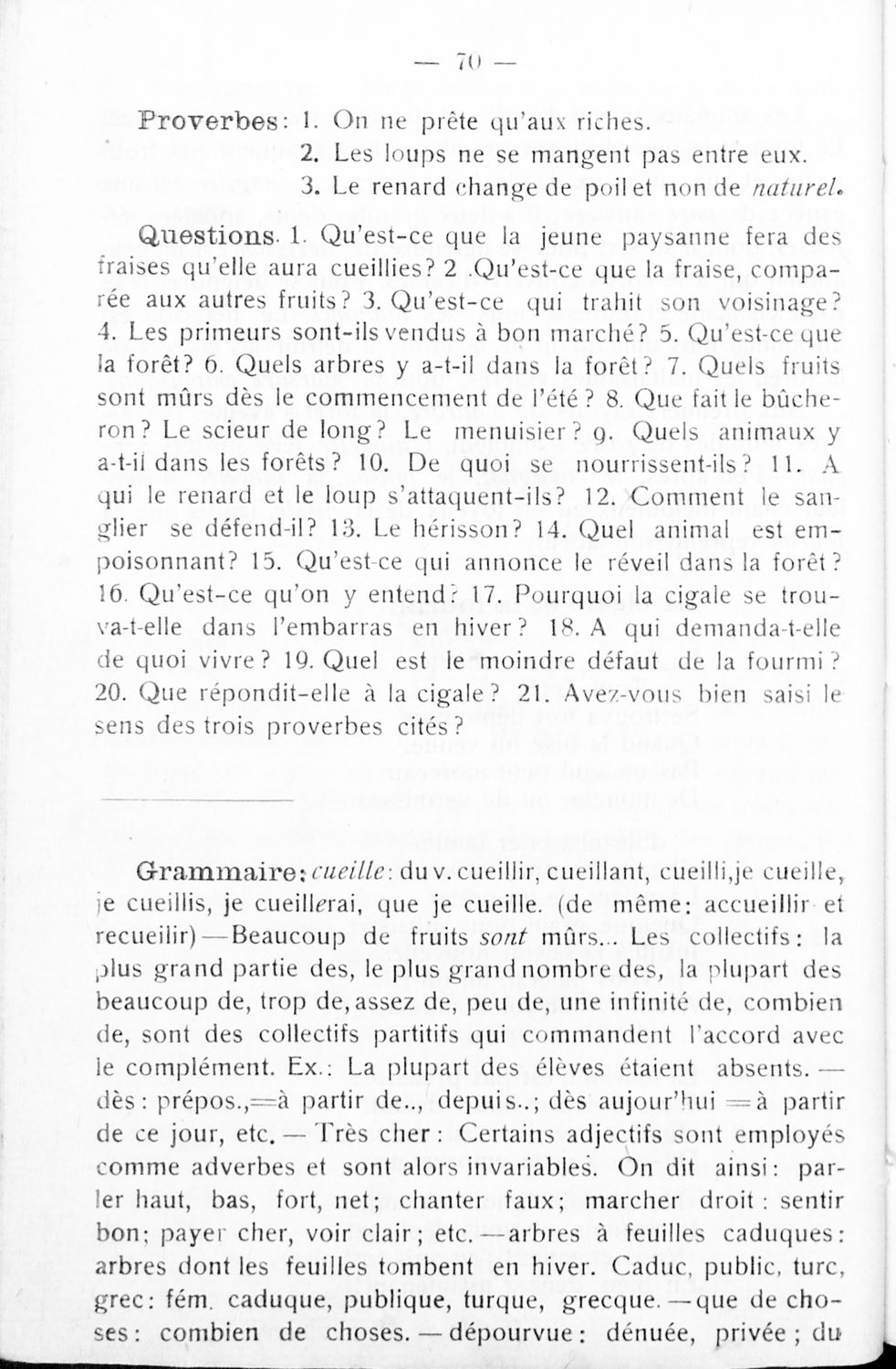 Σχολικό εγχειρίδιο Γαλλικών που περιλαμβάνει 54 κείμενα για τη διδασκαλία των γραμματικών και συντακτικών φαινομένων και της ορθογραφίας, λεξιλόγιο και παράρτημα με τους κανόνες συλλαβισμού.