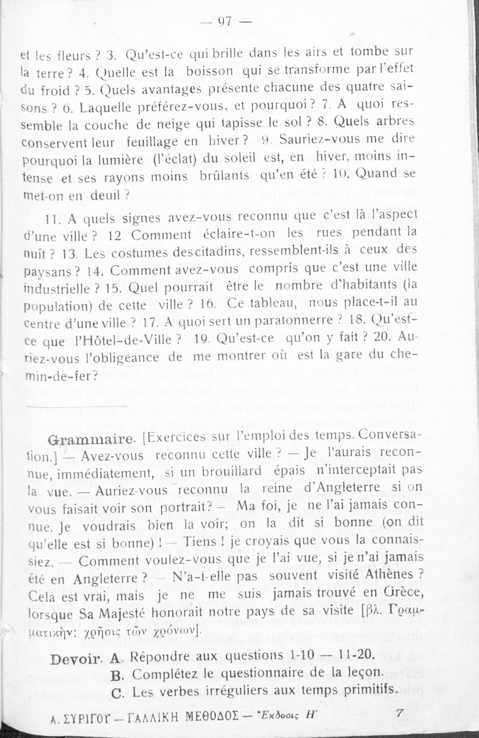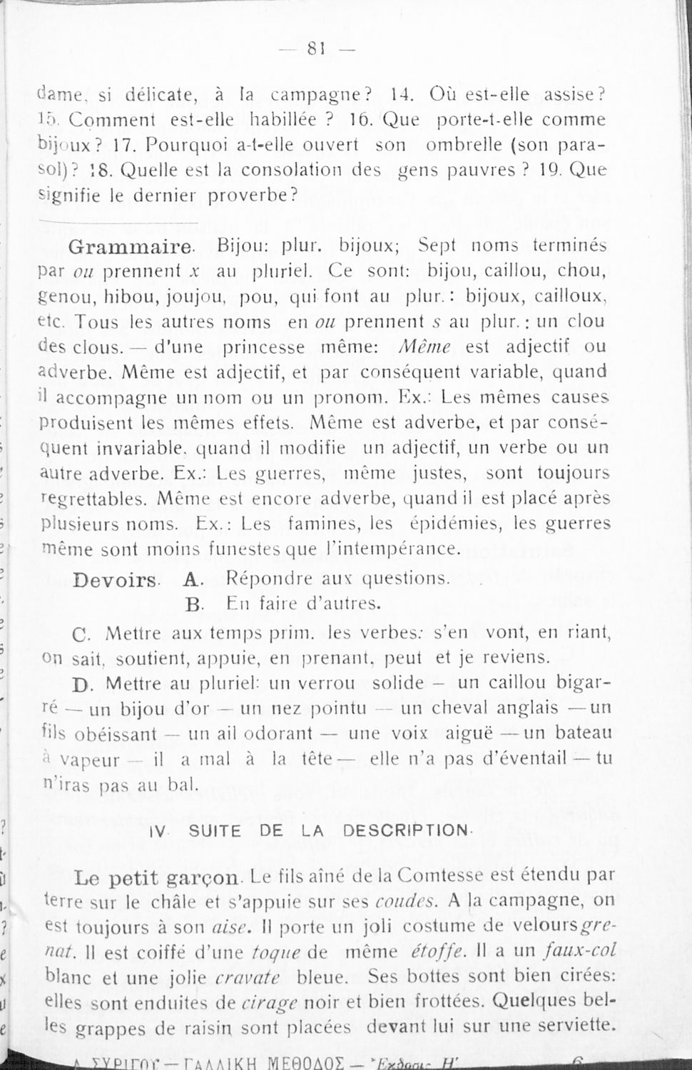 Σχολικό εγχειρίδιο για τις τάξεις των Γυμνασίων, Αστικών σχολείων, Παρθεναγωγείων, Διδασκαλεία και Εμπορικές σχολές. Το βιβλίο περιλαμβάνει ασκήσεις γραμματικής, συντακτικού και λεξιλογίου για πρακτική εξάσκηση των μαθητών. Επιπλέον το βιβλίο περιλαμβάνει σειρά κειμένων τα οποία συνοδεύονται ερωτήσεις για γλωσσική ανάλυση.