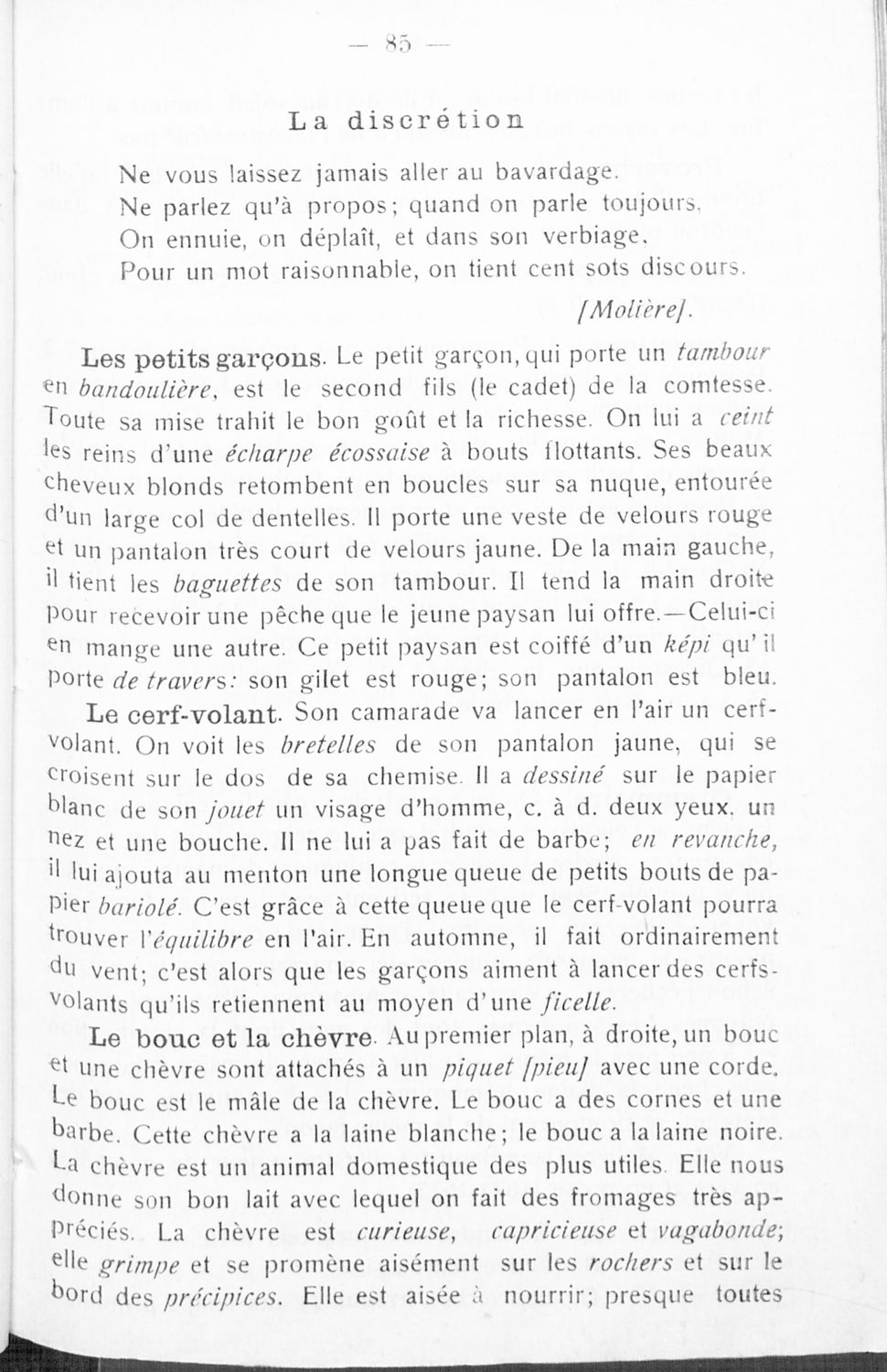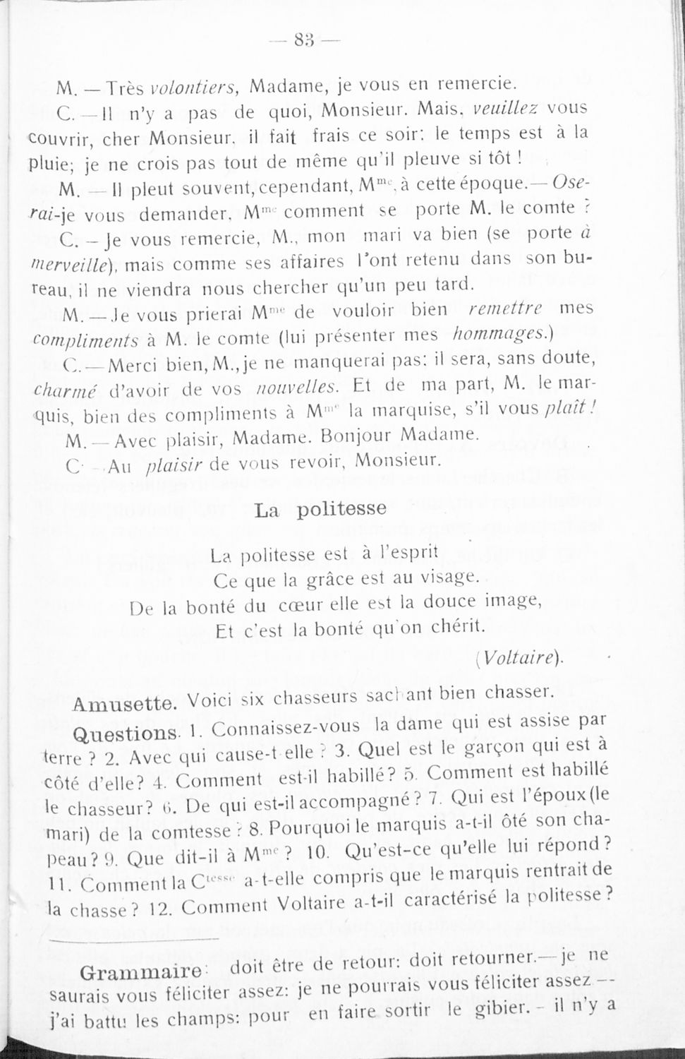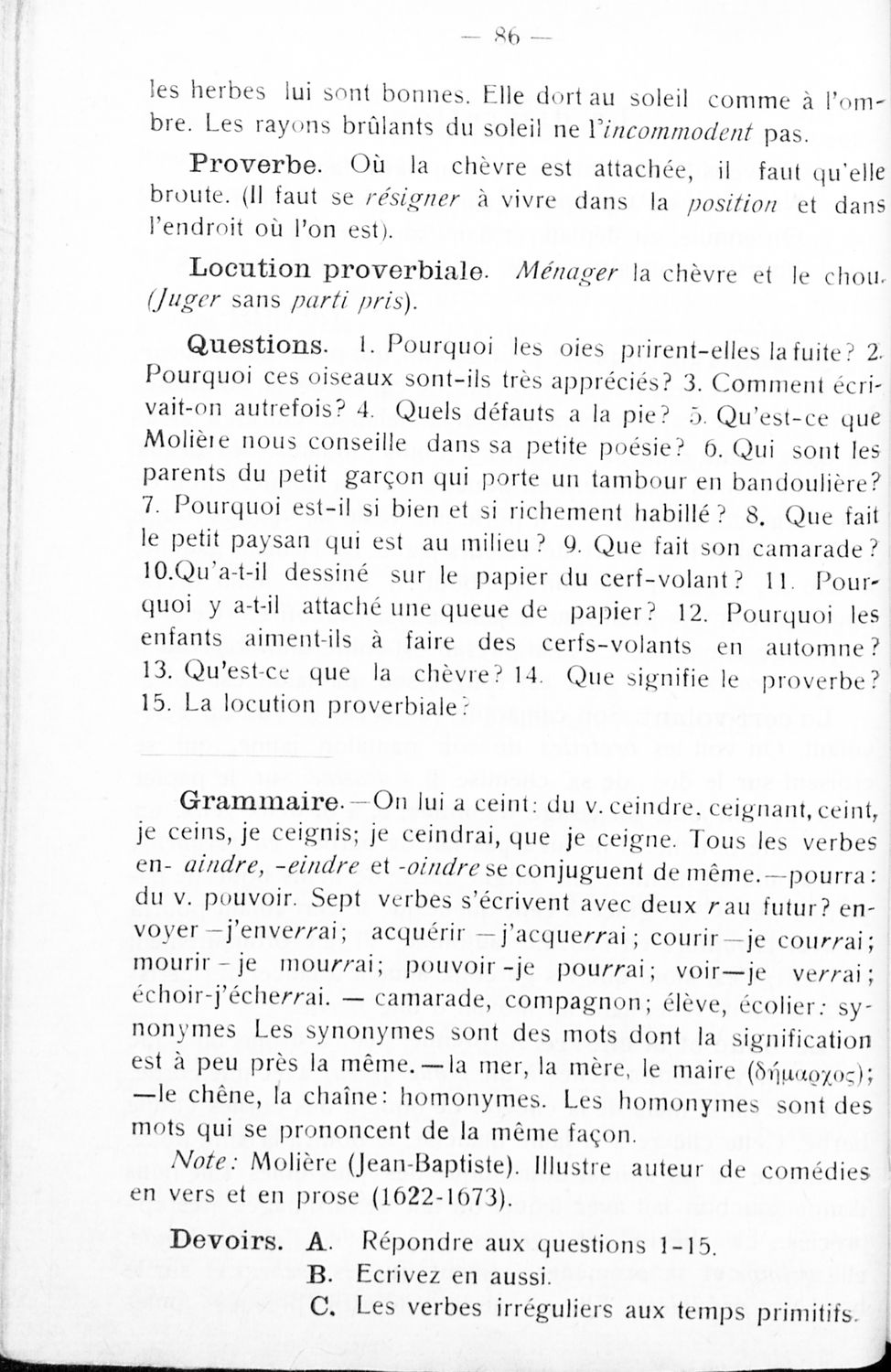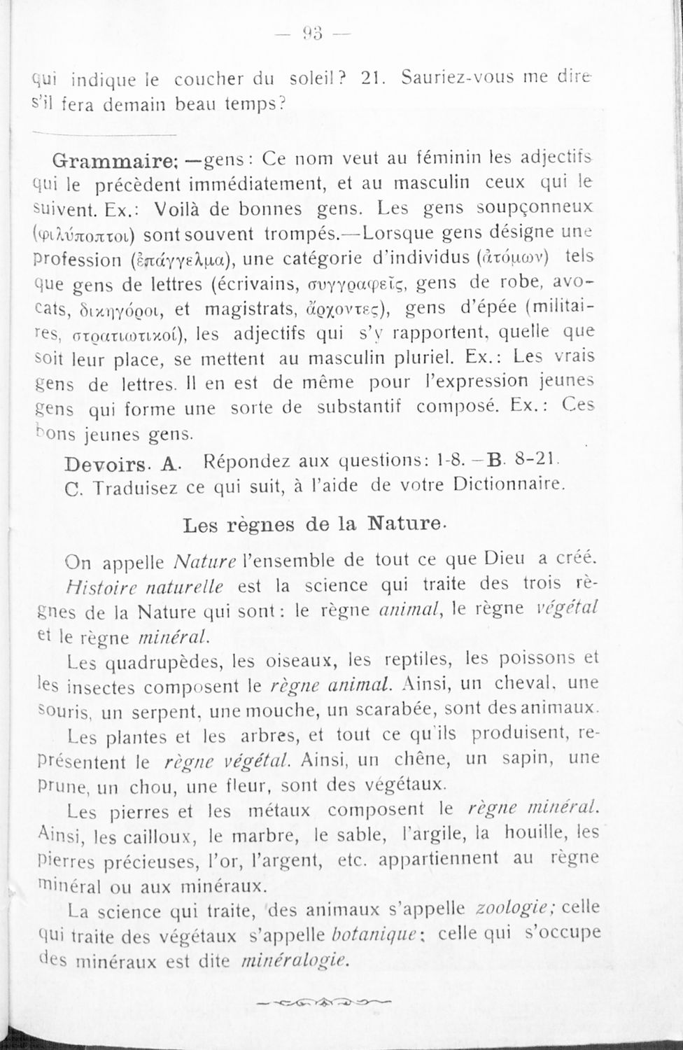 Βαθμίδα εκπαίδευσης: Δευτεροβάθμια Τάξη: Γυμνάσιο / Αστικό Σχολείο / Παρθεναγωγείο/ Διδασκαλείο / Εμπορικές Σχολές Μάθημα: Γαλλικά Γλώσσα: Γαλλικά Παρουσίαση περιεχομένου: Σχολικό εγχειρίδιο για τις τάξεις των Γυμνασίων, Αστικών σχολείων, Παρθεναγωγείων, Διδασκαλεία και Εμπορικές σχολές. Το βιβλίο περιλαμβάνει ασκήσεις γραμματικής, συντακτικού και λεξιλογίου για πρακτική εξάσκηση των μαθητών. Επιπλέον το βιβλίο περιλαμβάνει σειρά κειμένων τα οποία συνοδεύονται ερωτήσεις για γλωσσική ανάλυση. |