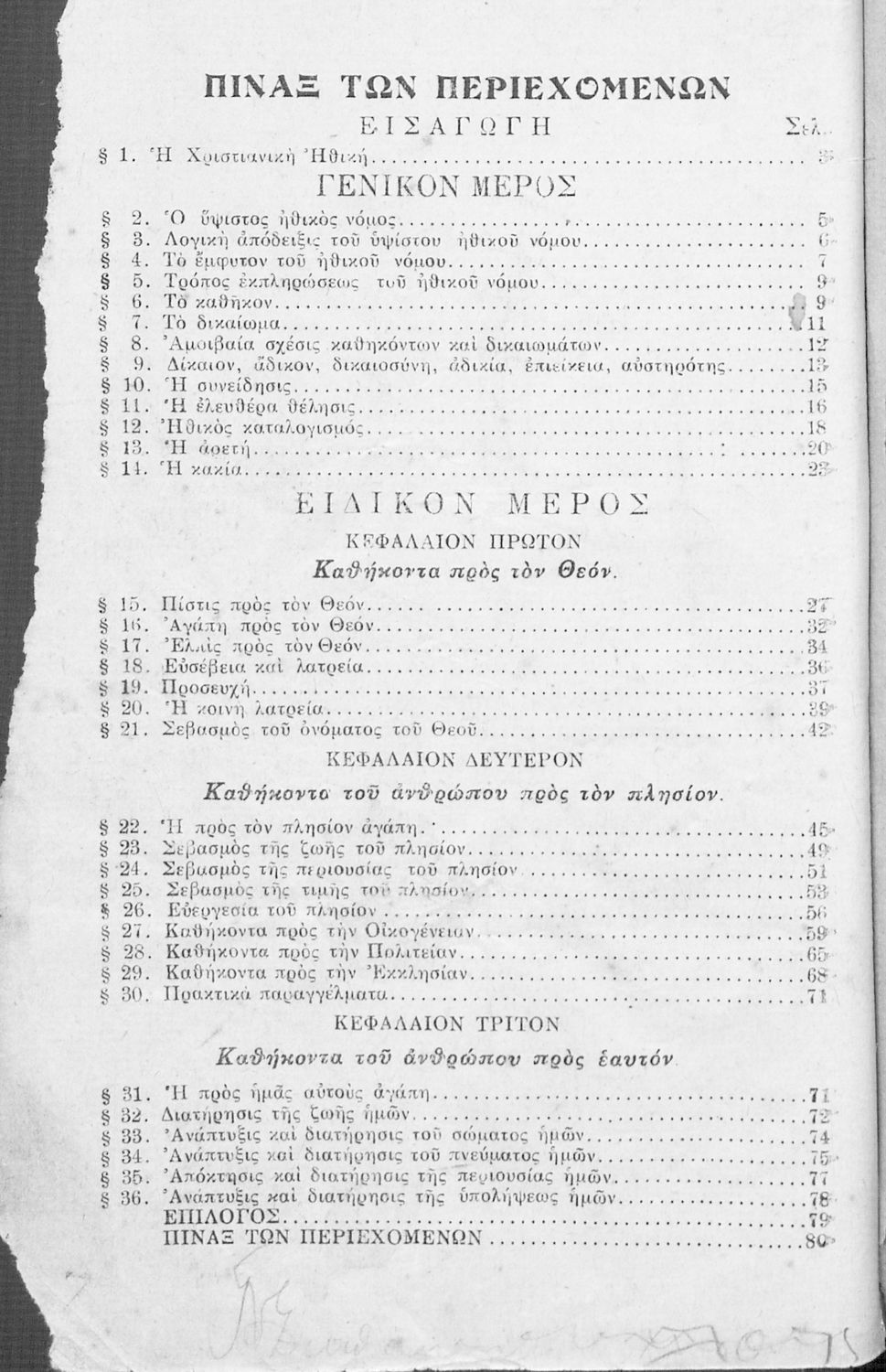 Σχολικό εγχειρίδιο Θρησκευτικών για τα Γυμνάσια και τα Διδασκαλεία που εστιάζει στη χριστιανική ηθική και αναλύει τα καθήκοντα του ανθρώπου προς τον Θεό, τους άλλους ανθρώπους και τον εαυτό του.