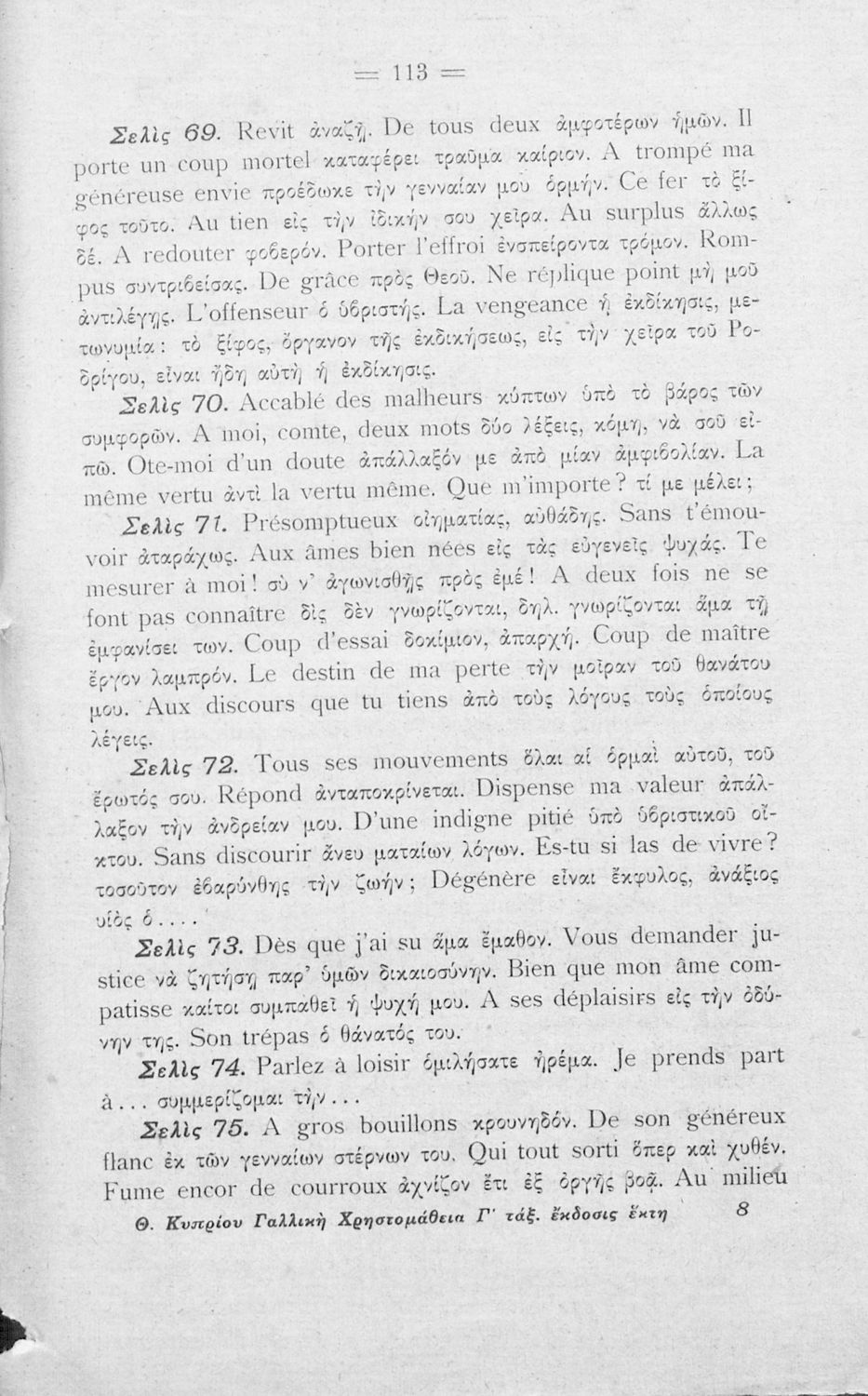 Τίτλος: Γαλλική χρηστομάθεια, τόμος Γ΄, εγκεκριμένος υπό του Υπουργείου της Παιδείας διά την Γ΄ τάξιν των Γυμνασίων, την αντίστοιχον τάξιν των λοιπών σχολείων της Μέσης Εκπαιδεύσεως, την β΄ τάξιν των Διδασκαλείων Θηλέων και την :α΄ τάξιν των Διδασκαλείων Αρρένων της Δημοτ. Εκπαιδεύσεως