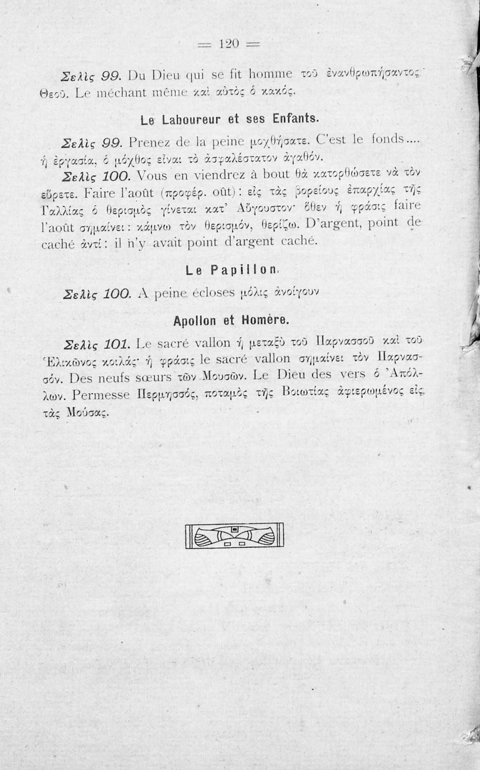 Σχολικό εγχειρίδιο Γαλλικών Γ' Γυμνασίου, Α΄ Διδασκαλείου Αρρένων και Β΄ Διδασκαλείου θηλέων που περιέχει σειρά ποιημάτων και πεζών Γάλλων συγγραφέων, σύντομα βιογραφικά σημειώματα, ερμηνευτικές και γλωσσικές σημειώσεις και λεξιλόγιο.