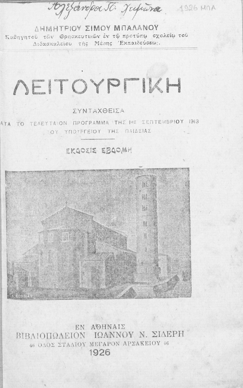 Κωδικός αναγνώρισης: 02-01740 Τίτλος: Λειτουργική συνταχθείσα κατά το τελευταίον πρόγραμμα της 1ης Σεπτεμβρίου 1913 του υπουργείου της παιδείας Συγγραφέας: Δημήτριος Σίμος Μπαλάνος Μέγεθος και υπόστρωμα: Μαθητικό βοήθημα, σκληρό εξώφυλλο, 282 σελίδες. Σκίτσα (ασπρόμαυρα). |