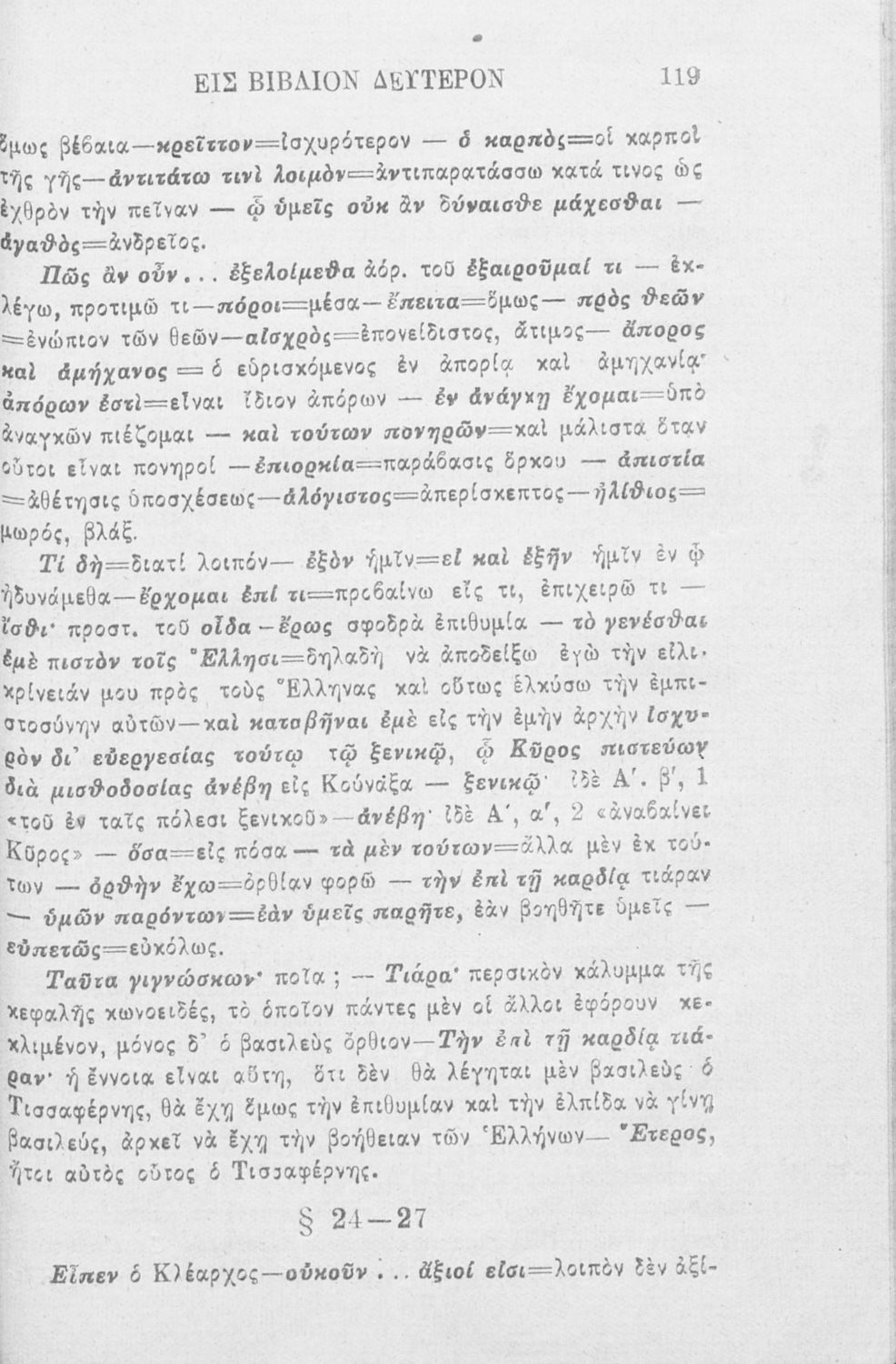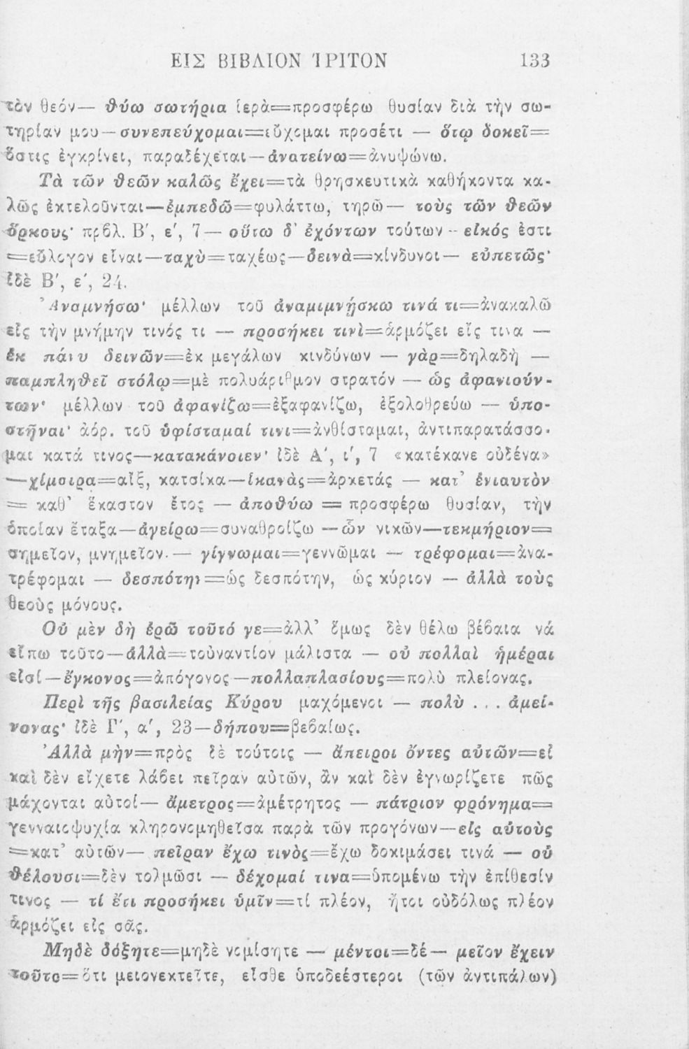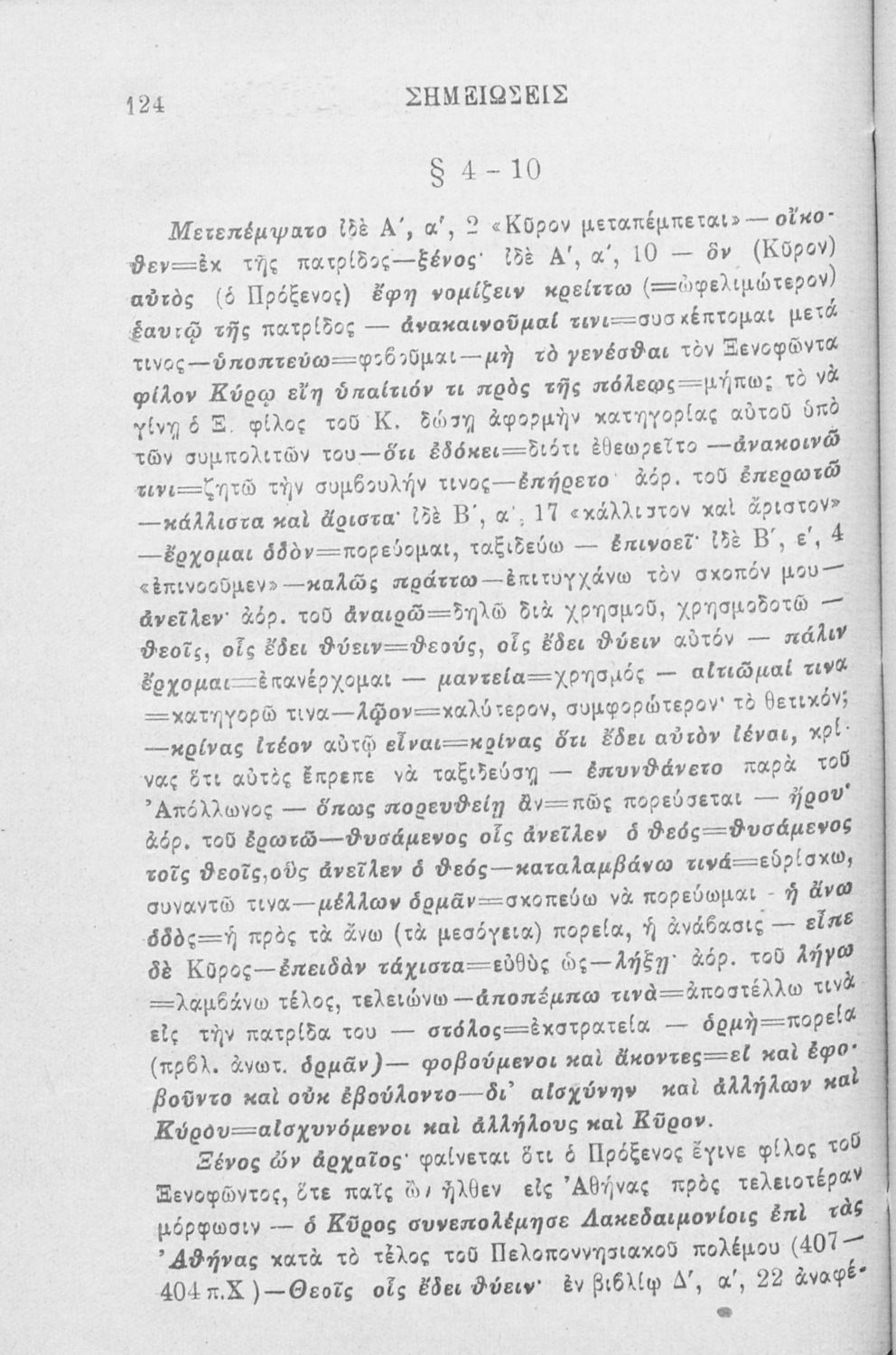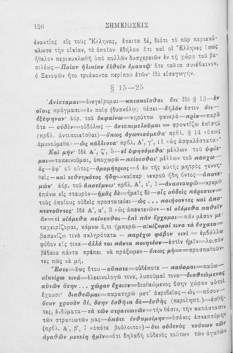 Βαθμίδα εκπαίδευσης: Δευτεροβάθμια Μάθημα: Αρχαία Ελληνικά Γλώσσα: Καθαρεύουσα Παρουσίαση περιεχομένου: Σχολικό εγχειρίδιο Αρχαίων Ελληνικών που περιλαμβάνει αποσπάσματα από το έργο του Ξενοφώντα Κύρου Ανάβασις, εισαγωγικά σχόλια για τη ζωή και το έργο του, ερμηνευτικές και γραμματικές παρατηρήσεις, λεξικολογικά σχόλια και πίνακα κυρίων ονομάτων. |