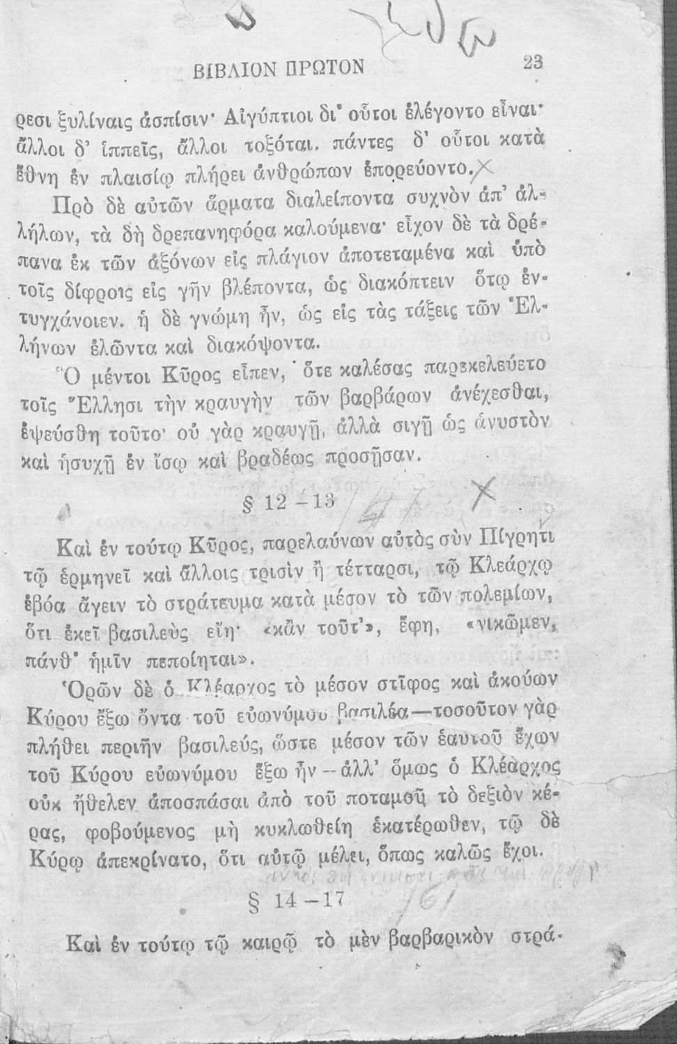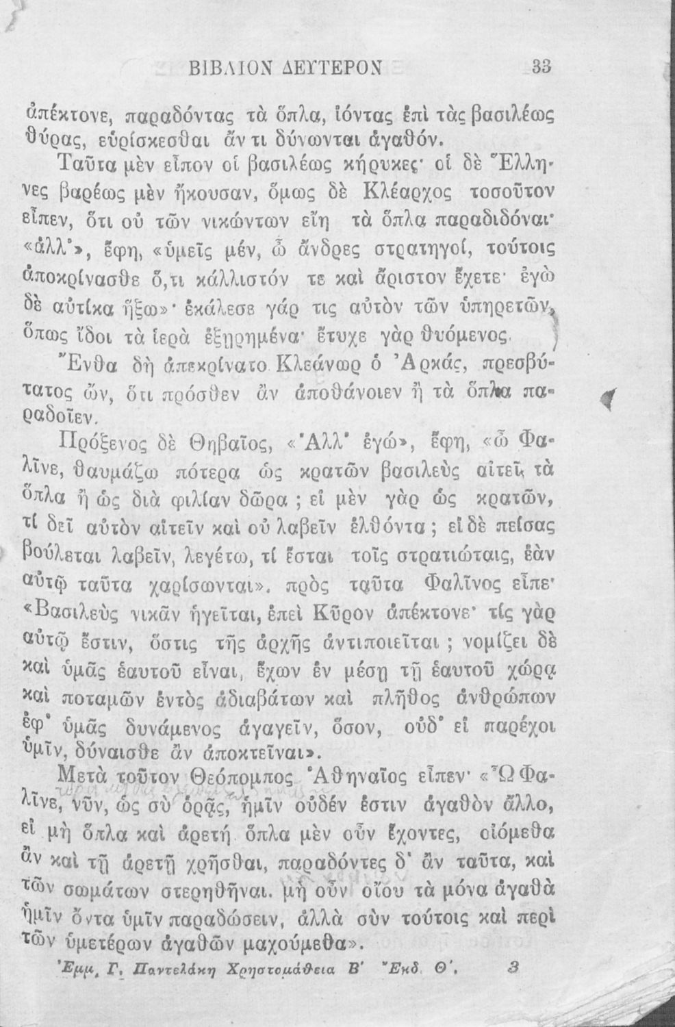 Βαθμίδα εκπαίδευσης: Δευτεροβάθμια Μάθημα: Αρχαία Ελληνικά Γλώσσα: Καθαρεύουσα Παρουσίαση περιεχομένου: Σχολικό εγχειρίδιο Αρχαίων Ελληνικών που περιλαμβάνει αποσπάσματα από το έργο του Ξενοφώντα Κύρου Ανάβασις, εισαγωγικά σχόλια για τη ζωή και το έργο του, ερμηνευτικές και γραμματικές παρατηρήσεις, λεξικολογικά σχόλια και πίνακα κυρίων ονομάτων. |