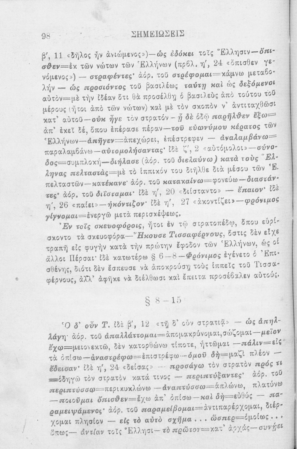 Σχολικό εγχειρίδιο Αρχαίων Ελληνικών για τα Ελληνικά Σχολεία και Παρθεναγωγεία που περιλαμβάνει αποσπάσματα από τα έργα του Ξενοφώντα Ελληνικά και Κύρου Παιδεία και λεξικολογικές παρατηρήσεις.