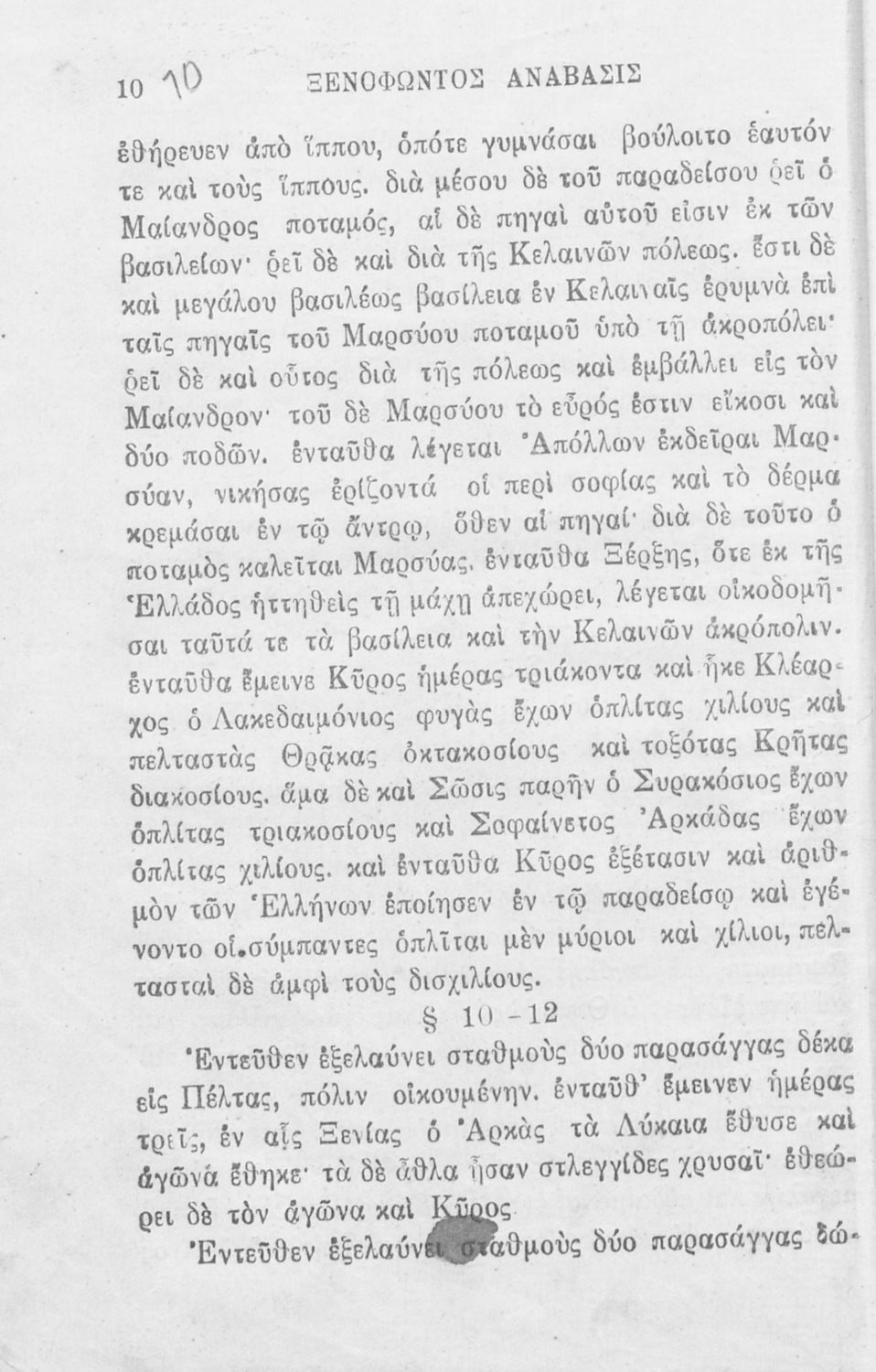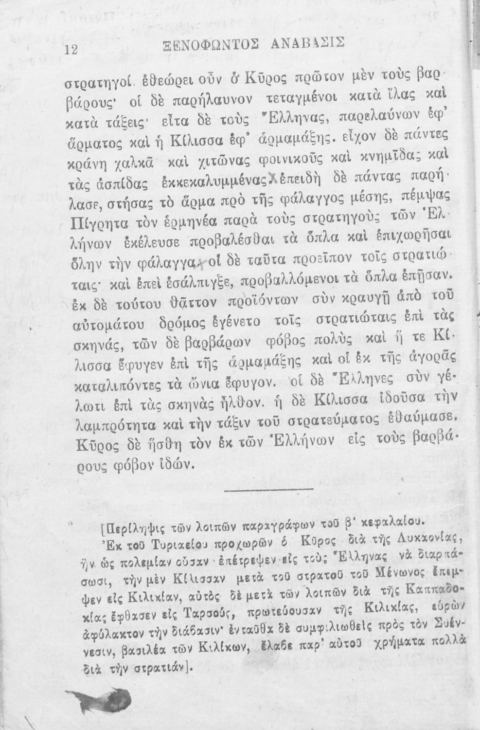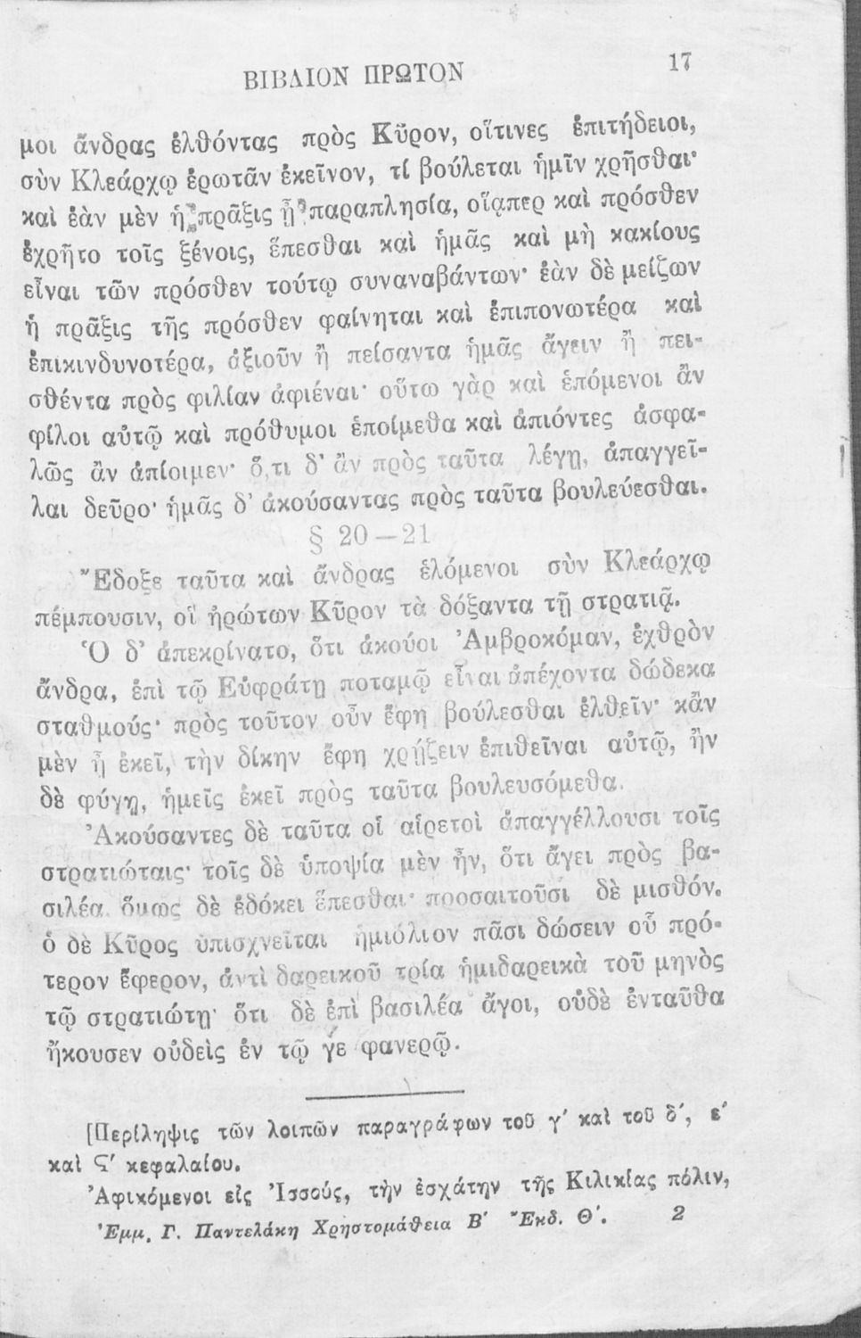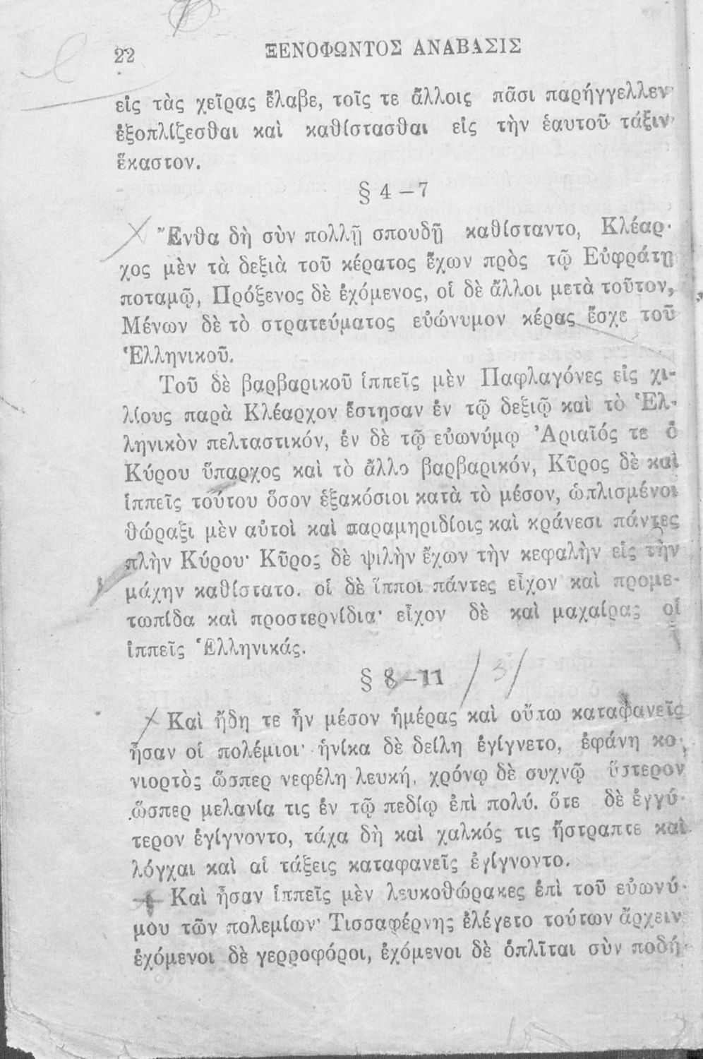 Σχολικό εγχειρίδιο Αρχαίων Ελληνικών που περιλαμβάνει αποσπάσματα από το έργο του Ξενοφώντα Κύρου Ανάβασις, εισαγωγικά σχόλια για τη ζωή και το έργο του, ερμηνευτικές και γραμματικές παρατηρήσεις, λεξικολογικά σχόλια και πίνακα κυρίων ονομάτων.
