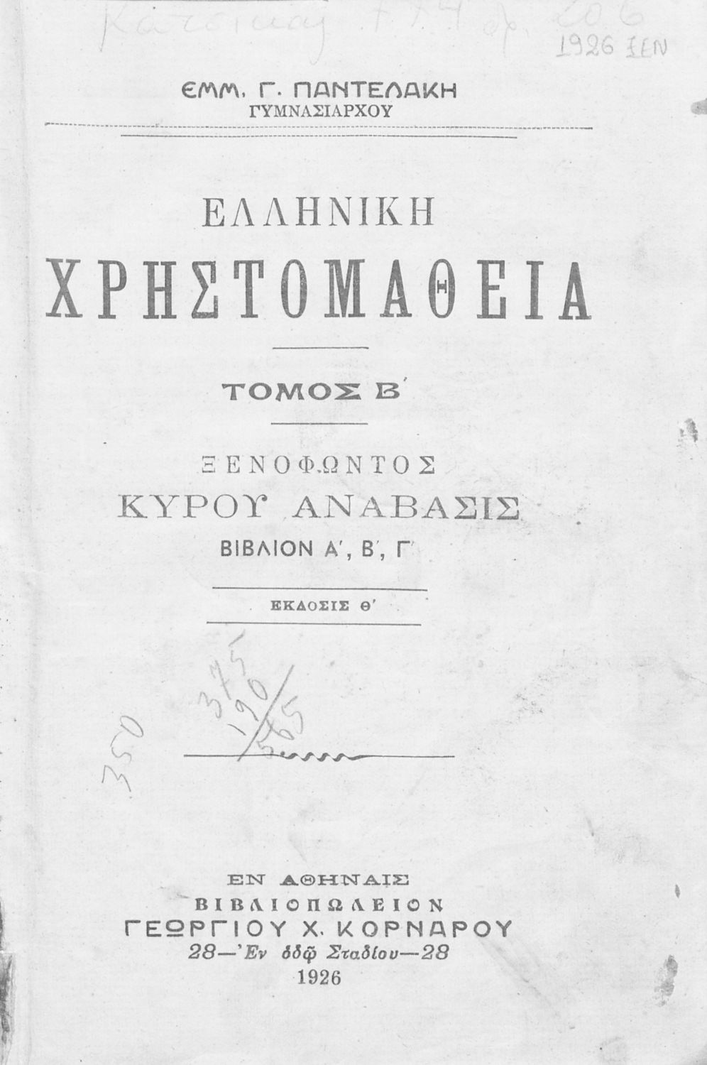Εκδότης: Βιβλιοπωλείο: Γεώργιος Χ. Κορνάρος Έτος έκδοσης: 1926 Τόπος έκδοσης: Αθήνα Έκδοση: 9η |