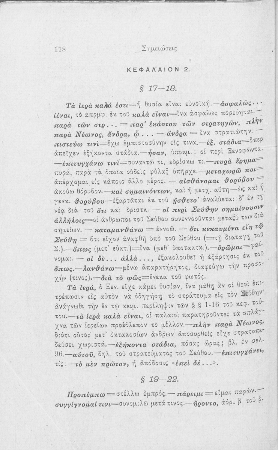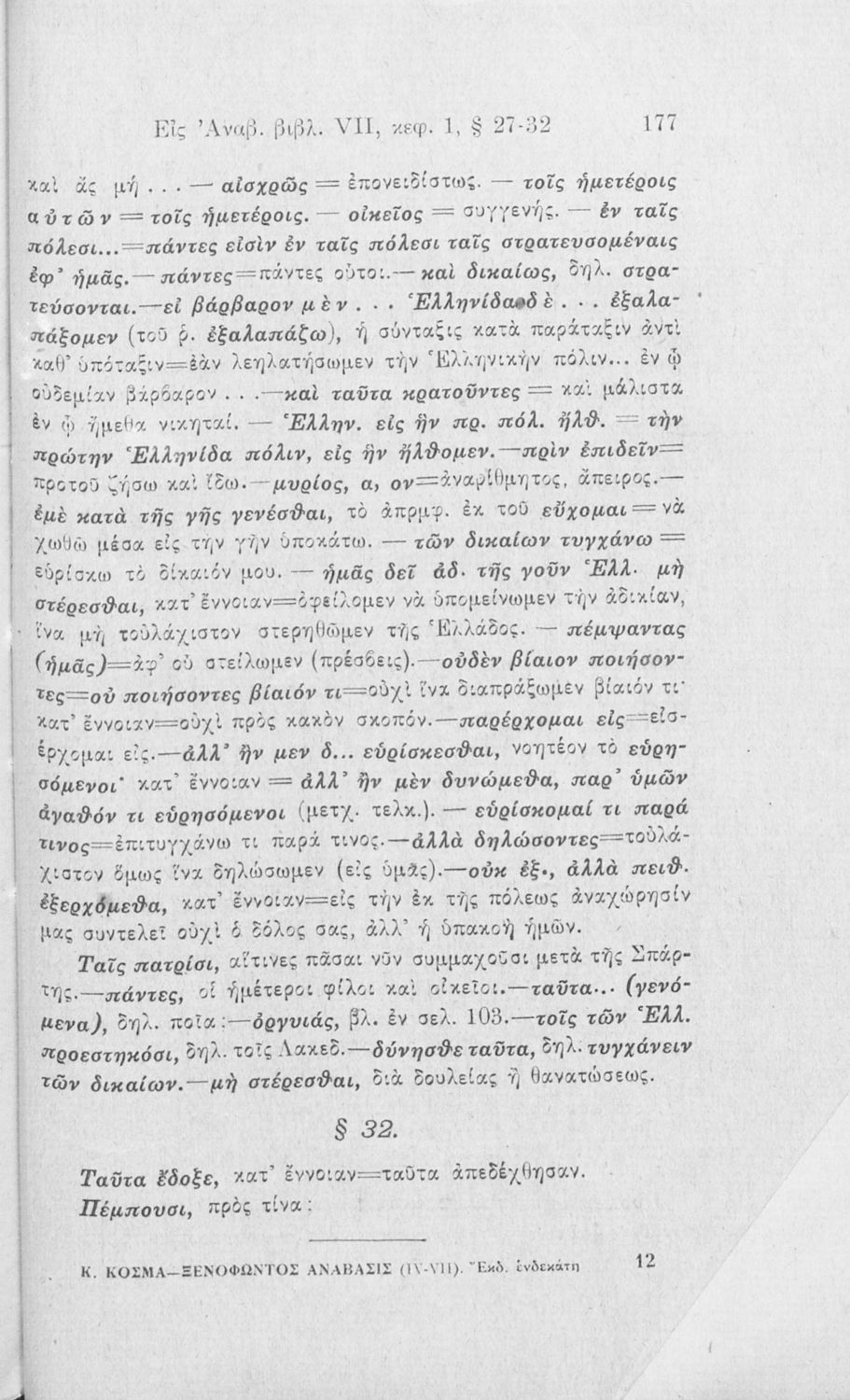 Σχολικό εγχειρίδιο Αρχαίων Ελληνικών για τις Γ΄ Ελληνικού Σχολείου και Α΄ Αστικού Σχολείου Θηλέων που περιλαμβάνει το έργο του Ξενοφώντα Κύρου Ανάβασις, ερμηνευτικά και πραγματολογικά σχόλια και λεξιλογικές παρατηρήσεις. Περιέχει και πίνακα κυρίων ονομάτων.