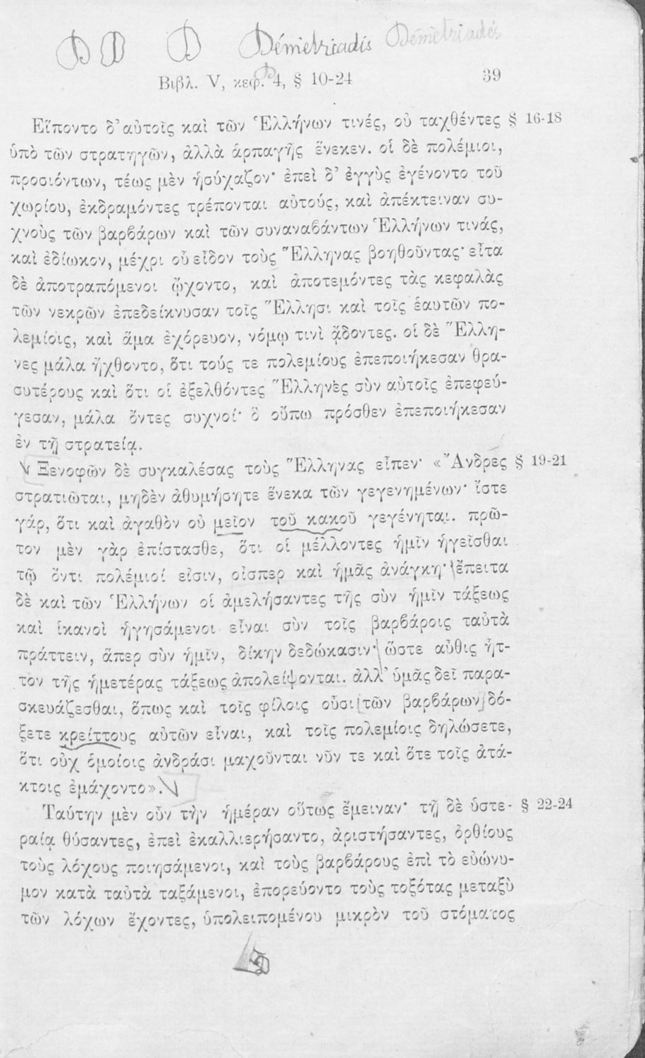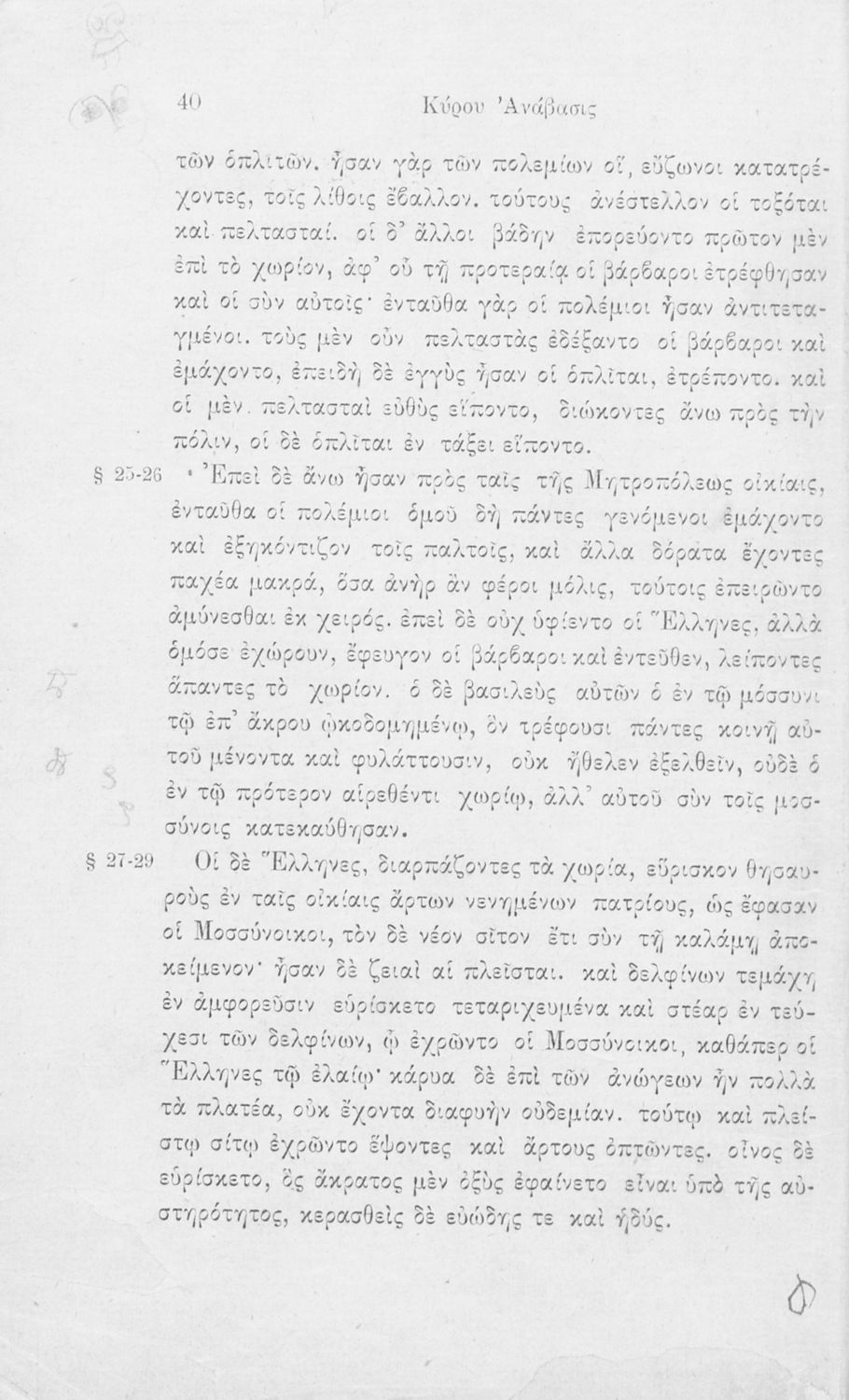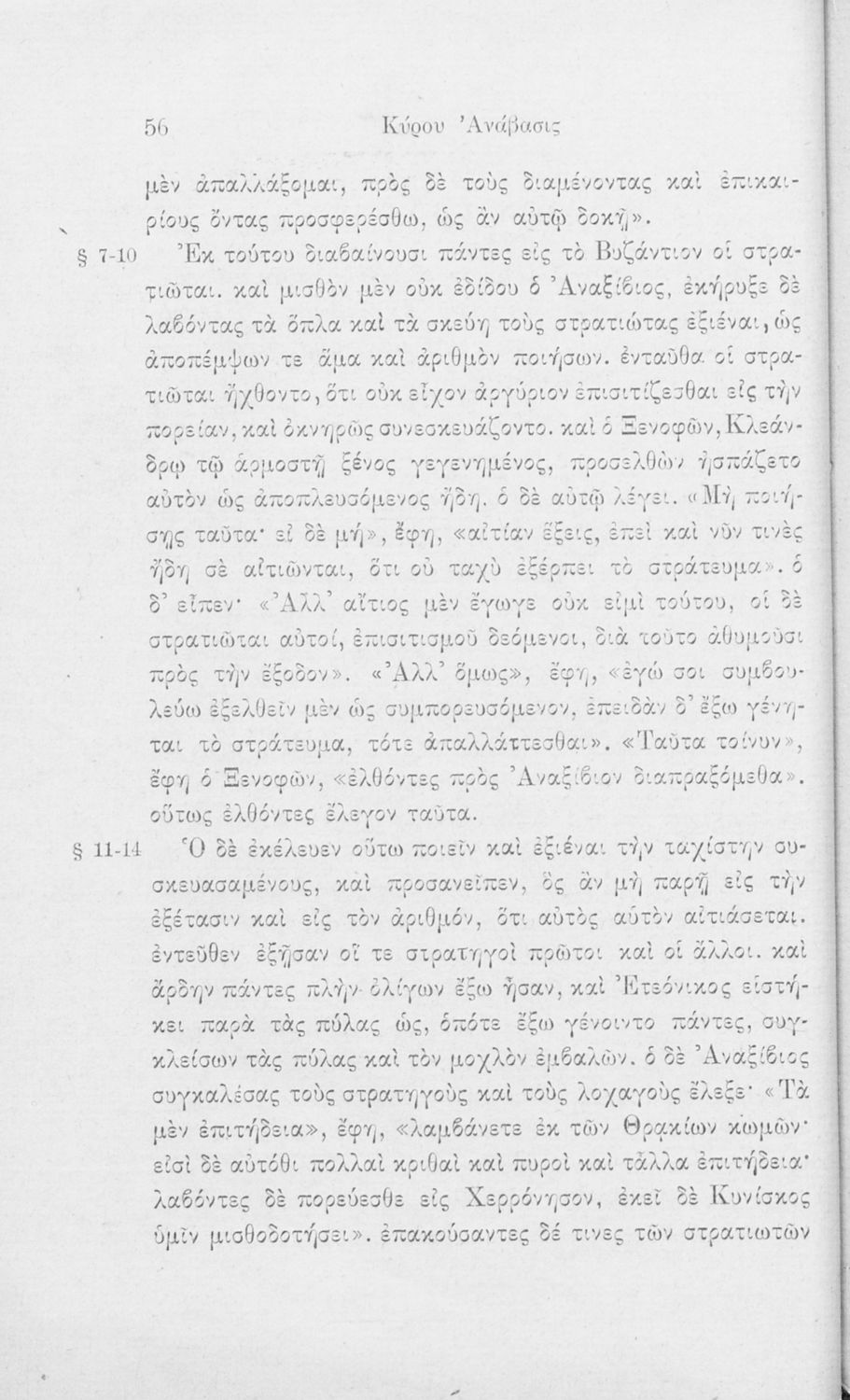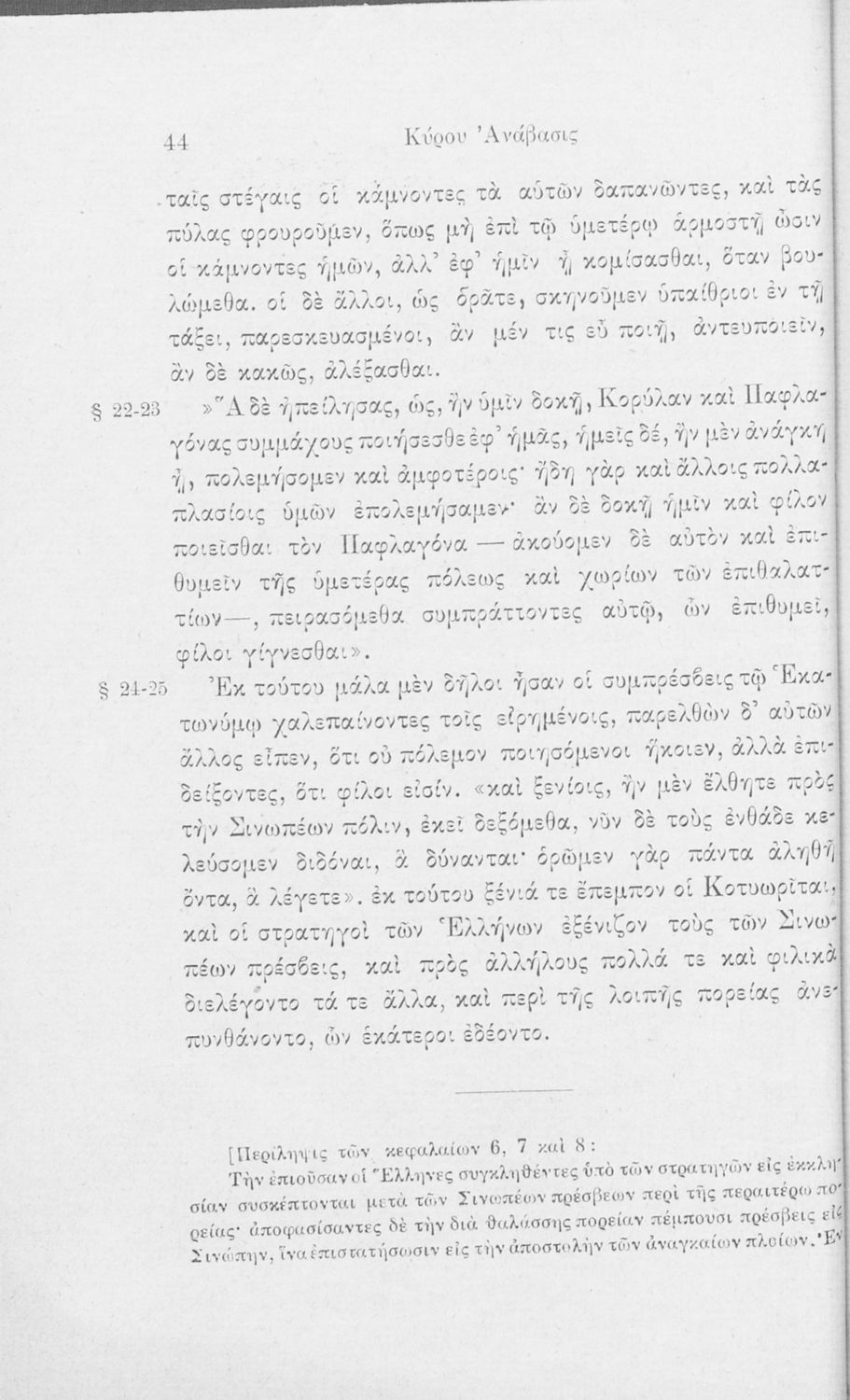 Σχολικό εγχειρίδιο της Γ' Ελληνικού Σχολείου και Αστικών Σχολείων για το μάθημα των Αρχαίων Ελληνικών. Το σύγγραμμα περιλαμβάνει κείμενα κατ΄ επιλογή από τα τέσσερα τελευταία βιβλία του έργου Κύρου Ανάβασις. ...