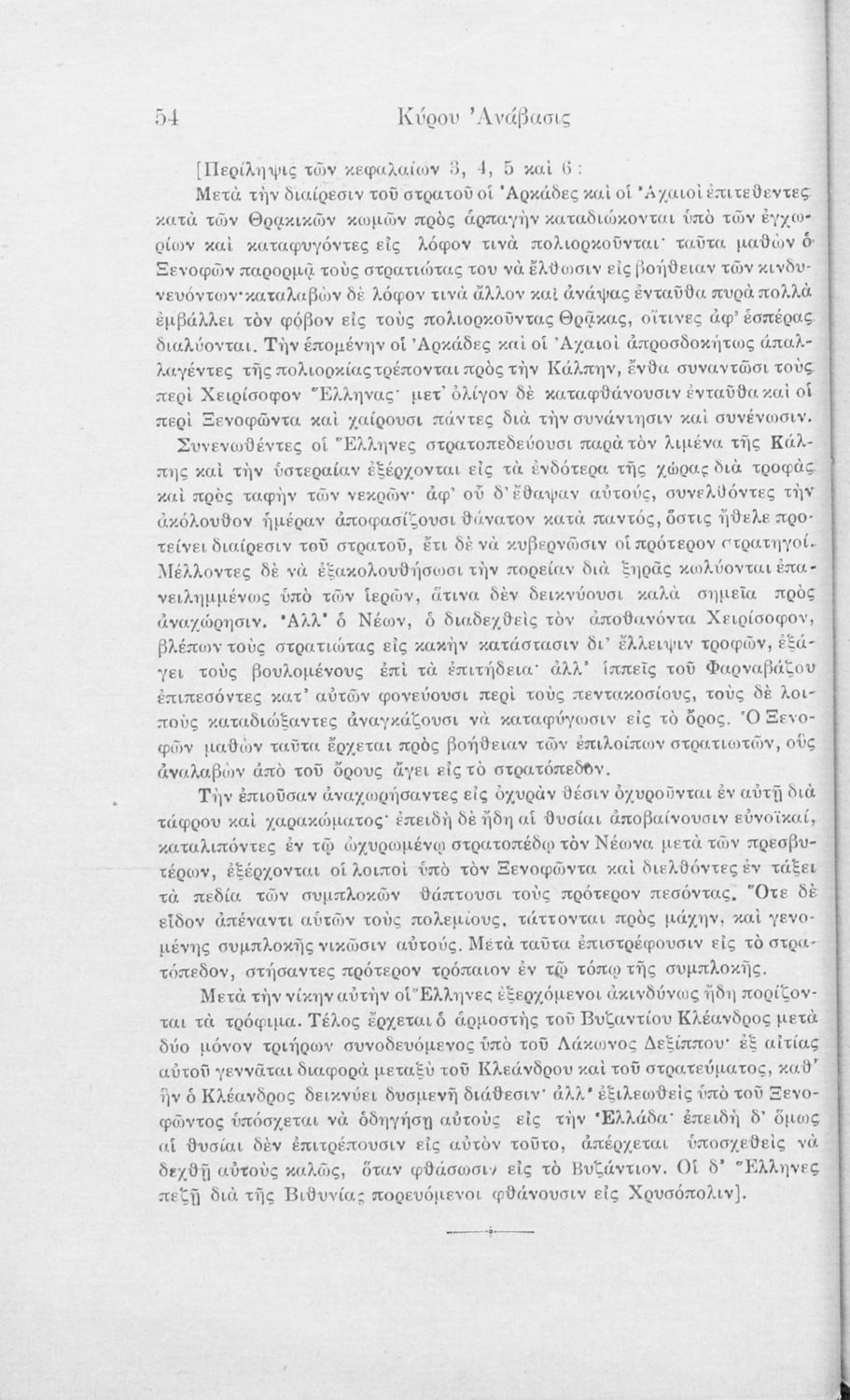 Σχολικό εγχειρίδιο Αρχαίων Ελληνικών για τις Γ΄ Ελληνικού Σχολείου και Α΄ Αστικού Σχολείου Θηλέων που περιλαμβάνει το έργο του Ξενοφώντα Κύρου Ανάβασις, ερμηνευτικά και πραγματολογικά σχόλια και λεξιλογικές παρατηρήσεις. Περιέχει και πίνακα κυρίων ονομάτων.