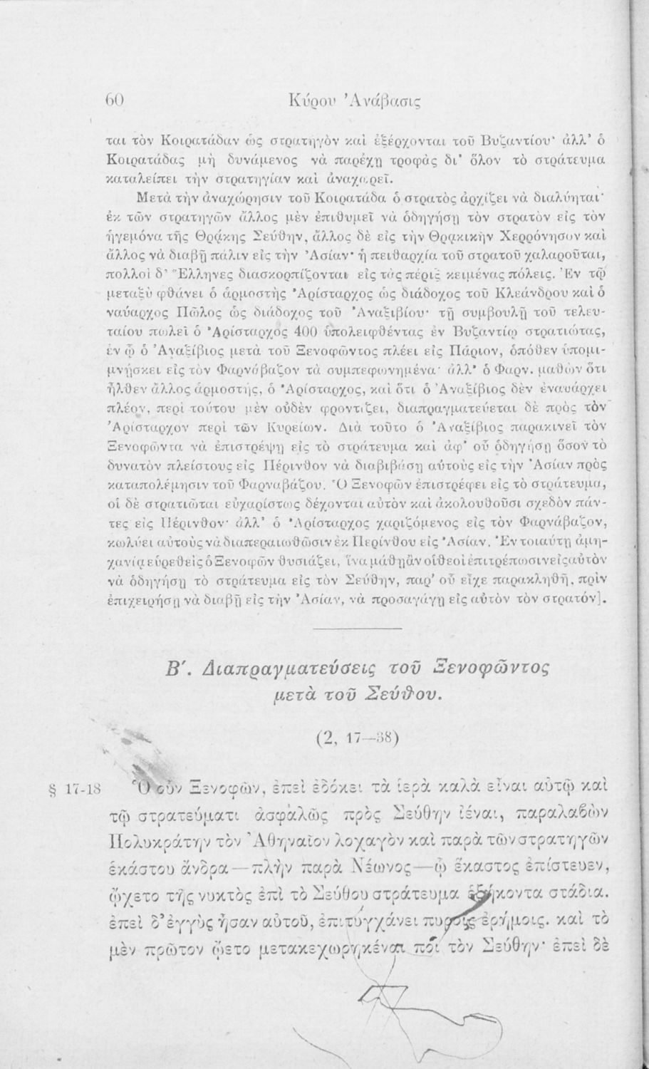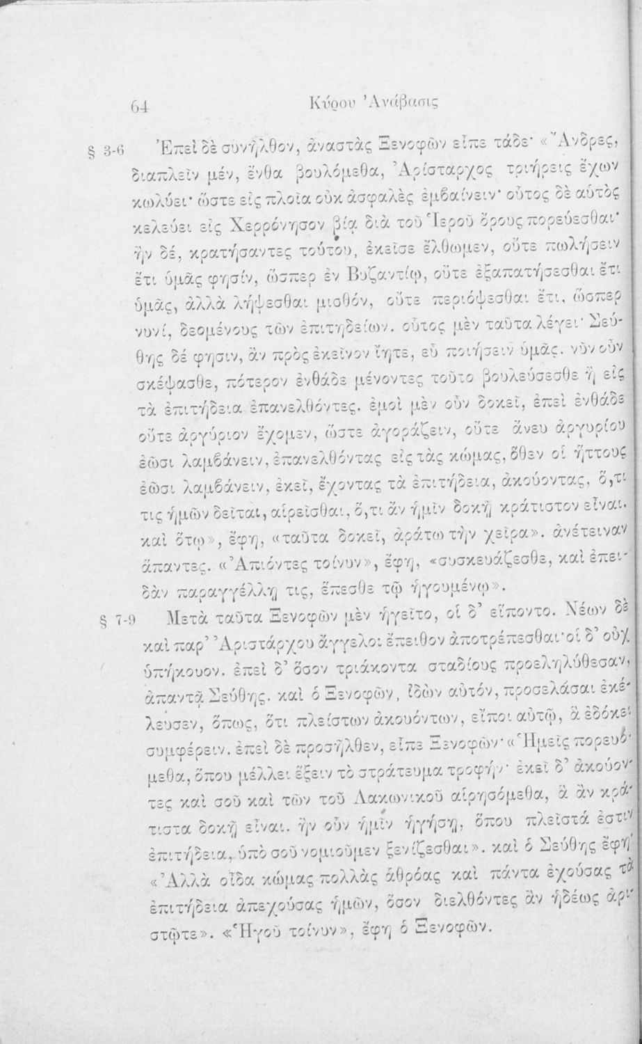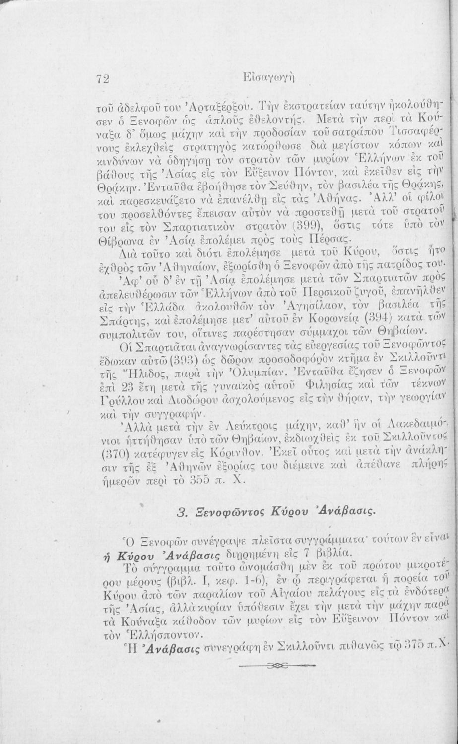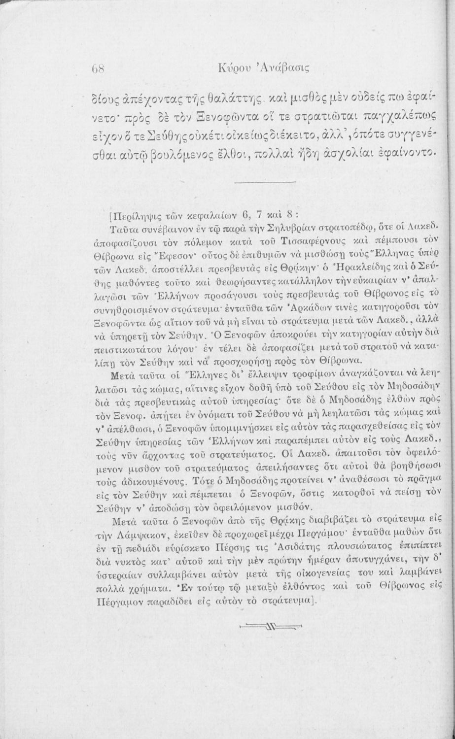 Σχολικό εγχειρίδιο Αρχαίων Ελληνικών για τις Γ΄ Ελληνικού Σχολείου και Α΄ Αστικού Σχολείου Θηλέων που περιλαμβάνει το έργο του Ξενοφώντα Κύρου Ανάβασις, ερμηνευτικά και πραγματολογικά σχόλια και λεξιλογικές παρατηρήσεις. Περιέχει και πίνακα κυρίων ονομάτων.