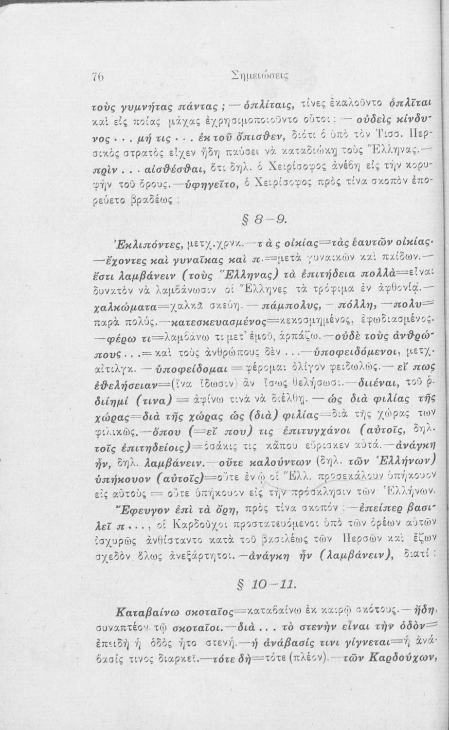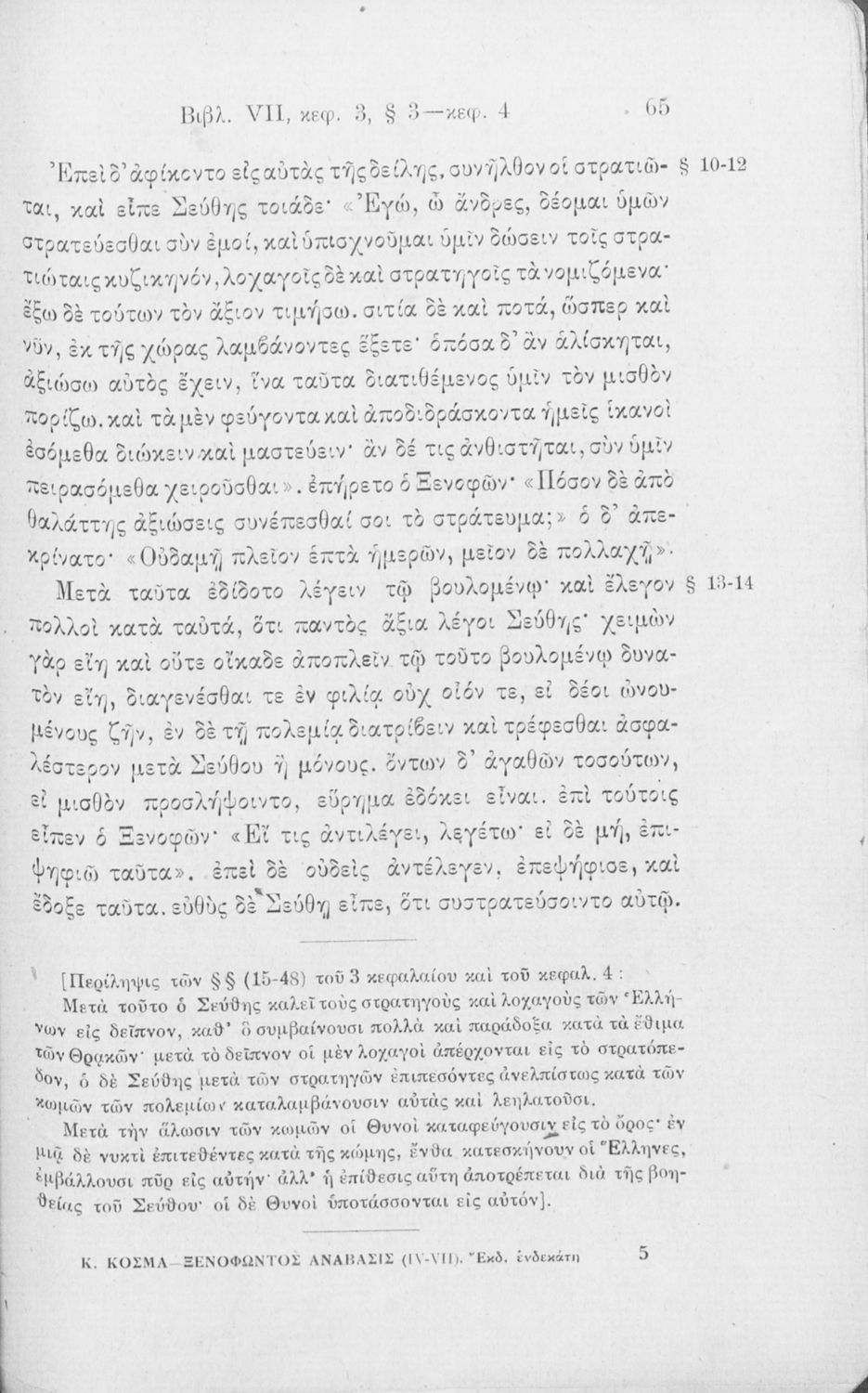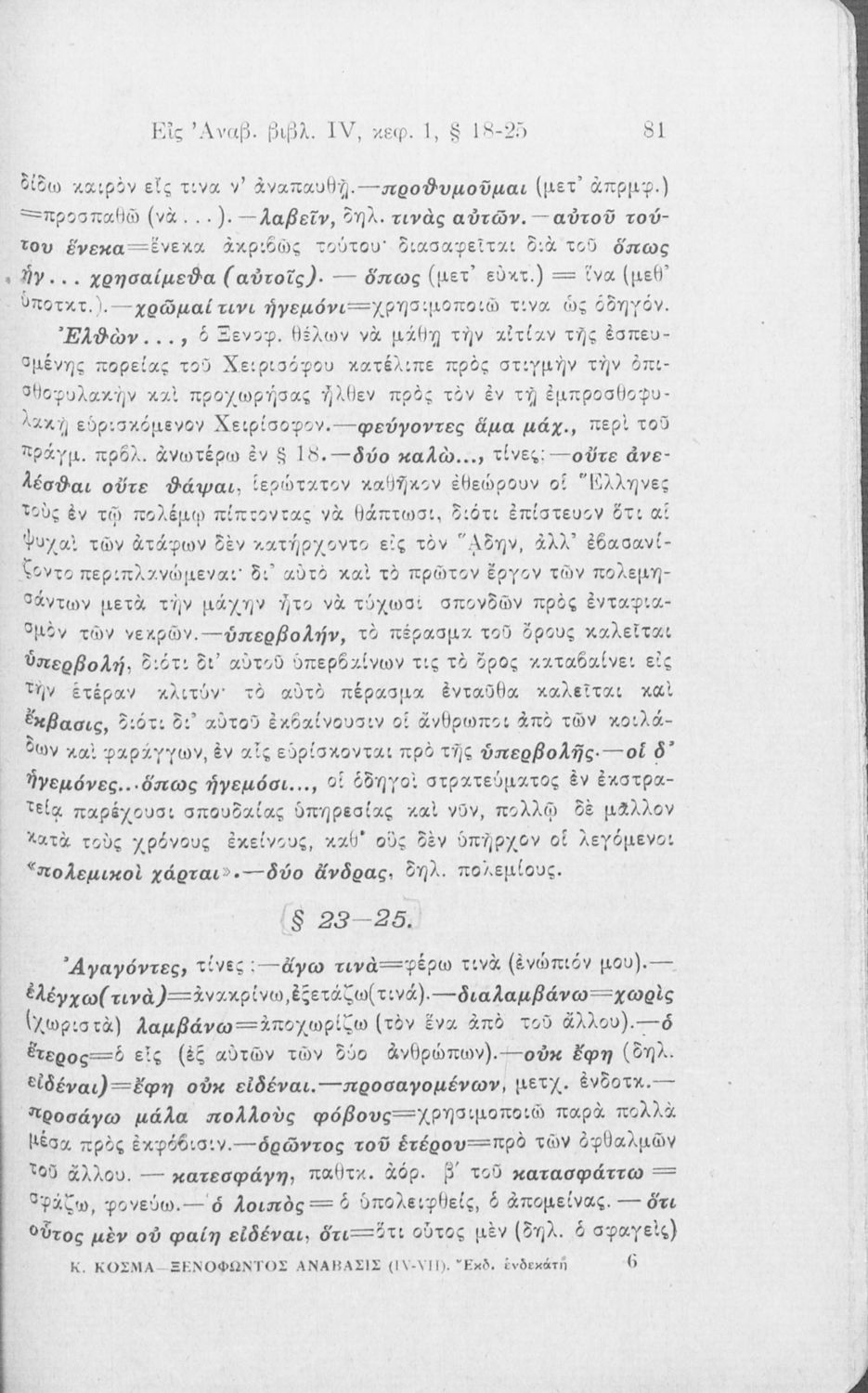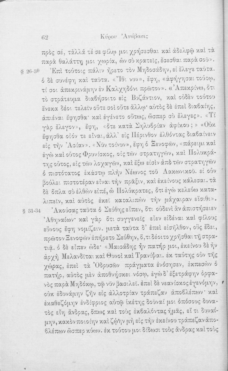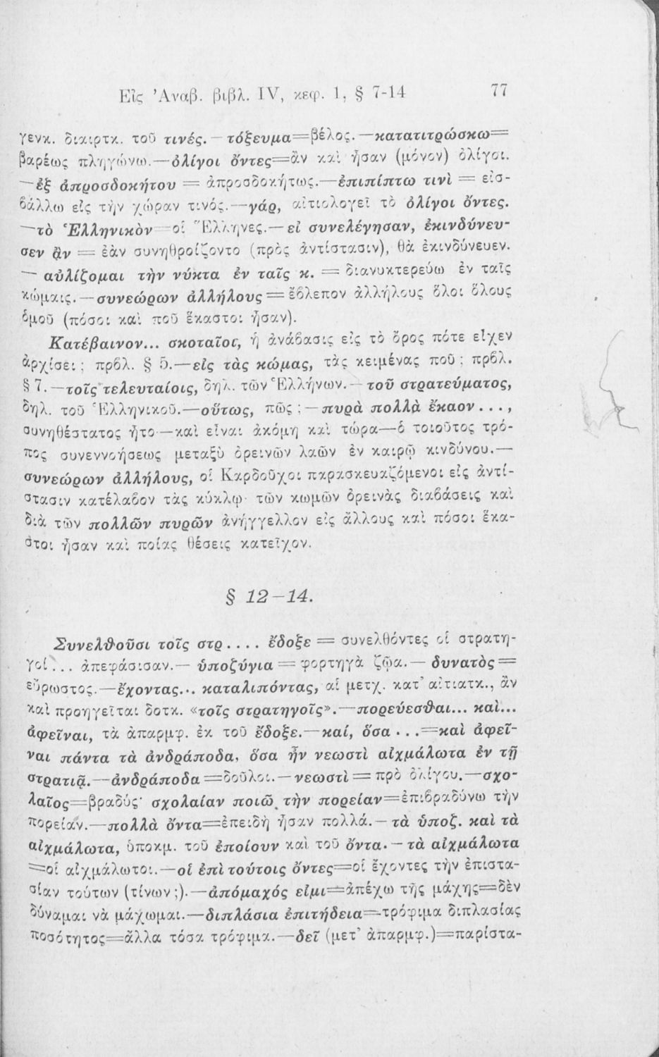 Σχολικό εγχειρίδιο Αρχαίων Ελληνικών για τις Γ΄ Ελληνικού Σχολείου και Α΄ Αστικού Σχολείου Θηλέων που περιλαμβάνει το έργο του Ξενοφώντα Κύρου Ανάβασις, ερμηνευτικά και πραγματολογικά σχόλια και λεξιλογικές παρατηρήσεις. Περιέχει και πίνακα κυρίων ονομάτων.