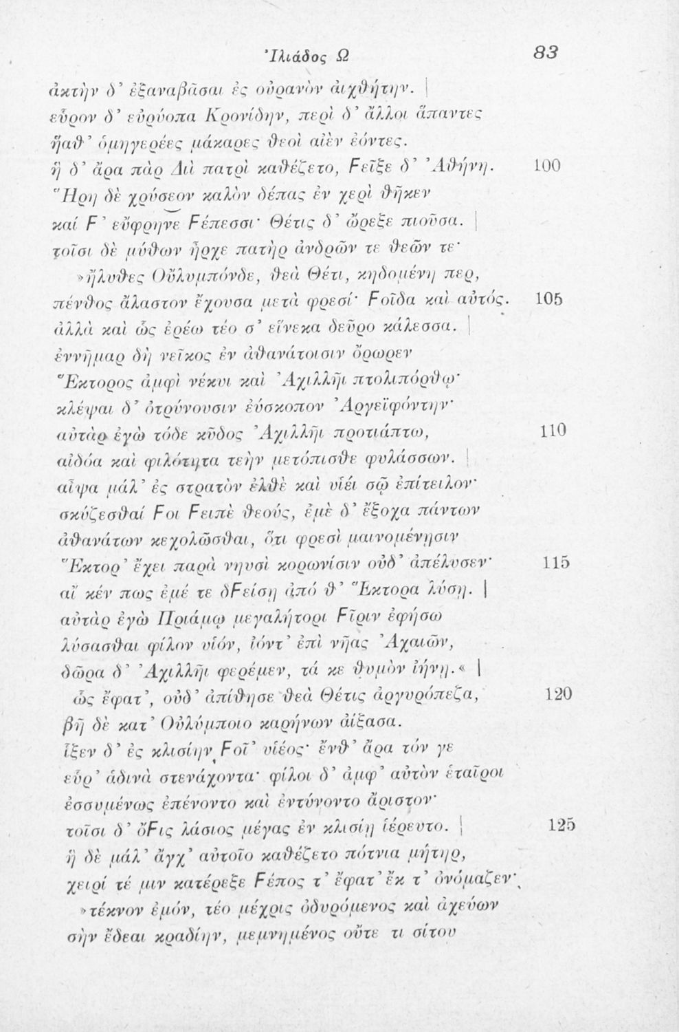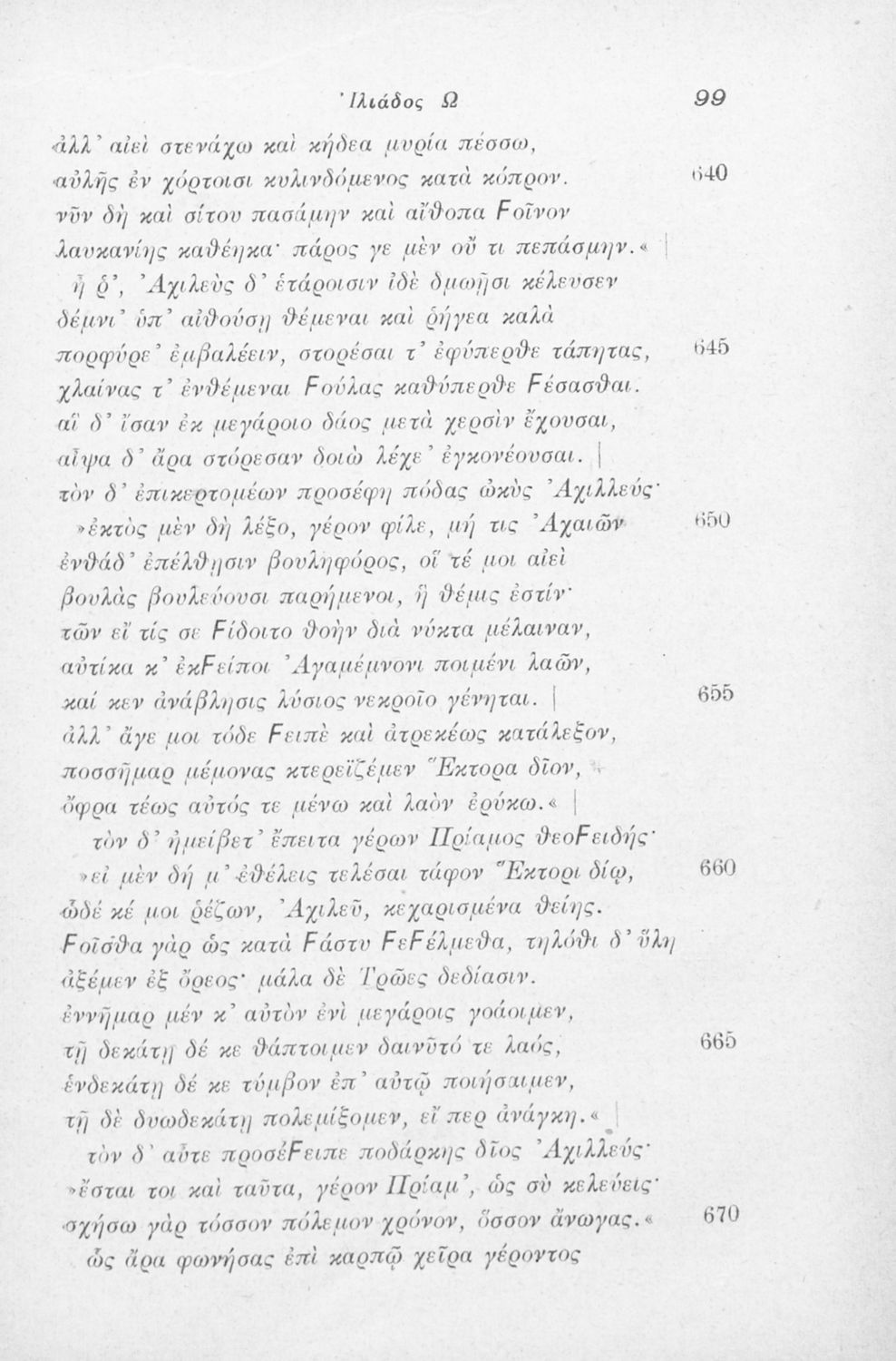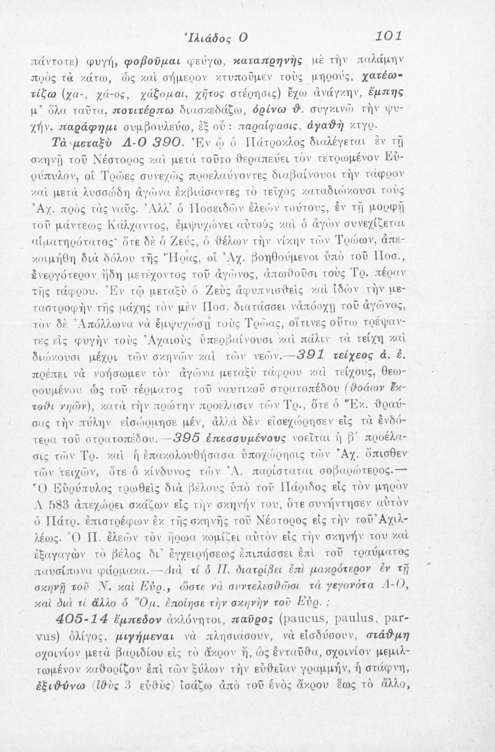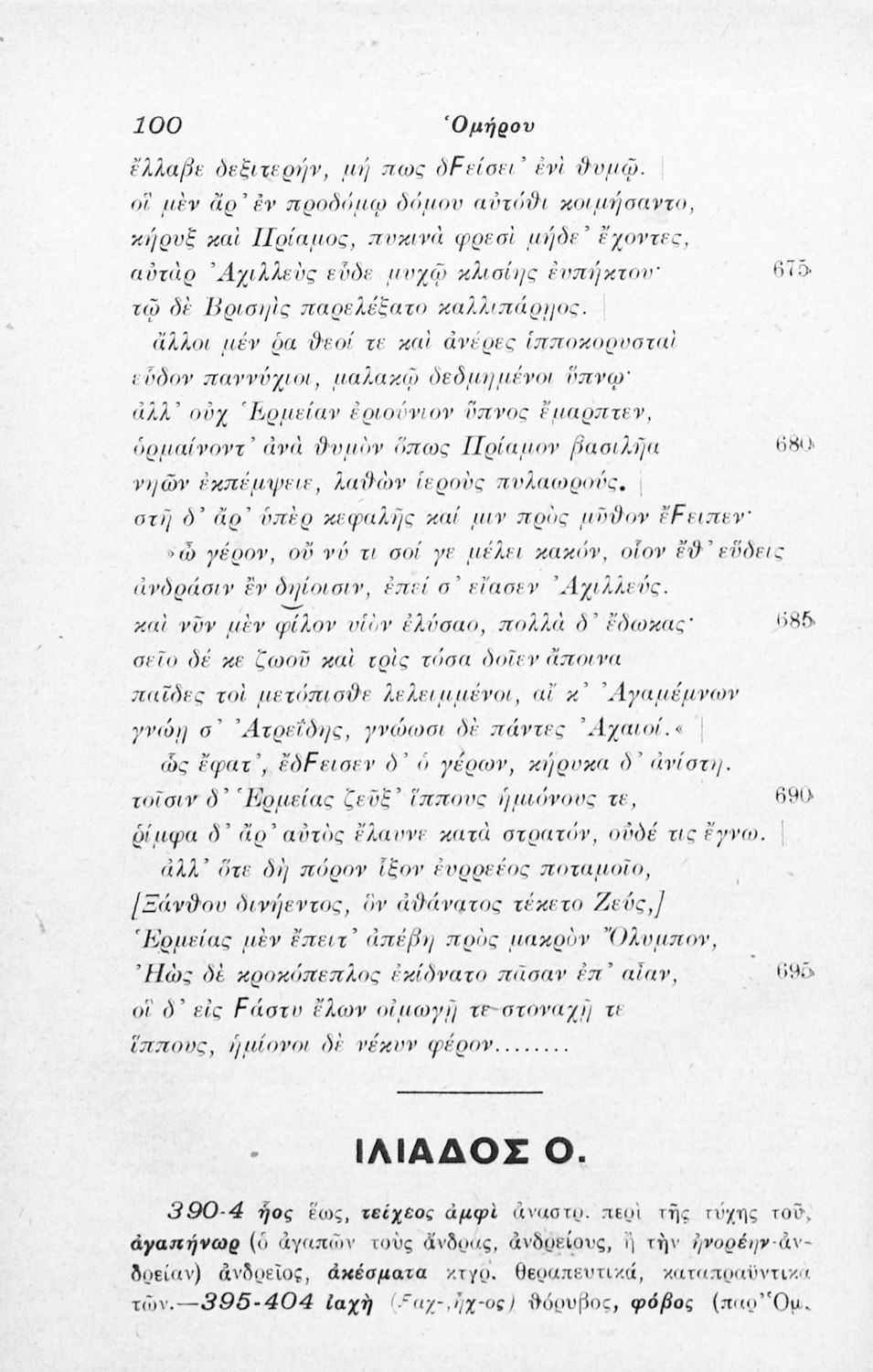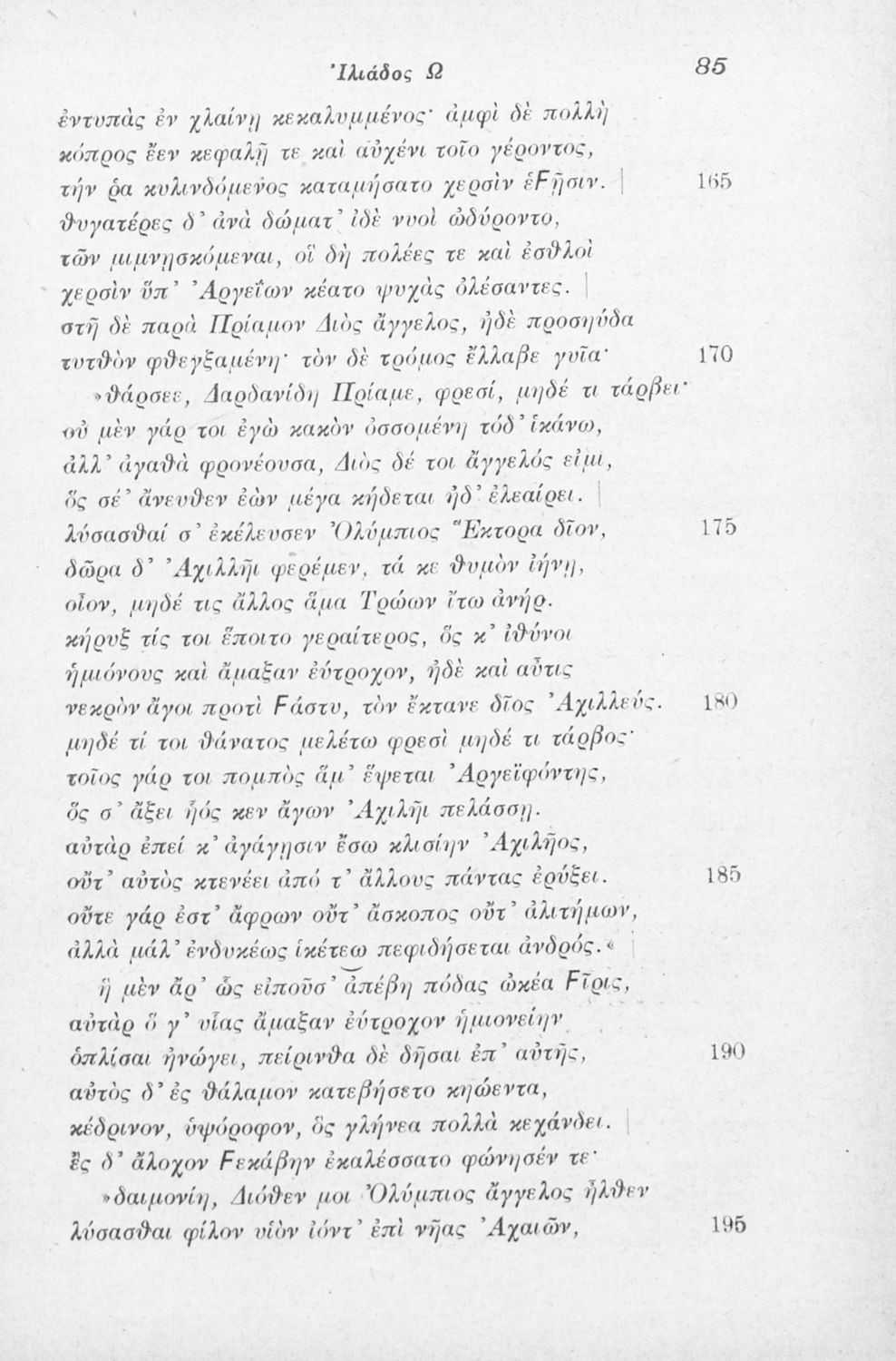 Μαθητικό βοήθημα του Ελληνικού Σχολείου, των Παρθεναγωγείων και του Γυμνασίου για το μάθημα των Αρχαίων Ελληνικών. Περιέχει τις ραψωδίες Ο, Π, Ρ, Σ, Τ, Χ, ψ, Ω από το πρωτότυπο με σχόλια και ερμηνευτικές ...