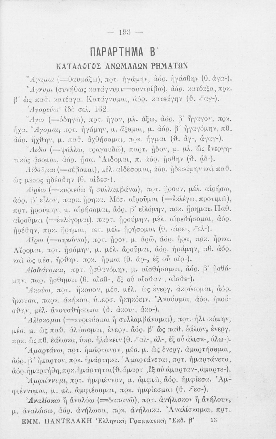 Μαθητικό βοήθημα Αρχαίων Ελληνικών για τα Ελληνικά Σχολεία, Παρθεναγωγεία και Γυμνάσια που περιλαμβάνει γραμματική της αρχαίας ελληνικής και κατάλογο ανωμάλων ρημάτων.