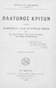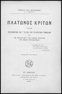 Κωδικός αναγνώρισης: 02-01751 Τίτλος: Πλάτωνος Κρίτων χάριν των μαθητών της Γ΄ τάξεως των Τετραταξίων Γυμνασίων και της αντιστοίχου των λοιπών σχολείων της Μέσης Εκπαιδεύσεως Συγγραφέας: Πλάτων, Νικόλαος Σ. Μπαξεβανάκις (σχόλια) Μέγεθος και υπόστρωμα: Μαθητικό βοήθημα, μαλακό εξώφυλλο, 70 σελίδες. |