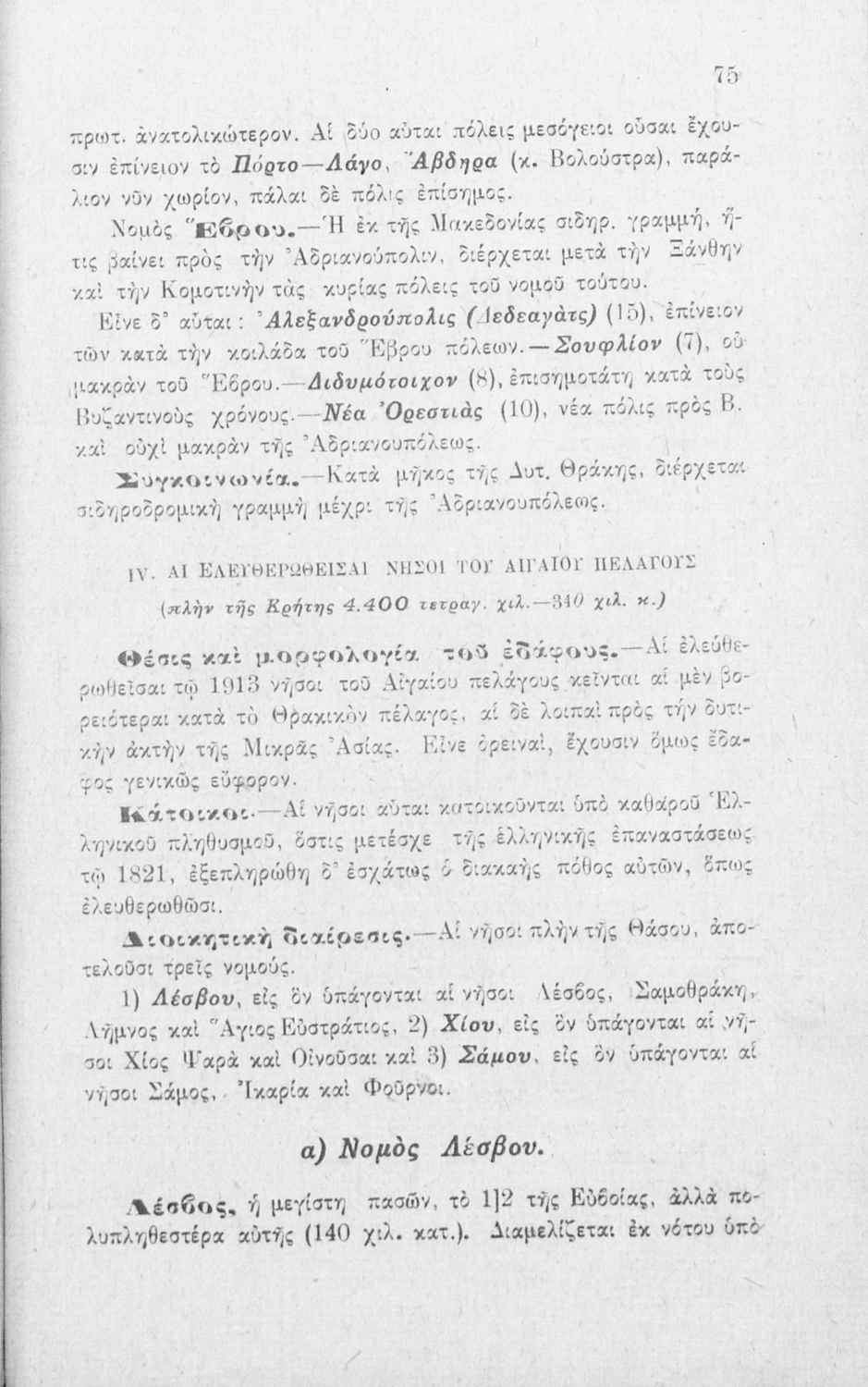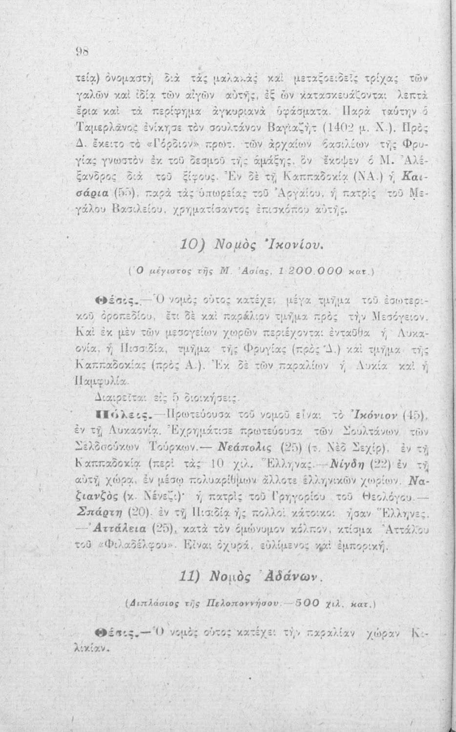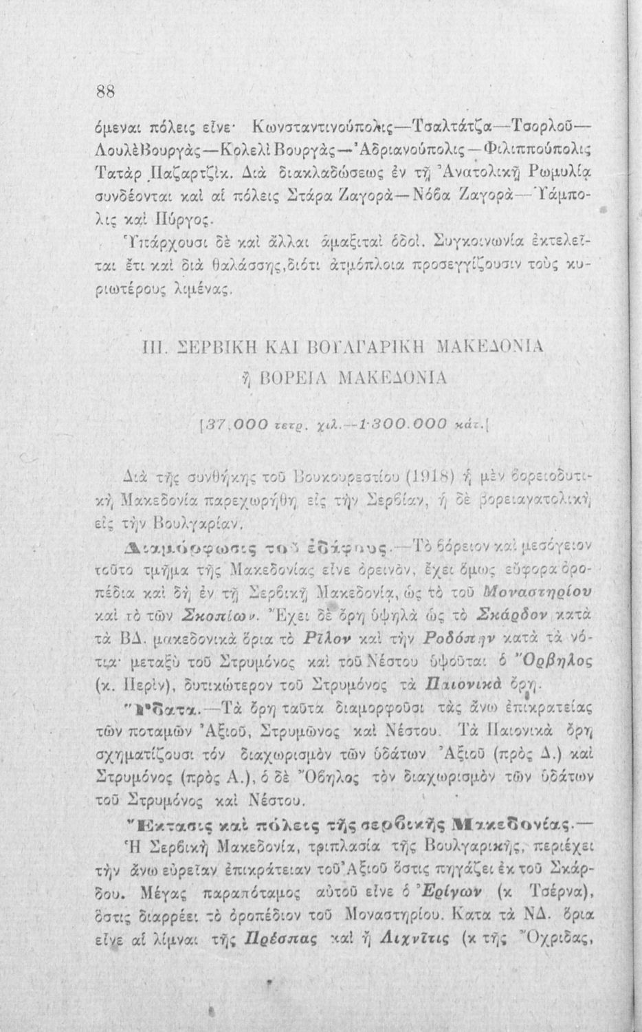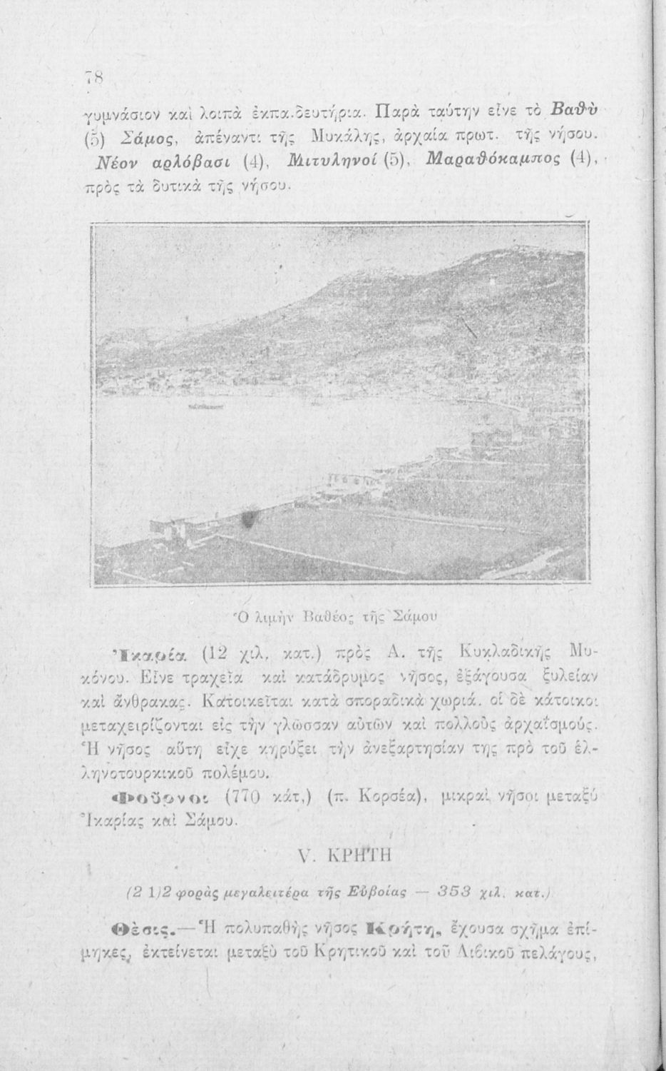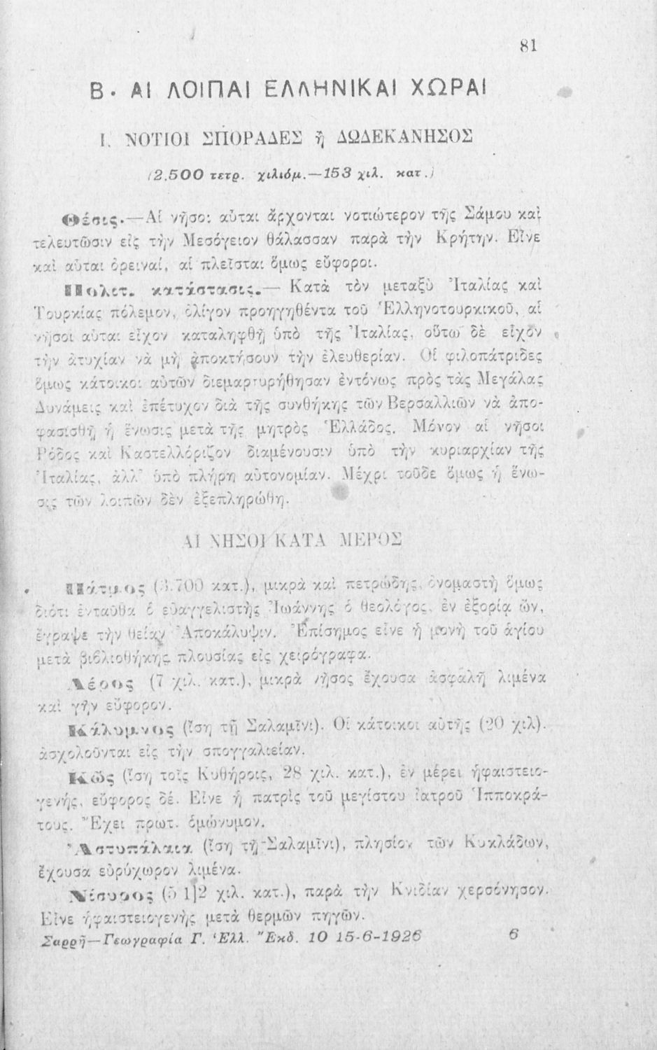 Σχολικό εγχειρίδιο Γεωγραφίας Γ΄ Ελληνικού Σχολείου που αποτελεί μια γενική επισκόπηση της Ελλάδας ανά διαμέρισμα και νομό. Περιέχει και ειδικό κεφάλαιο για τις "λοιπές ελληνικές χώρες" στις οποίες περιλαμβάνονται τα Δωδεκάνησα, η Τουρκική Θράκη, η Ανατολική Ρωμυλία, η Σερβική και Βουλγαρική Μακεδονία, η Μικρά Ασία, η Συρία, η Παλαιστίνη, και η Κύπρος.