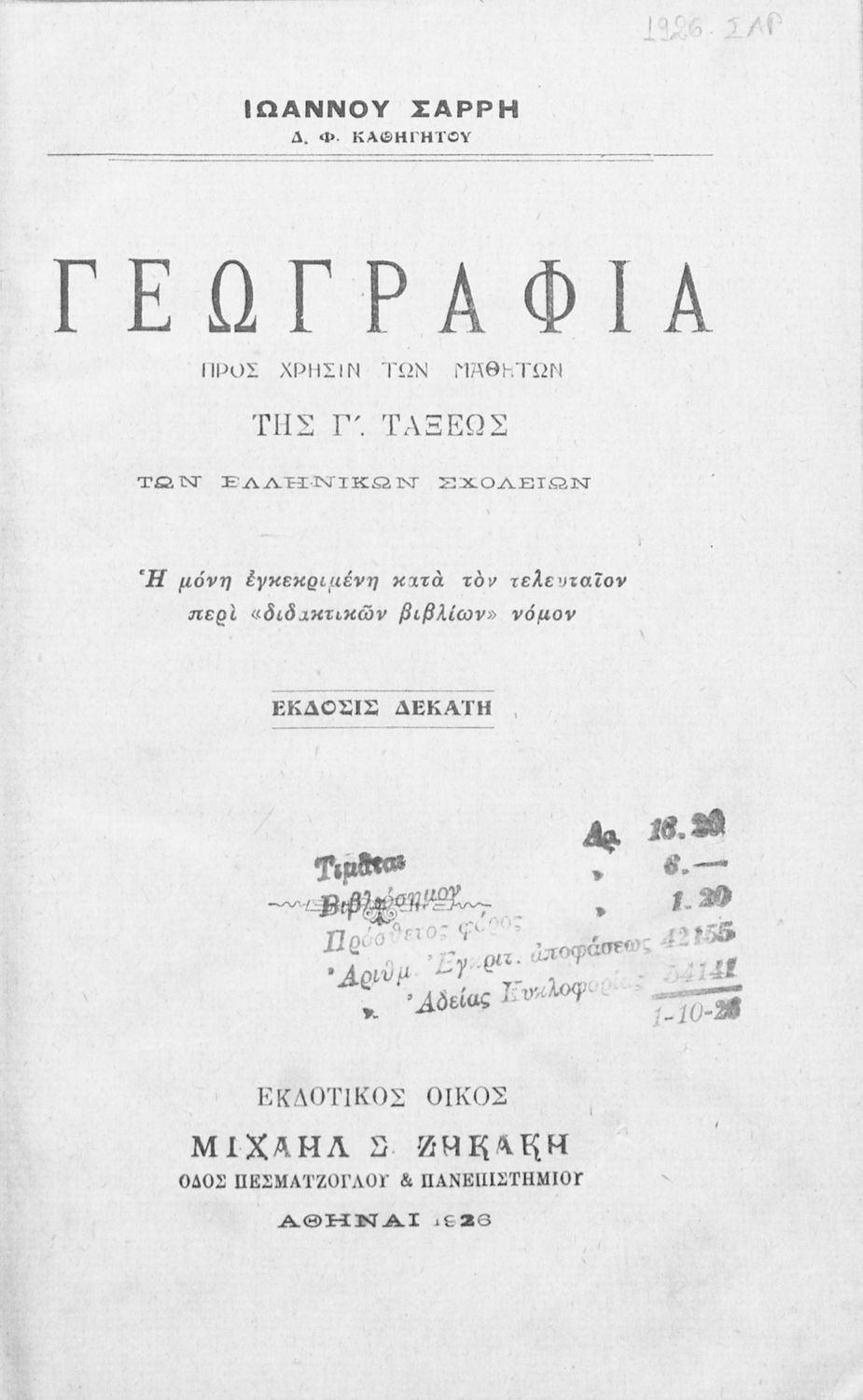 Εκδότης: Μιχ. Ζηκάκης Έτος έκδοσης: 1926 Τόπος έκδοσης: Αθήνα Έκδοση: 10η |