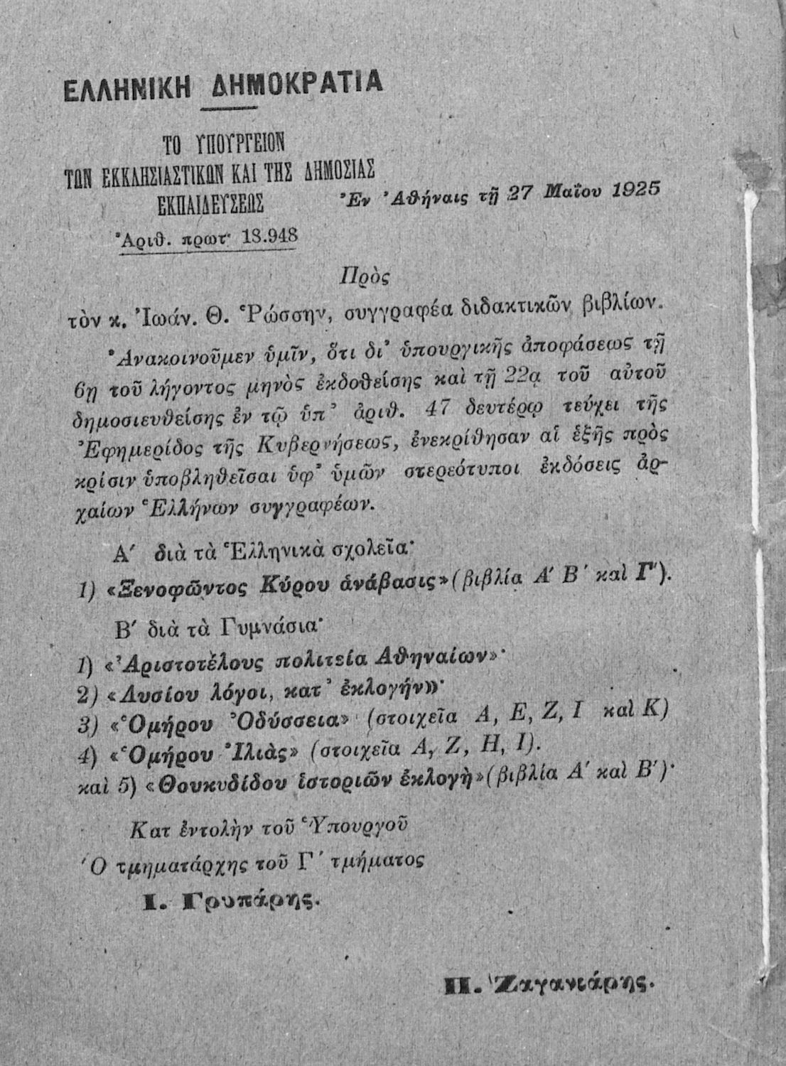 Εκδότης: Ιωάννης Θ. Ρώσσης Έτος έκδοσης: 1925 Τόπος έκδοσης: Αθήνα Υπουργική απόφαση / Σύμβαση: 18948/27-5-1925 |