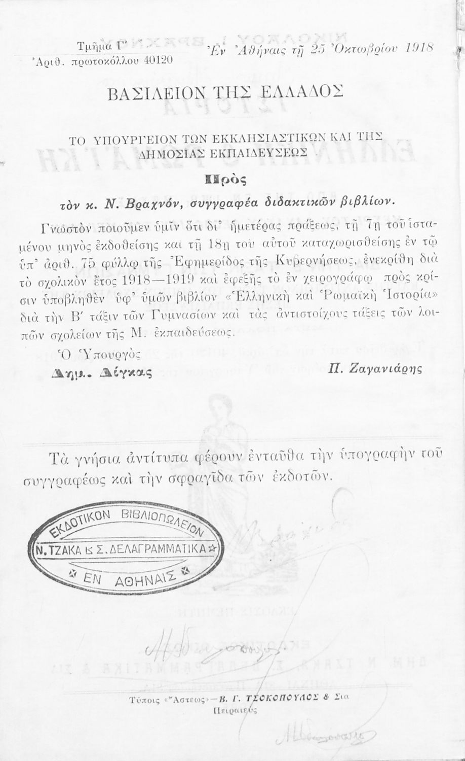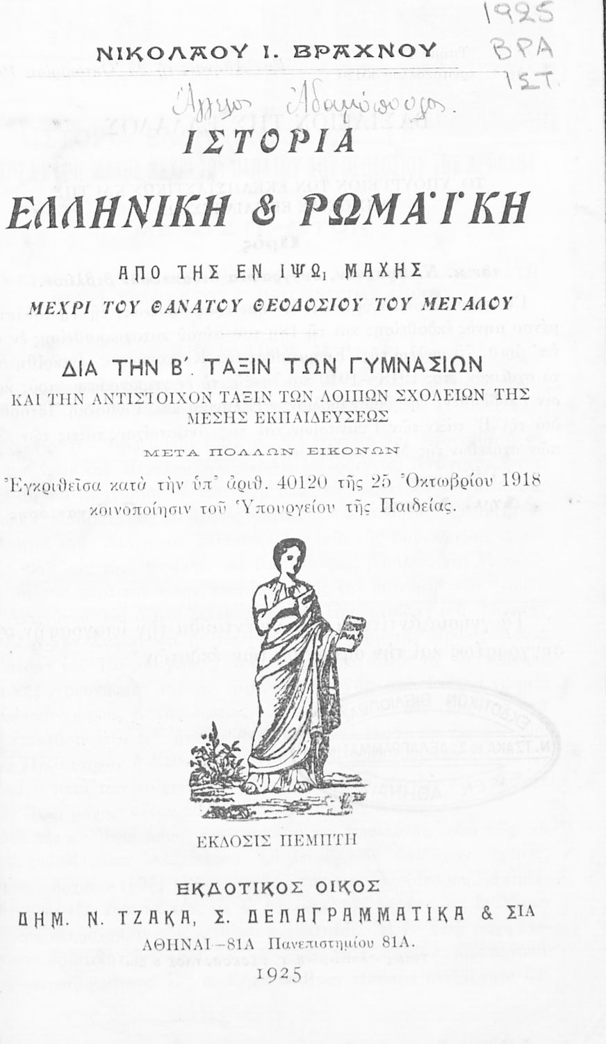 Εκδότης: Δημ. Ν. Τζάκας, Στεφ. Δελαγραμμάτικας Έτος έκδοσης: 1925 Τόπος έκδοσης: Αθήνα Έκδοση: 5η Υπουργική απόφαση / Σύμβαση: 40120/25-10-1918 Έτος έγκρισης: 1918 |