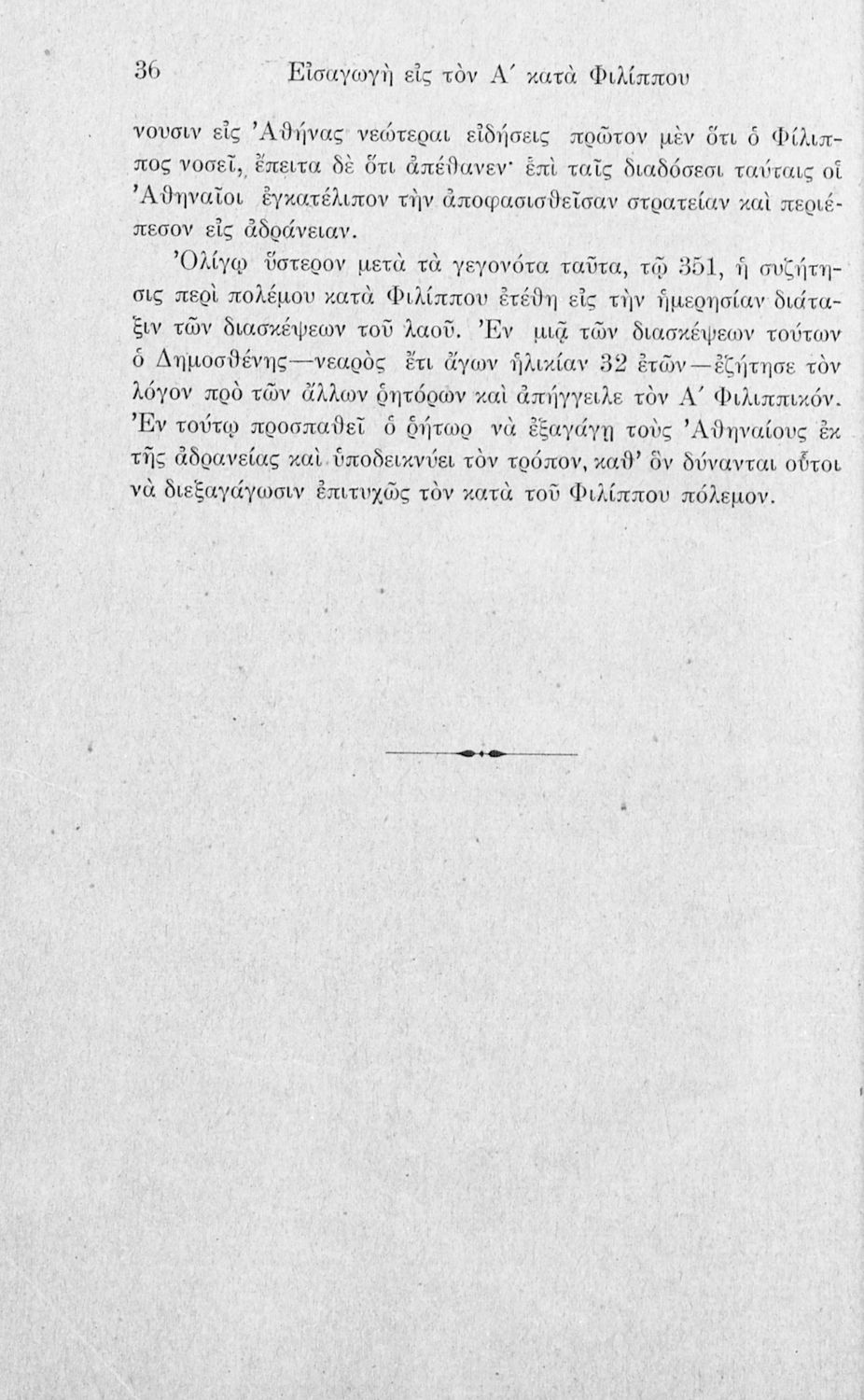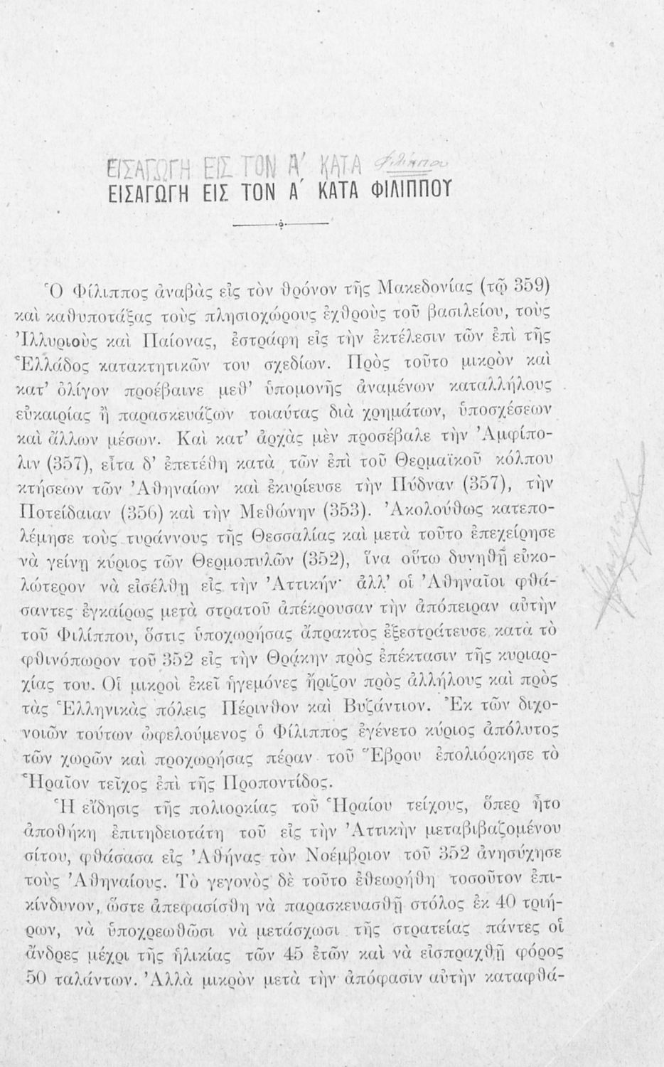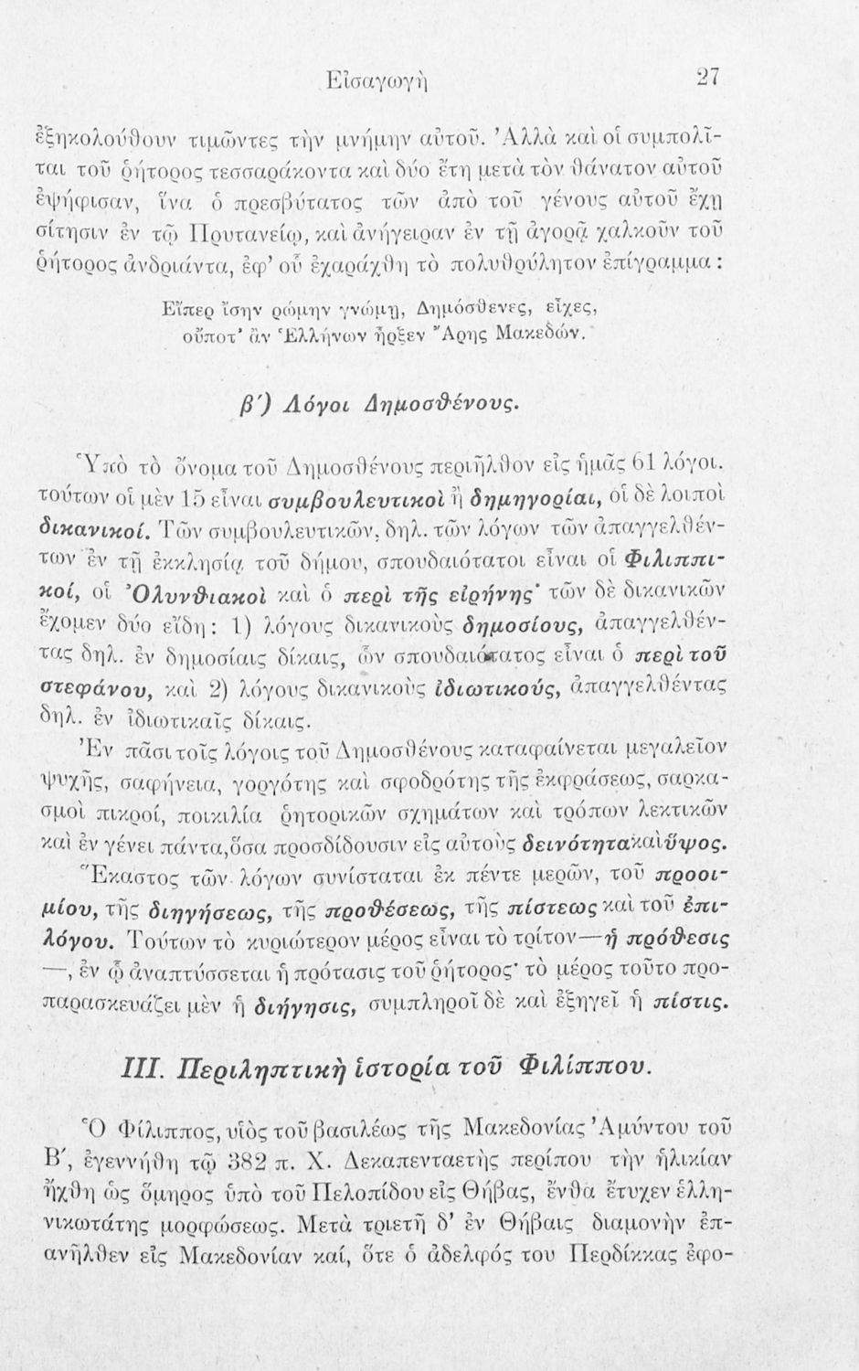 Σχολικό εγχειρίδιο Αρχαίων Ελληνικών Γ΄ Γυμνασίου που περιλαμβάνει τον Λόγο του Δημοσθένη Α΄ κατά Φιλίππου, εισαγωγικά σχόλια για το έργο και τον ζωή του Δημοσθένη, ερμηνευτικά και γραμματικά σχόλια και παρατηρήσεις.