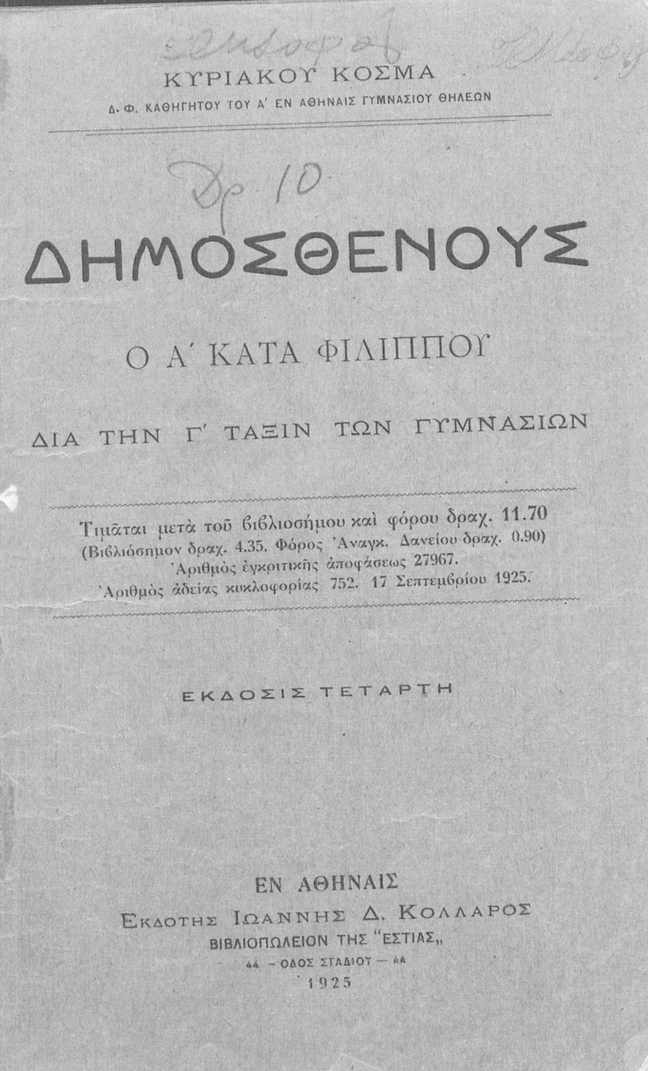 Εκδότης: Ιωάννης Δ. Κολλάρος Έτος έκδοσης: 1925 Τόπος έκδοσης: Αθήνα Έκδοση: 4η Υπουργική απόφαση / Σύμβαση: 27967/30-9-1917 |
