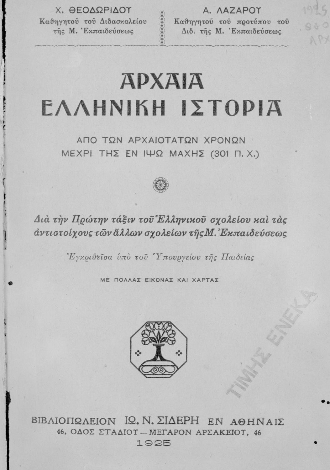 Τίτλος: Ελληνική ιστορία από της εν Ιψώ μάχης (301 π.Χ.) μέχρι της αλώσεως της Κων/πόλεως υπό των Φράγκων (1204 μ.Χ.) δια την Δευτέραν τάξιν του Ελληνικού Σχολείου και τας αντιστοίχους των άλλων σχολείων της Μέσης Εκπαιδεύσεως