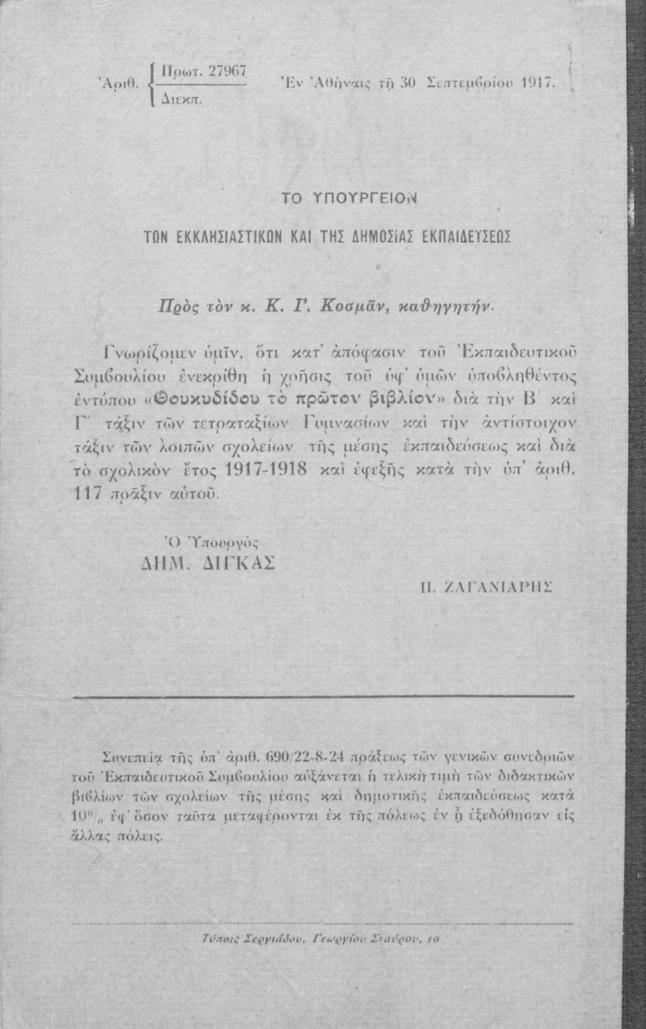 Τίτλος: Θουκυδίδου το πρώτον βιβλίον κατ' εκλογήν εκδοθέν διά την Β΄ και Γ΄ τάξιν των Γυμνασίων