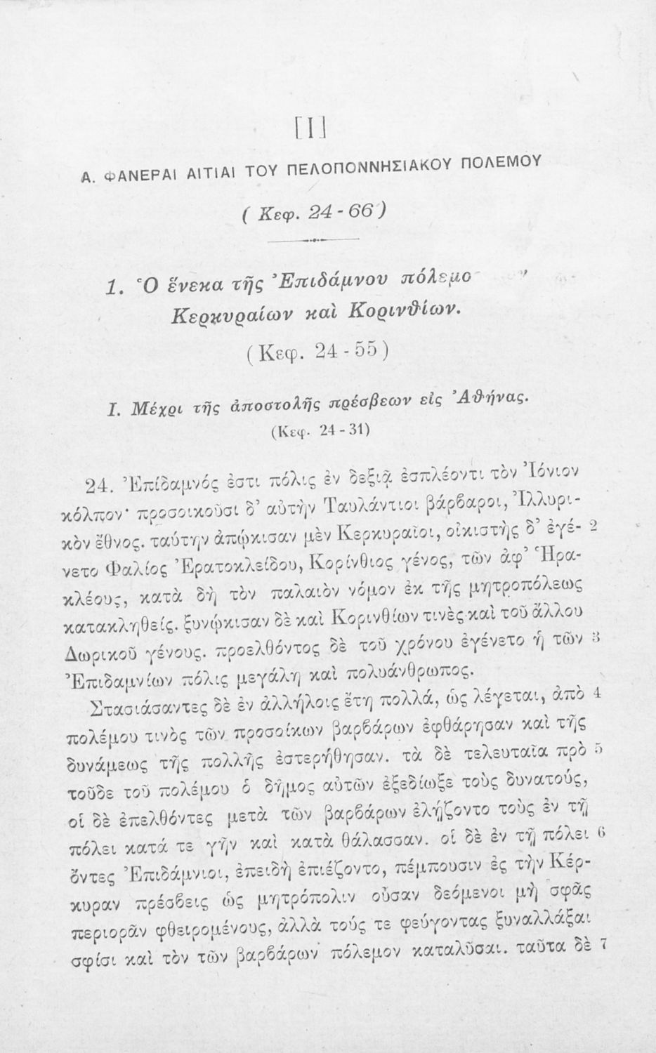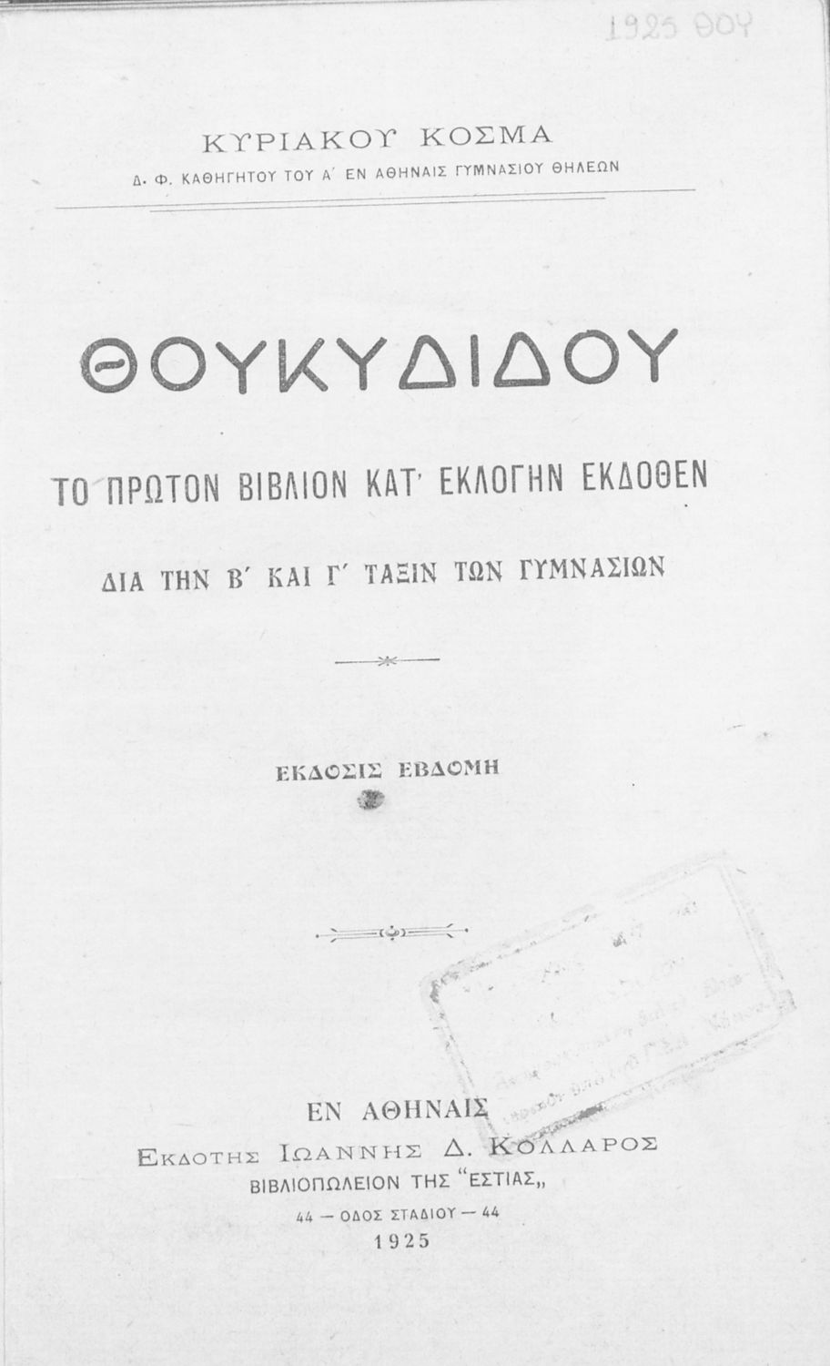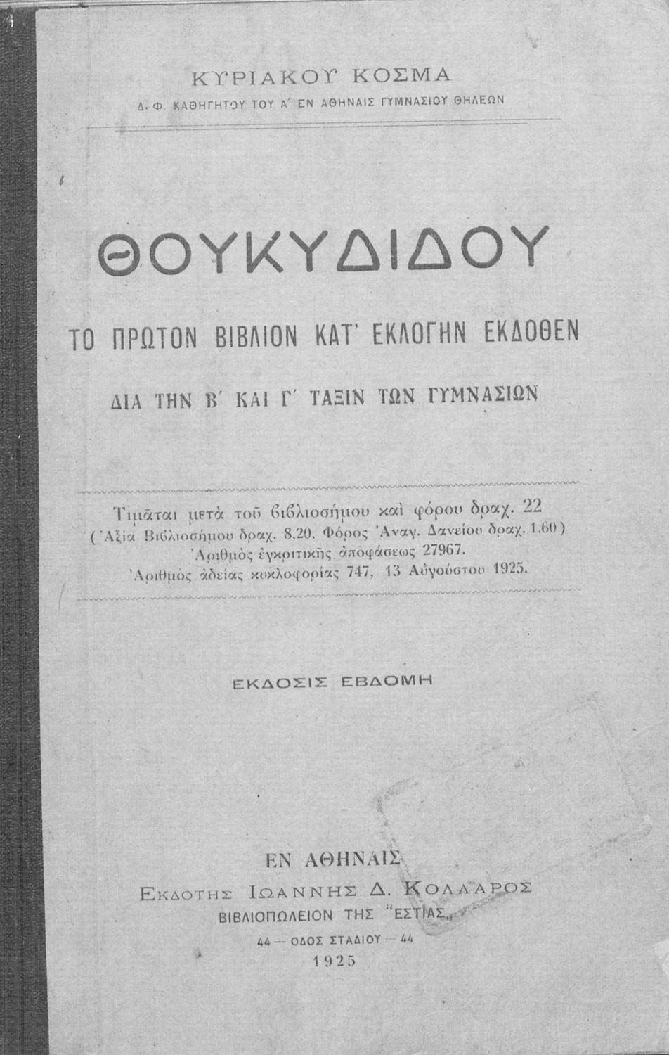 Τίτλος: Θουκυδίδου το πρώτον βιβλίον κατ' εκλογήν εκδοθέν διά την Β΄ και Γ΄ τάξιν των Γυμνασίων