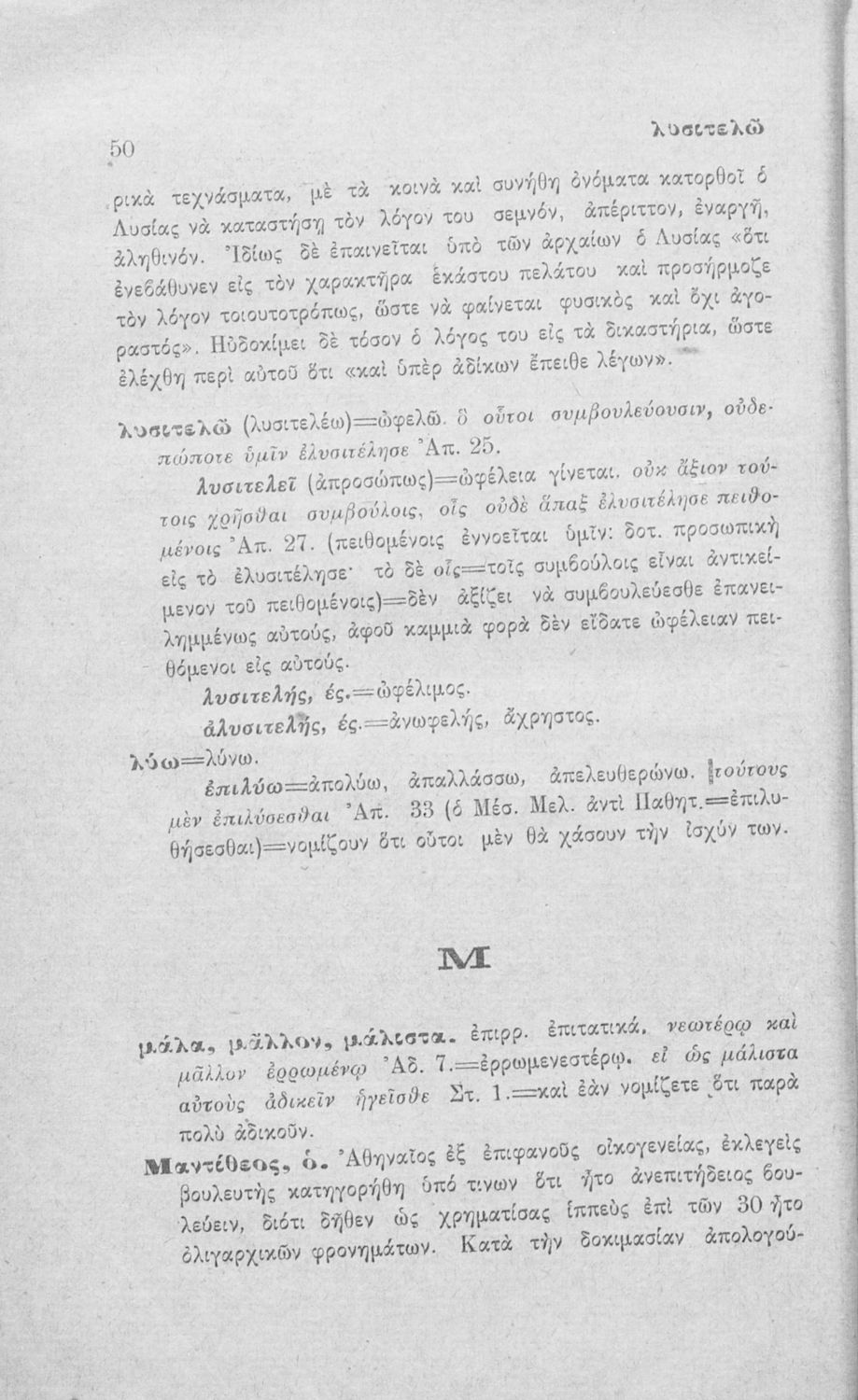 Σχολικό εγχειρίδιο Αρχαίων Ελληνικών που περιλαμβάνει τους Λόγους του Λυσία Υπέρ Μαντιθέου, Υπέρ του αδυνάτου, Δήμου καταλύσεως απολογία, Κατά Φίλωνος, Κατά των σιτοπωλών, εκτενές λεξιλόγιο και παράρτημα περί ρητορικής.