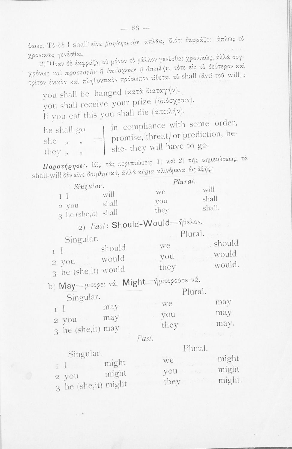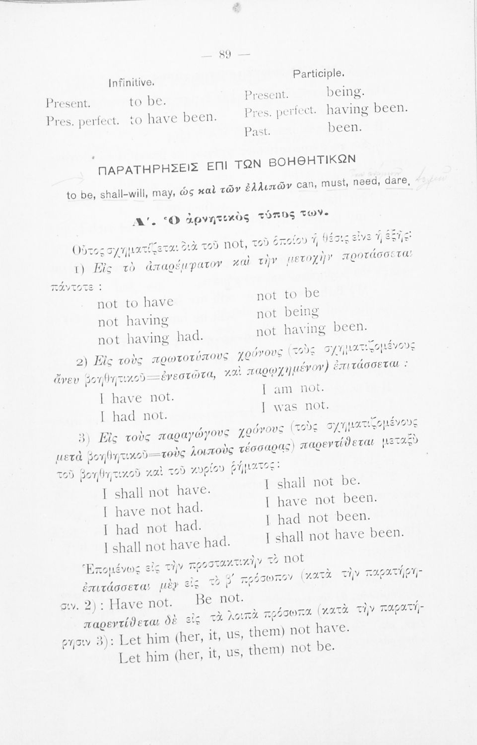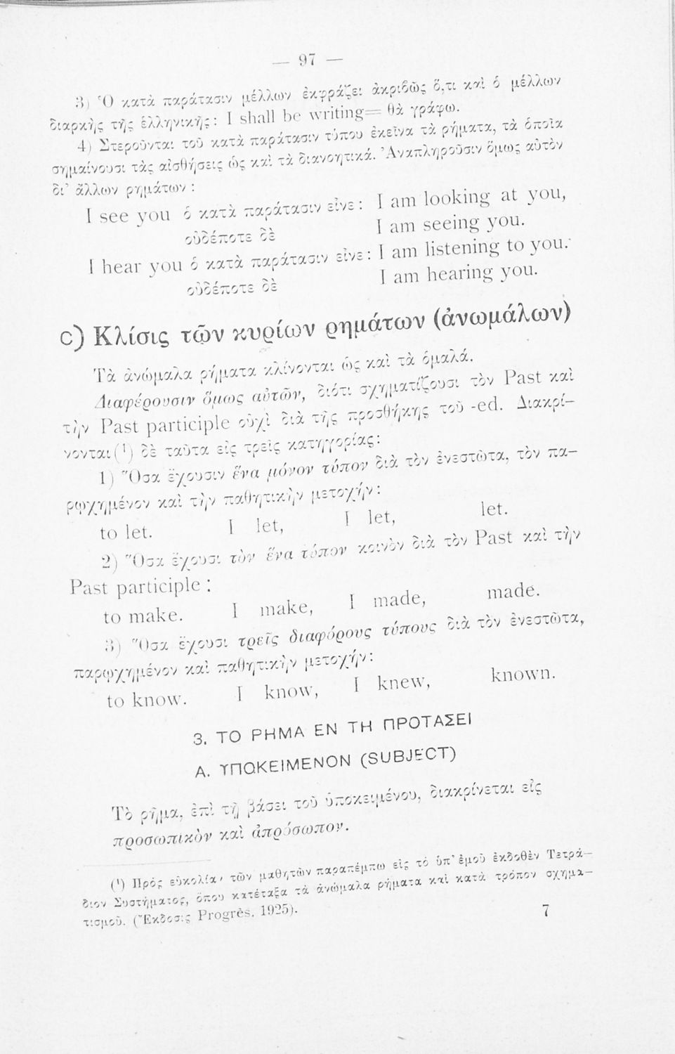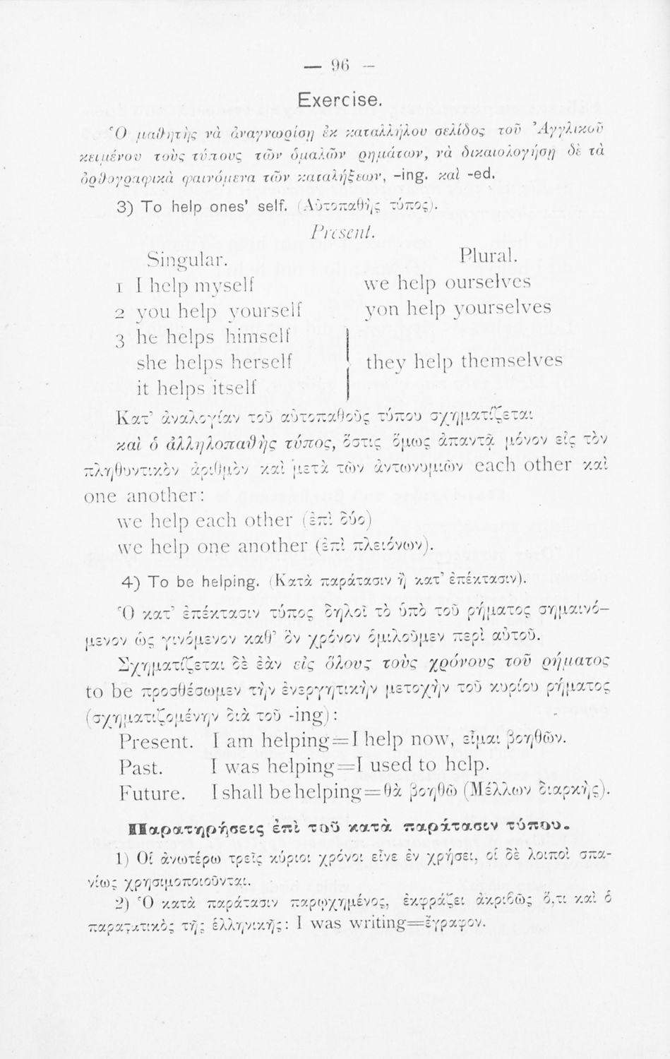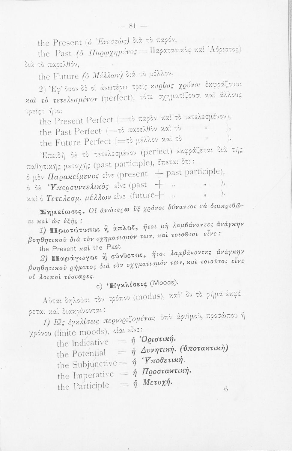 Μαθητικό βοήθημα Αρχαίων Ελληνικών για τα Ελληνικά Σχολεία, Παρθεναγωγεία και Γυμνάσια που περιλαμβάνει γραμματική της αρχαίας ελληνικής και κατάλογο ανωμάλων ρημάτων.
