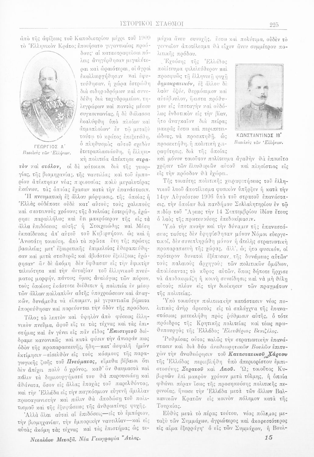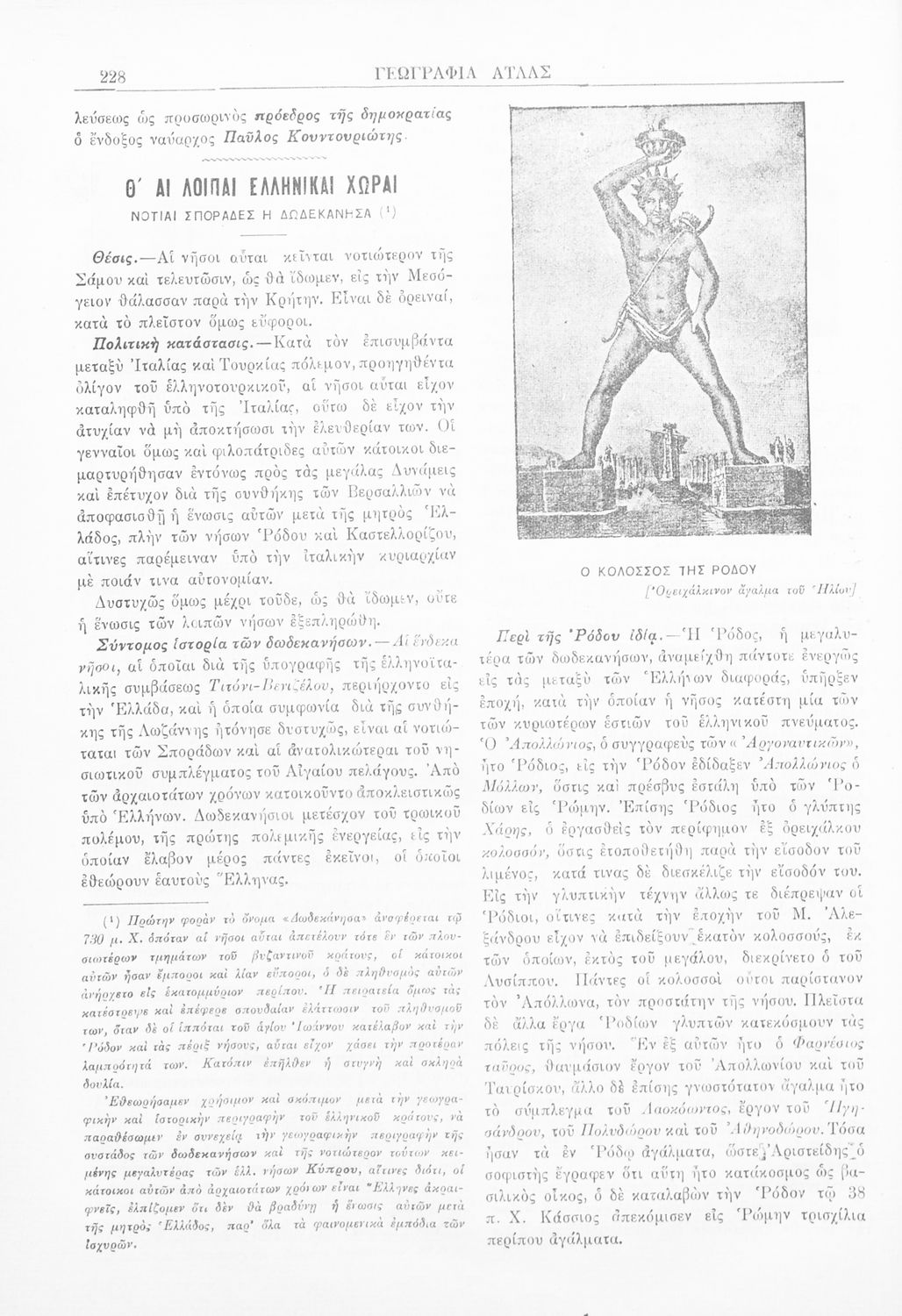 Παρουσίαση περιεχομένου: Σχολικό εγχειρίδιο Γεωγραφίας για τα Ελληνικά Σχολεία, τα Γυμνάσια, τα Διδασκαλεία, τα Παρθεναγωγεία και τις Εμπορικές-Στρατιωτικές-Ναυτικές Σχολές που περιέχει εισαγωγή στην κοσμογραφία, τη μαθηματική, πολιτική, οικονομική και φυσική γεωγραφία, τη γεωλογία, τη ζωολογία και φυτολογία και την ανθρωπογεωγραφία και εξετάζει την Ελλάδα και ενδεικτικές χώρες από τις πέντε ηπείρους από γεωφυσική, πολιτική και οικονομική άποψη. Περιέχει και αναφορά στις "λοιπές ελληνικές χώρες" στις οποίες περιλαμβάνει τα Δωδεκάνησα, την Κύπρο και την Τουρκική Θράκη.